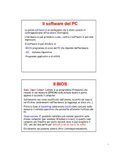 Introduzione al sistema operativo Linux Un po’ di storia Negli anni sessanta i computer, oltre ad essere grandi come ”frigoriferi”, avevano il problema di avere un sistema operativo che variava, in genere, da computer a computer. Il software che girava su un computer non riusciva ad essere lanciato su un altro computer con un differente sistema operativo... Nel 1969 un team dei laboratori Bell Labs si dedicò allo studio della compatibilità del software, sviluppando un sistema operativo semplice ed elegante, scritto in linguaggio di programmazione C, e capace di riutilizzare il codice. 1 Questo progetto prese il nome di UNIX. Con UNIX, il sistema operativo è costruito intorno al kernel (il ”cuore” del computer) e scritto in un linguaggio di programmazione di alto livello, il C, in modo da poter girare su diversi tipi di macchine. Agli inizi degli anni novanta, Linus Torvalds, studente di informatica all’università di Helsinki, pensò di rendere liberamente disponibile e accessibile sui Personal Computers una qualche versione accademica di UNIX, in modo da avere un sistema libero che fosse completamente aderente all’originale UNIX. Nasce in questo modo il sistema operativo Linux. 2 Vantaggi di Linux • Linux è gratuito e libero. Grazie al Software Open Source, un programma può essere letto, distribuito e modificato. Linux si può scaricare da internet in modo gratuito. • Linux è portabile su qualsiasi piattaforma hardware. • Linux è sicuro - perchè si basa sul sistema UNIX. 3 Svantaggi di Linux • Ci sono troppe distribuzioni di Linux - si fa fatica a scegliere la distribuzione più adatta alle proprie esigenze. Tutte sono, comunque, molto simili tra loro. • Linux non è molto facile e può confondere le idee per chi voglia ”giocare” con il sistema operativo. Ma sono stati compiuti talmente tanti progressi che anche chi accede per la prima volta ad un computer con Linux, non si accorge di troppe differenze rispetto ad un computer con MS Windows.... 4 Come connettersi al sistema Per lavorare in un sistema Linux, bisogna avere un nome utente (login) e una password. Per collegarsi, quindi, dobbiamo digitare la login e la password e schiacchiare il tasto di Invio. 5 Multi-utenza/tasking Più utenti possono accedere, contemporaneamente, alla stessa macchina (stesso sistema operativo Linux), utilizzando diversi calcolatori: si parla di multiutenza. Analogamente, più programmi possono essere attivati nello stesso tempo: si parla di multitasking. 6 Connessione Una volta entrati nel sistema, si apre l’ambiente grafico e di qui possiamo lavorare (per esempio, aprire una finestra di editor, lanciare OpenOffice, navigare in Internet ....). 7 Terminal window o shell Per aprire nuove directory (cartelle), per spostare files, per eseguire programmi FORTRAN, ... è bene lavorare tramite una finestra di terminale o shell. 8 Elenco di comandi essenziali La finestra di terminale dovrebbe sempre mostrare il prompt dei comandi alla sua apertura. Un esempio di prompt è la login dell’utente + chiocciola + nome della macchina su cui si sta lavorando + attuale directory di lavoro: mazzia@stein:˜ 1 % Vediamo ora alcuni comandi essenziali (comandi da scrivere dopo il prompt, in una finestra di terminale - dopodichè si schiaccia il tasto di Invio): ls mostra l’elenco dei files e delle directories contenuti nella directory attuale (ls sta per ”list”): Esempio: mazzia@stein:˜ 1 % ls 9 Un volta schiacciato Invio, compare: 5 2 3 3 4 2 4 3 2d_fefv/ 2d_fem/ 2d_femlpg/ 2d_fesupg/ 2d_mhfefv/ 2d_mlpg/ 2d_timesplit/ 2d_tran/ 4 57 1 1 1 6 1 1 coupled-hyb/ prova.pdf didattica/ firma grid.m help_note lavori/ mail/ Per cambiare directory, si deve digitare cd nome-directory (cd sta per ”change directory”). Esempio: per entrare nella directory 2d fefv, scrivo cd 2d fefv. Una volta schiacciato il tasto di Invio, il nuovo 10 prompt mi segnala l’ingresso nella directory: mazzia@stein:˜/2d\_fefv 9 % Il comando cd .. fa tornare nella directory precedente. Per creare una nuova directory: mkdir nomedirectory (mkdir sta per ”make directory”). Per copiare un file da una directory ad un’altra: cp nomefile nomedirectory (cp sta per ”copy”). Per trasferire un file da una directory ad un’altra (o per rinominare un file o una directory): mv nomefile nomedirectory (mv sta per ”move”). Esempio: abbiamo due directory chiamate uno e due e il file prova.f nella directory uno. Vogliamo copiare il file dalla directory uno alla directory due. 11 Se ci troviamo nella home, cioè nell’ambiente di partenza, dobbiamo scrivere cp uno/prova.f due mazzia@stein:˜ 16 % cp uno/prova.f due Se ora passiamo nella directory due e facciamo ls, vedremo il file prova.f mazzia@stein:˜ 17 % cd due mazzia@stein:˜/due 18 % ls total 1 1 prova.f Se siamo nella directory uno, dobbiamo scrivere cp prova.f ../due per ottenere lo stesso risultato. Se siamo nella directory due, dobbiamo scrivere 12 cp ../uno/prova.f . Il punto finale serve per copiare il file prova.f nella directory in cui ci troviamo. Con cp abbiamo due file identici, quello nella directory uno e quello copiato nella directory due. Possiamo anche scrivere cp prova.f prova2.f: in questo modo creiamo il file prova2.f nella stessa directory in cui si trova prova.f. Se vogliamo trasferire il file dalla directory uno alla directory due (in questo modo avremo solo un file alla fine del procedimento), dobbiamo usare il comando mv. Per cancellare un file si usa il comando rm nomefile. Se vogliamo cancellare una directory, dobbiamo prima cancellare tutti i files della directory e poi usare il comando rmdir nomedirectory. 13 Ricapitolando • ls : lista dei files e delle directory • cd : per cambiare directory • mkdir: per creare una nuova directory • cp: per copiare files • mv: per trasferire o rinominare files • rm: per cancellare files • rmdir: per cancellare directories 14 Un editor di testo Se vogliamo scrivere un file - un docume