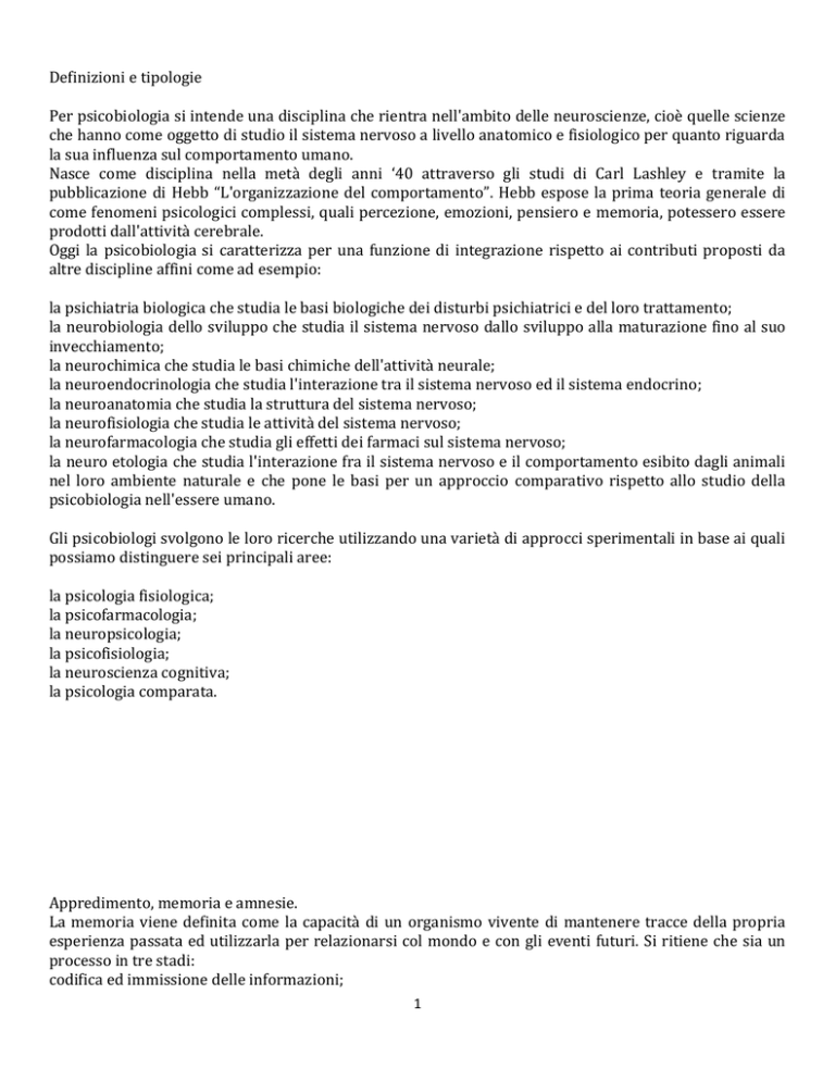 Definizioni e tipologie Per psicobiologia si intende una disciplina che rientra nell'ambito delle neuroscienze, cioè quelle scienze che hanno come oggetto di studio il sistema nervoso a livello anatomico e fisiologico per quanto riguarda la sua influenza sul comportamento umano. Nasce come disciplina nella metà degli anni ‘40 attraverso gli studi di Carl Lashley e tramite la pubblicazione di Hebb “L'organizzazione del comportamento”. Hebb espose la prima teoria generale di come fenomeni psicologici complessi, quali percezione, emozioni, pensiero e memoria, potessero essere prodotti dall'attività cerebrale. Oggi la psicobiologia si caratterizza per una funzione di integrazione rispetto ai contributi proposti da altre discipline affini come ad esempio: la psichiatria biologica che studia le basi biologiche dei disturbi psichiatrici e del loro trattamento; la neurobiologia dello sviluppo che studia il sistema nervoso dallo sviluppo alla maturazione fino al suo invecchiamento; la neurochimica che studia le basi chimiche dell'attività neurale; la neuroendocrinologia che studia l'interazione tra il sistema nervoso ed il sistema endocrino; la neuroanatomia che studia la struttura del sistema nervoso; la neurofisiologia che studia le attività del sistema nervoso; la neurofarmacologia che studia gli effetti dei farmaci sul sistema nervoso; la neuro etologia che studia l'interazione fra il sistema nervoso e il comportamento esibito dagli animali nel loro ambiente naturale e che pone le basi per un approccio comparativo rispetto allo studio della psicobiologia nell'essere umano. Gli psicobiologi svolgono le loro ricerche utilizzando una varietà di approcci sperimentali in base ai quali possiamo distinguere sei principali aree: la psicologia fisiologica; la psicofarmacologia; la neuropsicologia; la psicofisiologia; la neuroscienza cognitiva; la psicologia comparata. Appredimento, memoria e amnesie. La memoria viene definita come la capacità di un organismo vivente di mantenere tracce della propria esperienza passata ed utilizzarla per relazionarsi col mondo e con gli eventi futuri. Si ritiene che sia un processo in tre stadi: codifica ed immissione delle informazioni; 1 memorizzazione e consolidamento delle informazioni; recupero delle informazioni. Viene definito come ricordo la funzione in cui si esprime la memoria, mentre si definisce oblio la diminuzione o la scomparsa del ricordo. L’oblio è spesso dovuto ad un naturale deterioramento fisiologico e psicologico e va distinto dalla amnesia che invece è una riduzione più o meno grave non del ricordo ma della capacità di ricordare. Ha una causa patologica che può essere organica, come, ad esempio, un trauma cranico, o psicogena, come un evento traumatico a livello psicologico che può determinare una amnesia come difesa rispetto al dolore associato al ricordo. Si può distinguere l’amnesia in: anterograda, ovvero la perdita di memoria per gli avvenimenti successivi all’evento che l’ha prodotta; retrograda, ovvero la perdita di memoria per gli avvenimenti antecedenti all’evento che l’ha prodotta. Si distingue in: retrograda con gradiente temporale (deficit del II stadio del processo di memoria, cioè della memorizzazione); retrograda senza gradiente temporale (deficit del III stadio del processo di memoria, ovvero il recupero delle informazioni). Per quanto riguarda gli studi sulla memoria e sui suoi fondamenti biologici vi sono due teorie principali: la teoria di Carl Lashley e la teoria di Hebb. La teoria di Lashley è stata formulata nell’ambito di studi sulla localizzazione neurali degli engrammi, ovvero modificazioni cerebrali responsabili dell’immagazzinamento in memoria. Gli studi di Lashley che consistevano nell’addestrare animali da laboratorio, nel far eseguire loro compiti di apprendimento abbastanza complessi, per poi asportare o lesionare parti di cervello cancellando la memoria di questi apprendimenti. Sulla base dei risultati ottenuti Lashley concluse che si potevano affermare due principi: il principio dell’azione di massa, secondo cui le memorie di compiti complessi sono immagazzinate diffusamente nella neocorteccia; il principio della equipotenzialità, secondo cui tutte le parti della neocorteccia giocano lo stesso ruolo nell’immagazzinamento delle informazioni e delle memorie di compiti complessi. Lashley ammetteva che alcune parti avevano ruoli più importanti nell’immagazzinare tipi diversi di memoria, per esempio, la corteccia visiva poteva avere un ruolo fondamentale nel conservare informazioni visive, però sosteneva anche che le memorie erano immagazzinate in maniera diffusa e uguale nelle diverse aree funzionali. La teoria di Hebb invece si basava sugli studi della memoria a breve e lungo termine. Diverse ricerche avevano infatti suggerito l’ipotesi che una certa informazione venisse conservata temporaneamente in un magazzino a breve termine fino a che non si verificavano delle modificazioni psicologiche che portavano ad un immagazzinamento a lungo termine. Hebb sosteneva che la funzionalità della memoria a breve termine è mediata da una attività riverberante, cioè un’attività che si ripete in circuiti neurali chiusi eccitati solo da un evento in particolare. Questa produce modificazioni strutturali nelle sinapsi che successivamente portano ad una facilitazione sinaptica, cioè facilitano il verificarsi del pattern di attività. Le basi neurali della memoria, dell’oblio e dell’amnesia sono state studiate soprattutto attraverso esperienze di interventi neurochirurgici di un paziente indicato solo con le sue iniziali : H.M. Questo paziente è stato sottoposto alla lobectomia temporale mediale bilaterale, quindi all’asportazione della parte mediale dei lobi temporali di entrambe le parti mostrando poi i sintomi di una amnesia anterograda e impossibilità di formare nuove memorie a lungo termine.Gli studi effettuati su questa persona hanno portato ad individuare le basi n