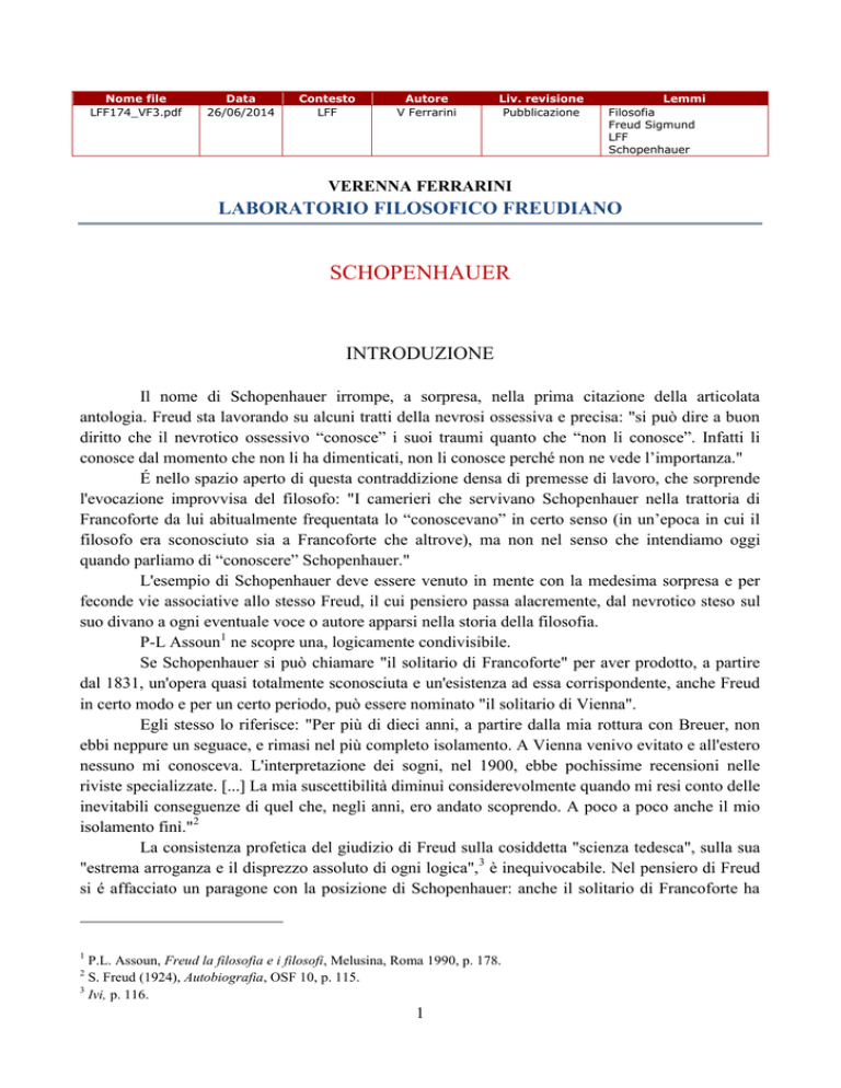 Nome file LFF174_VF3.pdf Data 26/06/2014 Contesto LFF Autore V Ferrarini Liv. revisione Pubblicazione Lemmi Filosofia Freud Sigmund LFF Schopenhauer VERENNA FERRARINI LABORATORIO FILOSOFICO FREUDIANO SCHOPENHAUER INTRODUZIONE Il nome di Schopenhauer irrompe, a sorpresa, nella prima citazione della articolata antologia. Freud sta lavorando su alcuni tratti della nevrosi ossessiva e precisa: "si può dire a buon diritto che il nevrotico ossessivo “conosce” i suoi traumi quanto che “non li conosce”. Infatti li conosce dal momento che non li ha dimenticati, non li conosce perché non ne vede l’importanza." É nello spazio aperto di questa contraddizione densa di premesse di lavoro, che sorprende l'evocazione improvvisa del filosofo: "I camerieri che servivano Schopenhauer nella trattoria di Francoforte da lui abitualmente frequentata lo “conoscevano” in certo senso (in un’epoca in cui il filosofo era sconosciuto sia a Francoforte che altrove), ma non nel senso che intendiamo oggi quando parliamo di “conoscere” Schopenhauer." L'esempio di Schopenhauer deve essere venuto in mente con la medesima sorpresa e per feconde vie associative allo stesso Freud, il cui pensiero passa alacremente, dal nevrotico steso sul suo divano a ogni eventuale voce o autore apparsi nella storia della filosofia. P-L Assoun1 ne scopre una, logicamente condivisibile. Se Schopenhauer si può chiamare "il solitario di Francoforte" per aver prodotto, a partire dal 1831, un'opera quasi totalmente sconosciuta e un'esistenza ad essa corrispondente, anche Freud in certo modo e per un certo periodo, può essere nominato "il solitario di Vienna". Egli stesso lo riferisce: "Per più di dieci anni, a partire dalla mia rottura con Breuer, non ebbi neppure un seguace, e rimasi nel più completo isolamento. A Vienna venivo evitato e all'estero nessuno mi conosceva. L'interpretazione dei sogni, nel 1900, ebbe pochissime recensioni nelle riviste specializzate. [...] La mia suscettibilità diminuì considerevolmente quando mi resi conto delle inevitabili conseguenze di quel che, negli anni, ero andato scoprendo. A poco a poco anche il mio isolamento finì."2 La consistenza profetica del giudizio di Freud sulla cosiddetta "scienza tedesca", sulla sua "estrema arroganza e il disprezzo assoluto di ogni logica",3 è inequivocabile. Nel pensiero di Freud si é affacciato un paragone con la posizione di Schopenhauer: anche il solitario di Francoforte ha 1 P.L. Assoun, Freud la filosofia e i filosofi, Melusina, Roma 1990, p. 178. S. Freud (1924), Autobiografia, OSF 10, p. 115. 3 Ivi, p. 116. 2 1 polemizzato con l'Università e i filosofi del suo tempo; é stato l'avversario dell'idealismo tedesco, della "vacuità” di Fichte e della “ciarlataneria” di Hegel, pur aderendo alla versione empiristica e anglosassone dell'idealismo, quella che ha in Berkeley il più autorevole rappresentante. A più riprese Freud dichiara di aver letto Schopenhauer, anche se molto tardi e sovente controvoglia. Annota di aver affrontato questioni poste autorevolmente dal filosofo, ma di aver concluso su quelle più rilevanti in modo totalmente diverso. É con pieno compiacimento intellettuale, senza la difesa di una pretesa priorità che Freud riconosce a Schopenhauer di aver pensato la rimozione: "Sono certo di aver elaborato autonomamente la teoria della rimozione; non so di alcuna fonte che mi abbia influenzato e avvicinato ad essa, e per lungo tempo ho ritenuto che si trattasse di una concezione originale fino a quando Rank ha segnalato il passo del Mondo come volontà e rappresentazione di Schopenhauer ove il filosofo tenta una spiegazione della follia. Ciò che là è detto circa la riluttanza ad accettare ciò che della realtà risulta penoso, coincide così perfettamente con il contenuto del mio concetto di rimozione, che ancora una volta ho potuto ringraziare le lacune della mia cultura che mi avevano permesso di fare una scoperta." La questione della morte é rilevante nel lavoro di pensiero di Freud e, attraversando le sue dichiarazioni, tre sono i momenti nei quali esso si incontra con la filosofia di Schopenhauer. L'osservazione sulle azioni primarie dell'ossessivo, lo porta a scoprirne la loro "natura magica, contro presagi di sventura che hanno come contenuto la morte": é a questo preciso punto che sovviene al pensiero di Freud l'asserzione del filosofo di Francoforte, secondo il quale il problema della morte é all'inizio di ogni filosofia, così come è, in qualche modo, centrale nella filosofia del nevrotico ossessivo. Qualche anno dopo, in una confidenziale lettera a Lou Salomé, egli confessa all'amica di essere preso dal tema della morte, insieme a una singolare idea delle pulsioni; per questo, per la prima volta dichiara di leggere Schopenhauer ma di non farlo volentieri. Nel complesso testo Al di là del principio di piacere prende forma quella "singolare idea delle pulsioni" anticipata nella lettera. La dottrina delle pulsioni precedentemente elaborata e riordinata nelle Precisazioni sui due principi dell'accadere psichico trova un completamento; nella vita psichica sembra agire una tendenza alla ripetizione, una "coazione a ripetere" che opera in modo indipendente dal principio di piacere e "al di là di esso". Freud é costretto a riconoscere, soprattutto in ragione della "lunga paziente e spregiudicata ricerca analitica", che esiste una potenza distruttiva, un principio che mira a ricondurre l’irrequietezza vitale alla stabilità, "perfetta a modo suo", dello stato inorganico. La legge di moto o pulsione, nel suo perficere verso una meta concludente é ostacolata da una forza che tende alla morte della pulsione stessa. Morte? Per Schopenhauer é "il vero e proprio risultato, e, come tale, lo scopo della vita"; il suo comptentus mundi la denuncia che il mondo intessuto delle trame del dispotismo della Volontà. ssa, come cosa-in sé "un'istanza trascendente impersonale, vitalità metafisica, potenza prorompente, 