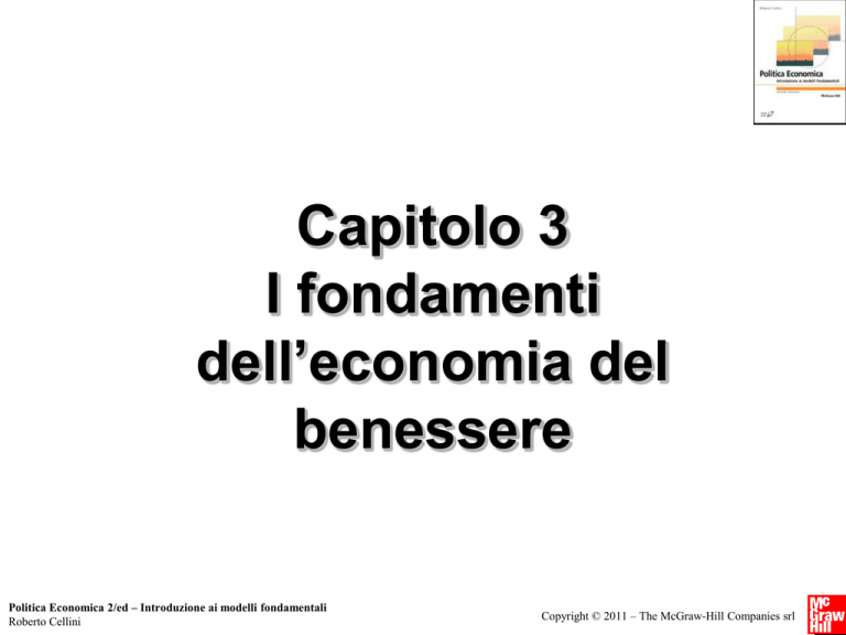 Capitolo 3 I fondamenti dell’economia del benessere Politica Economica 2/ed – Introduzione ai modelli fondamentali Roberto Cellini Copyright © 2011 – The McGraw-Hill Companies srl L’economia del benessere • L'economia del benessere (in inglese, welfareeconomics) è la branca della scienza economica che si occupa di fornire criteri per valutare socialmente (e quindi ordinare) allocazioni alternative. • L'economia del benessere studia anche quali giudizi di valore (ideologici) siano impliciti in ciascun possibile ordinamento sociale di allocazioni diverse. Politica Economica 2/ed – Introduzione ai modelli fondamentali Roberto Cellini Copyright © 2011 – The McGraw-Hill Companies srl Linee di ricerca • 1. La "vecchia economia del benessere" • 2. La "nuova economia del benessere" • 3. La terza linea di studi ritiene che la scelta sociale sia da attribuire all'esito di votazioni, e pertanto dà luogo alla "teoria delle votazioni". • 4. La scuola delle public choices Politica Economica 2/ed – Introduzione ai modelli fondamentali Roberto Cellini Copyright © 2011 – The McGraw-Hill Companies srl Criterio individualista di Pigou SW f U1 ,U 2 ,...,U i ,...U N Politica Economica 2/ed – Introduzione ai modelli fondamentali Roberto Cellini Copyright © 2011 – The McGraw-Hill Companies srl Funzione di benessere sociale di Bentham SW i 1U i U 1 U 2 ... U N N Il benessere della collettività è la somma del benessere dei singoli individui. Politica Economica 2/ed – Introduzione ai modelli fondamentali Roberto Cellini Copyright © 2011 – The McGraw-Hill Companies srl Politica Economica 2/ed – Introduzione ai modelli fondamentali Roberto Cellini Copyright © 2011 – The McGraw-Hill Companies srl Altre diverse forme funzionali possibili per l'equazione dove ai rappresentano "pesi". Questa funzione, nel caso di una società con due individui si riduce all'espressione Oppure: meritano più attenzione (cioè un peso maggiore) le esigenze di quelle persone che stanno "peggio". Politica Economica 2/ed – Introduzione ai modelli fondamentali Roberto Cellini Copyright © 2011 – The McGraw-Hill Companies srl Funzione di benessere sociale di Rawls Politica Economica 2/ed – Introduzione ai modelli fondamentali Roberto Cellini Copyright © 2011 – The McGraw-Hill Companies srl Funzione di benessere sociale alla Nietzsche • Il benessere sociale coincide con l’utilità dell’individuo che sta meglio Politica Economica 2/ed – Introduzione ai modelli fondamentali Roberto Cellini Copyright © 2011 – The McGraw-Hill Companies srl Il criterio paretiano - 1 • Una configurazione X è preferibile ad una configurazione Y, se tutti i soggetti nello stato X stanno almeno non-peggio che nello stato Y, e almeno un soggetto sta strettamente meglio. • Il criterio, evidentemente, si basa sul concetto di ottimo paretiano: un'allocazione, infatti è un ottimo paretiano (o è "Pareto-efficiente"), quando è impossibile trovare un'allocazione differente in cui almeno un individuo stia strettamente meglio e ciascuno degli altri stiano almeno non peggio. • Pertanto, uno stato del mondo S1 sarà un ottimo paretiano rispetto a S2 (e quindi S1 sarà socialmente preferibile a S2, secondo il criterio di Pareto), quando tutti gli individui sono concordi nell'affermare che preferiscono S1 a S2. • La preferenza deve essere stretta per almeno un individuo. • Il criterio paretiano richiede la unanimità di valutazione. Politica Economica 2/ed – Introduzione ai modelli fondamentali Roberto Cellini Copyright © 2011 – The McGraw-Hill Companies srl Il criterio paretiano - 2 • PRO del criterio paretiano: è molto semplice da capire ed applicare. • DIFETTO: conduce ad una soluzione chiara quando i confronti si presentano come ovvi, mentre è inconcludente nei casi più frequenti ed interessanti. • La principale ragione per cui gli economisti sono interessati a valutare la Pareto-efficienza delle allocazioni è però un'altra: esiste una corrispondenza tra gli equilibri concorrenziali e le allocazioni Pareto-efficienti. Politica Economica 2/ed – Introduzione ai modelli fondamentali Roberto Cellini Copyright © 2011 – The McGraw-Hill Companies srl Allocazione di equilibrio economico generale (EEG) • Un'allocazione di equilibrio economico generale è da intendersi come un insieme di prezzi e di quantità domandate e offerte, che soddisfano simultaneamente tutte le seguenti condizioni: – a) ogni consumatore, caratterizzato da una struttura di preferenze e da un insieme di dotazioni date, fronteggia prezzi che assume come dati e domanda quantità dei beni in modo da rendere massima la propria utilità, nel rispetto del vincolo di bilancio; – b) ogni impresa produce beni utilizzando input secondo una tecnologia data; essa fronteggia prezzi che considera dati; essa esprime la domanda di fattori produttivi e la offerta di output in modo da massimizzare i propri profitti, nel rispetto dei vincoli tecnologici; – c) sul mercato di ogni bene si realizza l'equilibrio, cioè la somma delle quantità domande (dati i prezzi) risulta uguale alla somma delle quantità offerte (dati i prezzi). • Una siffatta situazione: – non sempre esiste (problema dell'esistenza dell'equilibrio economico generale), – non sempre è stabile (problema della stabilità dell'equilibrio economico generale), – non sempre è unica (problema dell'unicità). Politica Economica 2/ed – Introduzione ai modelli fondamentali Roberto Cellini Copyright © 2011 – The McGraw-Hill Companies srl Il primo teorema fondamentale dell’economia del benessere Ogni allocazione di equilibrio economico generale di perfetta concorrenza è un ottimo paretiano. Interpretazione politica di questo teorema: difesa del meccanismo di libero mercato, capace, sotto determinate condizioni, di garantire il raggiungimento dell'efficienza paretiana Politica Economica 2/ed – Introduzione ai modelli fondamentali Roberto Cellini Copyr