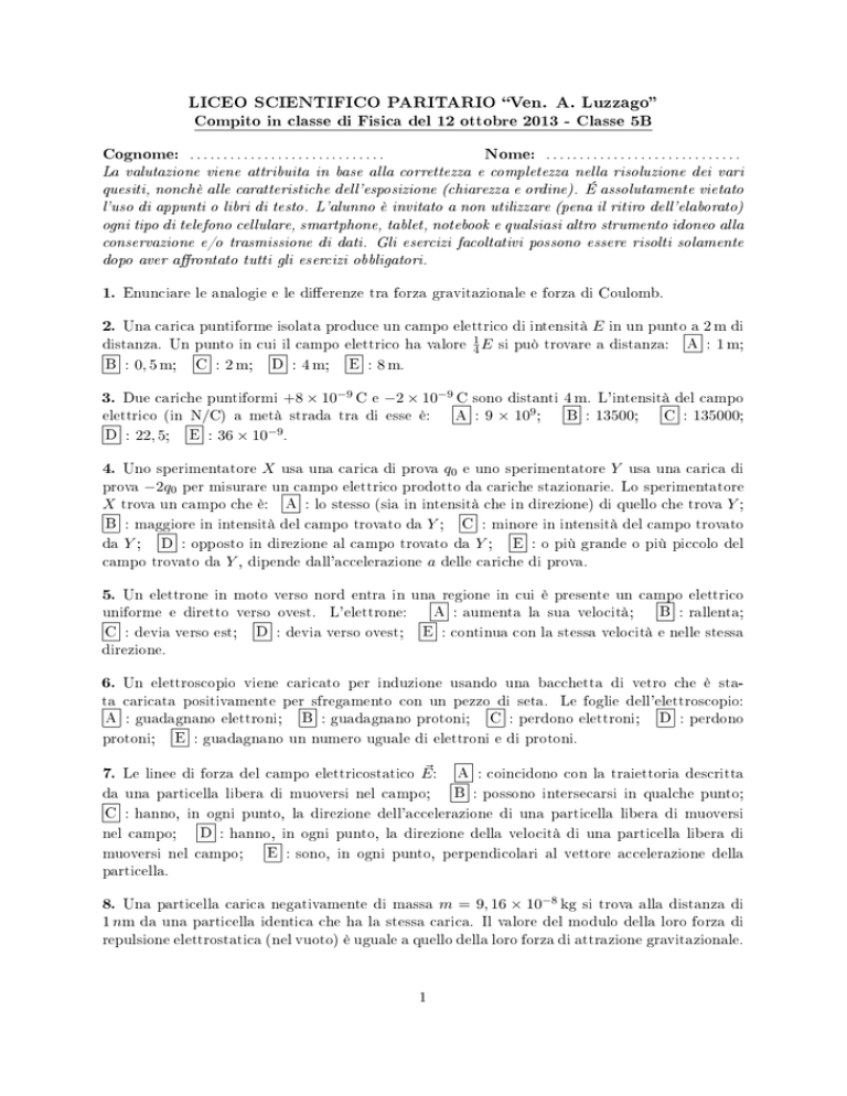 LICEO SCIENTIFICO PARITARIO Ven. A. Luzzago Compito in classe di Fisica del 12 ottobre 2013 - Classe 5B ............................. Nome: . . . . . . . . . . . . . . . . . . . . . . . . . . . . . La valutazione viene attribuita in base alla correttezza e completezza nella risoluzione dei vari quesiti, nonchè alle caratteristiche dell'esposizione (chiarezza e ordine). É assolutamente vietato l'uso di appunti o libri di testo. L'alunno è invitato a non utilizzare (pena il ritiro dell'elaborato) ogni tipo di telefono cellulare, smartphone, tablet, notebook e qualsiasi altro strumento idoneo alla conservazione e/o trasmissione di dati. Gli esercizi facoltativi possono essere risolti solamente dopo aver arontato tutti gli esercizi obbligatori. Cognome: 1. Enunciare le analogie e le dierenze tra forza gravitazionale e forza di Coulomb. Una carica puntiforme isolata produce un campo elettrico di intensità E in un punto a 2 m di distanza. Un punto in cui il campo elettrico ha valore 41 E si può trovare a distanza: A : 1 m; B : 0, 5 m; C : 2 m; D : 4 m; E : 8 m. 2. Due cariche puntiformi +8 × 10−9 C e −2 × 10−9 C sono distanti 4 m. L'intensità del campo elettrico (in N/C) a metà strada tra di esse è: A : 9 × 109 ; B : 13500; C : 135000; D : 22, 5; E : 36 × 10−9 . 3. Uno sperimentatore X usa una carica di prova q0 e uno sperimentatore Y usa una carica di prova −2q0 per misurare un campo elettrico prodotto da cariche stazionarie. Lo sperimentatore X trova un campo che è: A : lo stesso (sia in intensità che in direzione) di quello che trova Y ; B : maggiore in intensità del campo trovato da Y ; C : minore in intensità del campo trovato da Y ; D : opposto in direzione al campo trovato da Y ; E : o più grande o più piccolo del campo trovato da Y , dipende dall'accelerazione a delle cariche di prova. 4. Un elettrone in moto verso nord entra in una regione in cui è presente un campo elettrico uniforme e diretto verso ovest. L'elettrone: A : aumenta la sua velocità; B : rallenta; C : devia verso est; D : devia verso ovest; E : continua con la stessa velocità e nelle stessa direzione. 5. Un elettroscopio viene caricato per induzione usando una bacchetta di vetro che è stata caricata positivamente per sfregamento con un pezzo di seta. Le foglie dell'elettroscopio: A : guadagnano elettroni; B : guadagnano protoni; C : perdono elettroni; D : perdono protoni; E : guadagnano un numero uguale di elettroni e di protoni. 6. ~ : A : coincidono con la traiettoria descritta Le linee di forza del campo elettricostatico E da una particella libera di muoversi nel campo; B : possono intersecarsi in qualche punto; C : hanno, in ogni punto, la direzione dell'accelerazione di una particella libera di muoversi nel campo; D : hanno, in ogni punto, la direzione della velocità di una particella libera di muoversi nel campo; E : sono, in ogni punto, perpendicolari al vettore accelerazione della particella. 7. Una particella carica negativamente di massa m = 9, 16 × 10−8 kg si trova alla distanza di 1 nm da una particella identica che ha la stessa carica. Il valore del modulo della loro forza di repulsione elettrostatica (nel vuoto) è uguale a quello della loro forza di attrazione gravitazionale. 8. 1 Determinare la carica delle due particelle e quanti elettroni sono necessari per ottenere quel valore della carica. Si ricordi che G = 6, 67 × 10−11 N · m2 /kg2 . Due cariche puntiformi q1 e q2 di uguale intensità sono distanti 8, 0 cm. Nel punto medio della congiungente, il loro campo elettrico risultante ha modulo 25 N/C. Determinare l'intensità delle due cariche. 9. Un sistema consiste di due cariche puntiformi positive q1 e q2 con q2 > q1 . La carica totale del sistema è +62 µC e ogni carica risente di una forza elettrostatica di intensità 1, 50 N quando la loro distanza è 0, 270 m. Determinare q1 e q2 . 10. (Facoltativo) 11. (Facoltativo) Una particella di carica 5×10−6 C e massa 20 g si muove alla velocità costante di 7 m/s in un'orbita circolare attorno a una particella ferma, di carica −5×10−6 C. Determinare il raggio r dell'orbita. 2