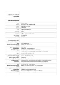 |INFORMAZIONI CURRICOLARI| Informazioni Anagrafiche Nome Cognome Marco Albini Residenza Vocabolo Modanino s.n.c., 01028 Orte (VT) Domicilio (se diverso o in altra città, rispetto al precedente) Telefono 3297714619 Fax E-mail [email protected] Codice Fiscale LBNMRC83H02M082N Nazionalità Italiana Luogo e provincia di nascita Viterbo (VT) Data di Nascita 02/06/1983 Istruzione e Formazione Data 2002 Nome e tipo di istituto di istruzione o formazione Liceo Scientifico Fabio Besta Principali materie / abilità professionali oggetto dello studio Conoscenze scientifiche di natura generale, poi estese nei percorsi successivi, buona base campo umanistico Qualifica conseguita Diploma di Maturità Scientifica Livello nella classificazione nazionale (se pertinente) Data 2010 Nome e tipo di istituto di istruzione o formazione Università degli studi di Roma “La Sapienza” Principali materie / abilità professionali oggetto dello studio Tesi: “Sperimentazione di un algoritmo di Blocking attraverso algoritmo di MapReduce/Hadoop su un Cloud di computer” relatore prof. Scannapiego Principali argomenti trattati durante il percorso di studi concluso, hanno riguardato la Gestione Processi Produttivi, Impiantistica Industriale, Ricerca Operativa, Ottimizzazione nella gestione dei progetti, progetto e ottimizzazione di reti e Progetto e Ottimizzazione di Reti. Nel campo economico si è toccato i settori dell’ Economia e Organizzazione Aziendale, Gestione Aziendale e Economia delle Imprese e delle Organizzazioni. Nel settore della comunicazione Progettazione del Software Telecomunicazioni e informatica. Parte di logica attraverso studi dei Modelli e Algoritmi della Logistica. Di rilevanza settori elettrico elettronico e automazione. Qualifica conseguita Dottore in Ingegneria Gestionale Livello nella classificazione nazionale (se pertinente) Laurea Data 2010 Nome e tipo di istituto di istruzione o formazione Master Qualità : Esperti in qualità, qualità ambientale e sistemi di gestione aziendale Organizzato UNIORM in collaborazione ANGQ certificato rilasciato CEPAS Principali materie / abilità professionali oggetto dello studio Nel percorso si studi si è analizzato i Sistemi Di Gestione Aziendale, Ambientale Sicurezza , Auditor ;norma UNI EN ISO serie 9000, 17000, EN 45000, UNI EN ISO serie 14000 , Basilea, EMAS, SA 8000 , BS OHAS 18001, UNI EN ISO 19011, linee guida serie 10000, ISO serie 22000, ISO serie 27000 Qualifica conseguita - Attestato master quality - Attestato progettista e valutatore sistemi qualita’ - Attestato corso angq per auditor/responsabili gruppo di audit di sistemi di gestione per la qualità qualificato cepas - Attestato progettista e valutatore sistemi ambiente qualificato angq - Attestato operatore ets (emission trading scheme) - Attestato consulente progettista sistemi sicurezza (rspp e rls) qualificato angq - Attestato consulente privacy - Attestato valutatore sistemista sa 8000 - Attestato progettista e valutatore sistemi di gestione dei rischi - Auditor/responsabili gruppo di audit di sistemi di gestione per la qualità certificato cepas Livello nella classificazione nazionale (se pertinente) Master primo livello Data 17/01/2011 Nome e tipo di istituto di istruzione o formazione Seminario Mobility Manager Principali materie / abilità professionali oggetto dello studio Leggi e normativa, progettazione e sviluppo PAN, metodologie di progettazione e alternative logistiche inerenti la mobilità Qualifica conseguita ATTESTATO Mobility Manager Livello nella classificazione nazionale (se pertinente) Data 18/01/2011 Nome e tipo di istituto di istruzione o formazione Seminario Green Public Procurement Principali materie / abilità professionali oggetto dello studio Leggi e normativa, progettazione e sviluppo acquisiti verdi , metodologie di progettazione e alternative logistiche inerenti gli approvvigionamenti Qualifica conseguita ATTESTATO Green Public Procurement Livello nella classificazione nazionale (se pertinente) Data 18/01/2011 Nome e tipo di istituto di Seminario Cost Reduction istruzione o formazione Principali materie / abilità professionali oggetto dello studio Metodologie di progettazione, alternative logistiche e principali tecniche inerenti la riduzione dei costi con particolare interesse alle possibilità di effettuare tali azioni con l’ausilio di tecniche orientate all’ambiente Esperienze Lavorative Data (da – a) Contemporaneo a percorso di studi liceali e universitari Nome e indirizzo datore di lavoro Piccole società locali Tipo di Azienda o settore Operatore nel settore legname, Settore terziario servizi e addetto alla clientela Tipo di impiego Relazioni al pubblico Principali mansioni e responsabilità Responsabile di cassa, Responsabile macchinari Data (da – a) 01/07/2008-30/09/2008 Nome e indirizzo datore di lavoro Cremonini s.p.a. Modena (stabile Roma Termini) Tipo di Azienda o settore Settore terziario servizi e addetto alla clientela Tipo di impiego Relazioni al pubblico Principali mansioni e responsabilità Responsabile di cassa Data (da – a) 01/07/2009 - oggi Nome e indirizzo datore di lavoro Gi.Ga. Bar Tortorelli , Piazzale XXIII Aprile, 01028 Orte (VT) Tipo di Azienda o settore Settore terziario servizi e addetto alla clientela Tipo di impiego Relazioni al pubblico Principali mansioni e responsabilità Responsabile di cassa Data (da – a) 22/12/2010-31/01/2011 Nome e indirizzo datore di lavoro Associazione Compagnia del Sapere Tipo di Azienda o settore Organismo di formazione e consulenza Tipo di impiego Relazioni settore progettazione Principali mansioni e responsabilità Progettista di Sistemi di gestione aziendale integrata Qualità, Ambiente, Sicurezza Data (da – a) 01/02/2011 – 31/01/2012 Nome e indirizzo datore di lavoro Alcantara s.p.a. , Via Strada di Vagno 13, 05035 Nera Montoro (TR) Tipo di Azienda o settore Azienda chimico-tessile Tipo di impiego Unità addetto Sicurezza e Ambiente. Principali mansioni e responsabilità