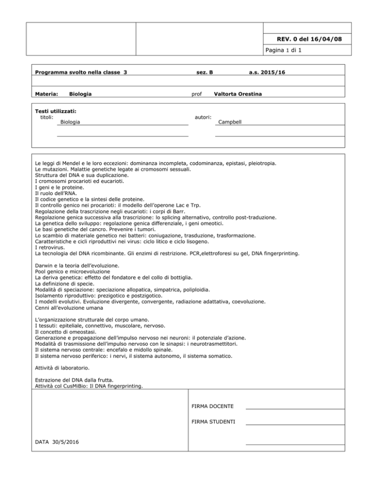 REV. 0 del 16/04/08 Pagina 1 di 1 Programma svolto nella classe 3 Materia: Biologia Testi utilizzati: titoli: Biologia sez. B prof autori: a.s. 2015/16 Valtorta Orestina Campbell Le leggi di Mendel e le loro eccezioni: dominanza incompleta, codominanza, epistasi, pleiotropia. Le mutazioni. Malattie genetiche legate ai cromosomi sessuali. Struttura del DNA e sua duplicazione. I cromosomi procarioti ed eucarioti. I geni e le proteine. Il ruolo dell’RNA. Il codice genetico e la sintesi delle proteine. Il controllo genico nei procarioti: il modello dell’operone Lac e Trp. Regolazione della trascrizione negli eucarioti: i corpi di Barr. Regolazione genica successiva alla trascrizione: lo splicing alternativo, controllo post-traduzione. La genetica dello sviluppo: regolazione genica differenziale, i geni omeotici. Le basi genetiche del cancro. Prevenire i tumori. Lo scambio di materiale genetico nei batteri: coniugazione, trasduzione, trasformazione. Caratteristiche e cicli riproduttivi nei virus: ciclo litico e ciclo lisogeno. I retrovirus. La tecnologia del DNA ricombinante. Gli enzimi di restrizione. PCR,elettroforesi su gel, DNA fingerprinting. Darwin e la teoria dell’evoluzione. Pool genico e microevoluzione La deriva genetica: effetto del fondatore e del collo di bottiglia. La definizione di specie. Modalità di speciazione: speciazione allopatica, simpatrica, poliploidia. Isolamento riproduttivo: prezigotico e postzigotico. I modelli evolutivi. Evoluzione divergente, convergente, radiazione adattativa, coevoluzione. Cenni all’evoluzione umana L’organizzazione strutturale del corpo umano. I tessuti: epiteliale, connettivo, muscolare, nervoso. Il concetto di omeostasi. Generazione e propagazione dell’impulso nervoso nei neuroni: il potenziale d’azione. Modalità di trasmissione dell’impulso nervoso con le sinapsi: i neurotrasmettitori. Il sistema nervoso centrale: encefalo e midollo spinale. Il sistema nervoso periferico: i nervi, il sistema autonomo, il sistema somatico. Attività di laboratorio. Estrazione del DNA dalla frutta. Attività col CusMiBio: Il DNA fingerprinting. FIRMA DOCENTE FIRMA STUDENTI DATA 30/5/2016 REV. 0 del 16/04/08 Pagina 2 di 1