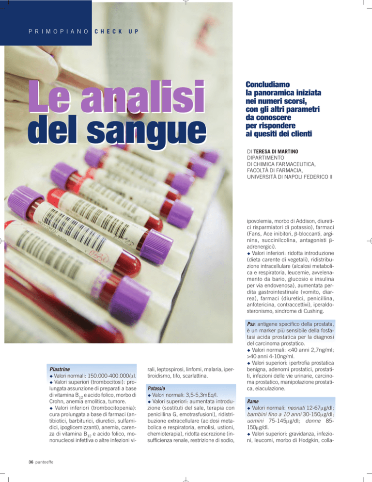P R I M O P I A N O C H E C K U P Le analisi del sangue Concludiamo la panoramica iniziata nei numeri scorsi, con gli altri parametri da conoscere per rispondere ai quesiti dei clienti DI TERESA DI MARTINO DIPARTIMENTO DI CHIMICA FARMACEUTICA, FACOLTÀ DI FARMACIA, UNIVERSITÀ DI NAPOLI FEDERICO II ipovolemia, morbo di Addison, diuretici risparmiatori di potassio), farmaci (Fans, Ace inibitori, b-bloccanti, arginina, succinilcolina, antagonisti badrenergici). Valori inferiori: ridotta introduzione (dieta carente di vegetali), ridistribuzione intracellulare (alcalosi metabolica e respiratoria, leucemie, avvelenamento da bario, glucosio e insulina per via endovenosa), aumentata perdita gastrointestinale (vomito, diarrea), farmaci (diuretici, penicillina, anfotericina, contraccettivi), iperaldosteronismo, sindrome di Cushing. Piastrine Valori normali: 150.000-400.000/ml. Valori superiori (trombocitosi): prolungata assunzione di preparati a base di vitamina B12 e acido folico, morbo di Crohn, anemia emolitica, tumore. Valori inferiori (trombocitopenia): cura prolungata a base di farmaci (antibiotici, barbiturici, diuretici, sulfamidici, ipoglicemizzanti), anemia, carenza di vitamina B12 e acido folico, mononucleosi infettiva o altre infezioni vi- 36 puntoeffe rali, leptospirosi, linfomi, malaria, ipertiroidismo, tifo, scarlattina. Potassio Valori normali: 3,5-5,3mEq/l. Valori superiori: aumentata introduzione (sostituti del sale, terapia con penicillina G, emotrasfusioni), ridistribuzione extracellulare (acidosi metabolica e respiratoria, emolisi, ustioni, chemioterapia), ridotta escrezione (insufficienza renale, restrizione di sodio, Psa: antigene specifico della prostata, è un marker più sensibile della fosfatasi acida prostatica per la diagnosi del carcinoma prostatico. Valori normali: <40 anni 2,7ng/ml; >40 anni 4-10ng/ml. Valori superiori: ipertrofia prostatica benigna, adenomi prostatici, prostatiti, infezioni delle vie urinarie, carcinoma prostatico, manipolazione prostatica, eiaculazione. Rame Valori normali: neonati 12-67mg/dl; bambini fino a 10 anni 30-150mg/dl; uomini 75-145mg/dl; donne 85150mg/dl. Valori superiori: gravidanza, infezioni, leucomi, morbo di Hodgkin, colla- P R I M O P I A N O genopatie, neoplasie maligne, contraccettivi ed estrogeni. Valori inferiori: deficit nutrizionali, malattia di Wilson, disprotidemia, morbo celiaco, ustioni, anemia sideropenica dell’infanzia. Sodio Valori normali: 135-145mEq/l. Valori superiori: aumentate perdite idriche non compensate (trauma, chirurgia, sudorazione, diabete insipido, diuresi osmotica, mannitolo, glicosuria, diuretici), assunzione in eccesso di sodio con limitata assunzione di acqua (soluzioni ipertoniche, somministrazione di bicarbonato), malattie endocrine. Valori inferiori: osmolalità sierica normale, ipoosmolalità con aumento della volemia (cirrosi epatica, insufficienza cardiaca e renale), ipoosmolalità con diminuzione della volemia (diuretici, vomito, diarrea), ipoosmolalità con normale volemia (polidipsia, restrizione dietetica di sali e proteine, assunzione abnorme di birra, Fans, eparina, triciclici, vasopressina, aloperidolo, captopril). Testosterone Valori normali: uomo adulto 512ng/ml; donna adulta 0,1-1,2ng/ml. Valori superiori: iperplasia surrenale, neoplasie dell’ovaio, del surrene, del testicolo, sindrome di Stein-Leventhal, attività fisica e sessuale, uso di androgeni, farmaci (contraccettivi, barbiturici, anticonvulsivi). Valori inferiori: cardiopatie congenite, castrazione, insufficienza epatica e renale cronica, ipogonadismo maschile, ipotiroidismo, irradiazioni, mongolismo, obesità, parotite, sindrome di Klinefelter, sindrome di Turner, uso di estrogeni, farmaci (diossina, steroidi, ketoconazolo, spironolattone, desametasone, fenotiazide). Transaminasi AST e ALT Valori normali: uomini AST 1045U/l, ALT 10-40 U/l; donne AST 5-30 U/l; ALT 5-35U/l. Valori superiori: epatiti virali acute, ischemia epatica, farmaci (isoniazide, rifampicina, alfa-metildopa, antiMao), alcolismo, miositi, infarto, mononucleosi, obesità, cerebropatie. Valori inferiori: gravidanza, chetoacidosi diabetica, emodialisi, uremia, carcinoma primitivo epatico. Transferrina Valori normali: 250-400mcg/100ml. Valori superiori: mancanza di ferro, gravidanza, epatiti virali. Valori inferiori: nefrosi, insufficienza renale cronica, atransferrinemia congenita. Trigliceridi: insieme all’aumento del colesterolo, l’innalzamento dei trigliceridi costituisce un fattore di rischio perché danneggia le arterie. I valori sono molto influenzabili dall’alimentazione precedente al prelievo; se si mangiano cibi grassi nei giorni che precedono l’esame, è possibile che il loro livello si alzi; anche l’alcol sortisce questo effetto. Valori normali: da neonati fino a 5 anni maschi 30-86mg/100ml, femmine 32-99mg/100 ml; bambini 6-11 anni maschi 31-108mg/100ml, femmine 35-114mg/100ml; ragazzi 1215 anni maschi 36-138mg/100ml, femmine 41-138mg/100ml; ragazzi 16-19 anni maschi 40-163mg/100ml, femmine 40-128mg/100ml; adulti maschi 50-170mg/100ml, femmine 40-152mg/100ml. Valori superiori: alcolismo, diabete mellito, epatopatia, insufficienza renale, ipotiroidismo, obesità, pancreatite acuta. Valori inferiori: anemia, contraccettivi orali, gravidanza, ipertiroidismo, digiuno prolungato, senilità. Ves (indice di Katz): rappresenta la velocità di eritrosedimentazione, cioè il tempo impiegato dai globuli rossi a sedimentare. Valori normali: uomini 3-10mm (1h), 5-18mm (2h) e sopra i 50 anni fino a 20mm in 2h; donne 6-11mm (1h), 620mm (2h) e sopra i 50 anni fino a 30mm in 2h. Non si tratta di valori molto precisi in quanto la Ves può essere normale anche se l’infezione è già in atto, oppure può essere elevata quando ormai si è già guariti, pertanto C H E C K U P è un indice aspecifico che deve essere interpretato in funzione del contesto clinico. Valori estremamente elevati, > 90100mm: mieloma multiplo, leucemie, linfomi, carcinoma della