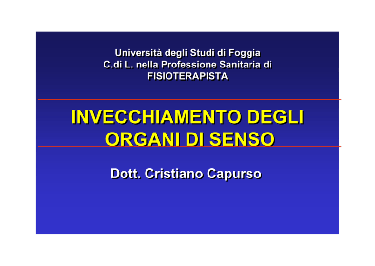 Università Università degli degli Studi Studi di di Foggia Foggia C.di C.di L. L. nella nella Professione Professione Sanitaria Sanitaria di di FISIOTERAPISTA FISIOTERAPISTA INVECCHIAMENTO DEGLI ORGANI DI SENSO Dott. Cristiano Capurso OCCHIO “INVECCHIAMENTO DI ORGANI ED APPARATI” CRISTALLINO: CRISTALLINO: Addensamento Addensamento Centrale: Centrale: Accumulo Accumulo di di fibre fibre (Collagene (Collagene ee Fibrina) Fibrina) Pigmento Pigmento Giallastro: Giallastro: Foto-ossidazione Foto-ossidazione del del Triptofano Triptofano Opacamento Opacamento del del cristallino cristallino (Cataratta): (Cataratta): Precipitazione Precipitazione di di materiale materiale proteico proteico VITREO: VITREO: Riduzione Riduzione di di Volume Volume RETINA: RETINA: Arteriosclerosi Arteriosclerosi Impoverimento Impoverimento dello dello strato strato pigmentato pigmentato Degenerazione Degenerazione maculare maculare CATTEDRA CATTEDRA DI DI GERIATRIA GERIATRIA -- BARI BARI “INVECCHIAMENTO “INVECCHIAMENTO DI DI ORGANI ORGANI ED ED APPARATI” APPARATI” TUTTE TUTTE LE LE MODIFICAZIONI MODIFICAZIONI PRECEDENTI PRECEDENTI CONCORRONO CONCORRONO ?? ACUITA’: ACUITA’: ?? Pupilla Pupilla rigida rigida ee diametro diametro pupillare pupillare Perdita Perdita di di rifrazione rifrazione del del cristallino cristallino ?? diffrazione; diffrazione; Presenza Presenza di di cataratta; cataratta; Impoverimento Impoverimento dei dei neuroni; neuroni; Astigmatismo; Astigmatismo; ?? CAPACITA’ CAPACITA’ DI DI ADATTAMENTO ADATTAMENTO ALLE ALLE MODIFICAZIONI MODIFICAZIONI DI DI LUMINOSITA’ LUMINOSITA’ Giovane: Giovane: 22 min. min. ?? 40 40 min. min. ?? Anziano: Anziano: 40 40 min. min. ?? 20 20 volte volte 240 240 volte volte 20 20 volte volte CATTEDRA CATTEDRA DI DI GERIATRIA GERIATRIA --BARI BARI PRESBIOPIA CATARATTA CENTRALE CATARATTA CORTICALE CENTRALE La La vista vista èè peggiore peggiore alla alla viva viva luce luce del del sole sole oo durante durante la la lettura lettura quando quando la la pupilla pupilla si si restringe restringe CATTEDRA CATTEDRA DI DI GERIATRIA GERIATRIA -- BARI BARI CATARATTA MATURA DOVE L’INTERA LENTE DIVENTA OPACA “INVECCHIAMENTO “INVECCHIAMENTO DI DI ORGANI ORGANI ED ED APPARATI” APPARATI” TUTTE TUTTE LE LE MODIFICAZIONI MODIFICAZIONI PRECEDENTI PRECEDENTI CONCORRONO CONCORRONO ?? ACUITA’: ACUITA’: ?? Pupilla Pupilla rigida rigida ee diametro diametro pupillare pupillare Perdita Perdita di di rifrazione rifrazione del del cristallino cristallino ?? diffrazione; diffrazione; Presenza Presenza di di cataratta; cataratta; Impoverimento Impoverimento dei dei neuroni; neuroni; Astigmatismo; Astigmatismo; ?? CAPACITA’ CAPACITA’ DI DI ADATTAMENTO ADATTAMENTO ALLE ALLE MODIFICAZIONI MODIFICAZIONI DI DI LUMINOSITA’ LUMINOSITA’ Giovane: Giovane: 22 min. min. ?? 40 40 min. min. ?? Anziano: Anziano: 40 40 min. min. ?? 20 20 volte volte 240 240 volte volte 20 20 volte volte CATTEDRA CATTEDRA DI DI GERIATRIA GERIATRIA --BARI BARI “INVECCHIAMENTO “INVECCHIAMENTO DI DI ORGANI ORGANI ED ED APPARATI” APPARATI” ? ADATTAMENTO: PASSAGGIO DA AMBIENTE ESTERNO AD AMBIENTE INTERNO ? ABBAGLIAMENTO: PASSAGGIO DA AMBIENTE INTERNO AD AMBIENTE ESTERNO QUESTI FENOMENI DEVONO ESSERE TENUTI PRESENTI NELLA REALIZZAZIONE DI STRUTTURE PER ANZIANI AL FINE DI ASSICURARE CONDIZIONI OTTIMALI DI ILLUMINAZIONE!!! “INVECCHIAMENTO DI ORGANI ED APPARATI” GRASSO GRASSO PERIORBITALE: PERIORBITALE: Atrofico Atrofico PALPEBRE: PALPEBRE: Superiore: Superiore: Inferiore: Inferiore: Ptosi Ptosi Ectropion Ectropion oo Entropion Entropion CONGIUNTIVA: CONGIUNTIVA: Ipotrofica Ipotrofica PUPILLE: PUPILLE: Miotiche Miotiche (? (? Elasticità Elasticità M. M. Costrittore Costrittore della della Pupilla) Pupilla) CAMERA CAMERA ANTERIORE: ANTERIORE: Riduzione Riduzione di di Volume Volume CATTEDRA CATTEDRA DI DI GERIATRIA GERIATRIA -- BARI BARI ECTROPION ECTROPION DELLA DELLA PALPEBRA PALPEBRA INFERIORE INFERIORE DESTRA DESTRA ECTROPION DELLA PALPEBRA INFERIORE SINISTRA CON CHERATITE DA ESPOSIZIONE CATTEDRA CATTEDRA DI DI GERIATRIA GERIATRIA -- BARI BARI ENTROPION (PALPEBRA INFERIORE INTROVERSA) ENTROPION ENTROPION (PALPEBRA (PALPEBRA INFERIORE INFERIORE INTROVERSA) INTROVERSA) CON CON TRICHIASI TRICHIASI (CIGLIA (CIGLIA INTROVERSE) INTROVERSE) CATTEDRA CATTEDRA DI DI GERIATRIA GERIATRIA -- BARI BARI LESIONI LESIONI CONGIUNTIVALI CONGIUNTIVALI LEGATE LEGATE ALL’INVECCHIAMENTO ALL’INVECCHIAMENTO DIAGNOSI DIAGNOSI DIFFERENZIALE DIFFERENZIALE LESIONI LESIONI CONGIUNTIVALI CONGIUNTIVALI PRODUTTIVE PRODUTTIVE PTERIGIO PINGUECOLA XANTELASMA GERONTOXON BLEFARITE CALAZIO DACRIOCISTITE HERPES ZOOSTER