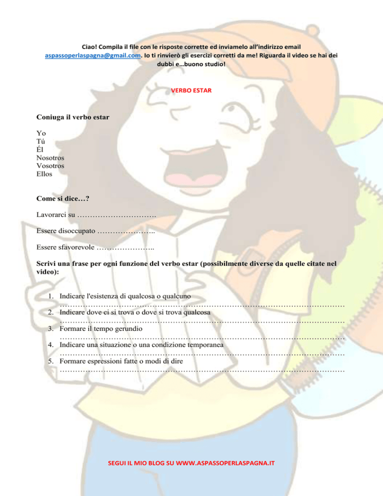 Ciao! Compila il file con le risposte corrette ed inviamelo all’indirizzo email [email protected]. Io ti rinvierò gli esercizi corretti da me! Riguarda il video se hai dei dubbi e…buono studio! VERBO ESTAR Coniuga il verbo estar Yo Tú Él Nosotros Vosotros Ellos Come si dice…? Lavorarci su …………………………. Essere disoccupato ………………….. Essere sfavorevole ………………….. Scrivi una frase per ogni funzione del verbo estar (possibilmente diverse da quelle citate nel video): 1. Indicare l'esistenza di qualcosa o qualcuno ………………………………………………………………………………………………… 2. Indicare dove ci si trova o dove si trova qualcosa ………………………………………………………………………………………………… 3. Formare il tempo gerundio ………………………………………………………………………………………………… 4. Indicare una situazione o una condizione temporanea ………………………………………………………………………………………………… 5. Formare espressioni fatte o modi di dire ………………………………………………………………………………………………… SEGUI IL MIO BLOG SU WWW.ASPASSOPERLASPAGNA.IT