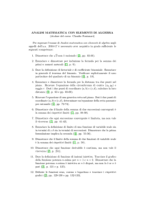 MAT+ NUMERI VERI O NUMERI REALI Prof. Andrea Bacciotti ([email protected]) Esercizio 1 Dimostrare che se N è un intero positivo, allora o N è un quadrato perfetto (cioè esiste un intero positivo K tale che N = K 2 ) oppure √ N è irrazionale. Esercizio 2 Si ricordi che un numero reale α si dice algebrico se è radice di un’equazione algebrica a0 + a1 x + . . . + an x n = 0 a coefficienti interi. Se non è algebrico si dice trascendente. a) Dimostrare che ogni numero razionale è algebrico; b) Dimostrare che se α è un numero trascendente, e r ∈ Q (r 6= 0) allora rα è trascendente. Esercizio 3 Consideriamo R definito a partire da Q col metodo delle successioni di Cauchy. Siano α, β ∈ R e siano {un }, {vn } successioni fondamentali in Q che rappresentano, rispettivamente, α e β. Definiamo somma di α e β in R il numero reale γ rappresentato dalla successione {un + vn }. Dimostrare che tale definizione è coerente, nel senso che dipende dalle classi α e β e non dai particolari rappresentanti scelti. Esercizio 4 Consideriamo ancora R definito a partire da Q col metodo delle successioni di Cauchy, e siano α, β ∈ R. Diciamo che α < β se esistono in Q due successioni fondamentali {un }, {vn } che rappresentano, rispettivamente, α e β per le quali: ∃r∃N : ∀n > N =⇒ un + r < vn Dimostrare che tale relazione < soddisfa la proprietà transitiva. Esercizio 5 Dimostrare che il principio di Eudosso-Archimede segue dal principio di completezza espresso nella forma dell’esistenza del sup. 1