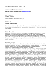 Programma di Chimica Generale ed Inorganica Facoltà di Farmacia - Corso di Laurea in Tecniche Erboristiche A.A. 2011-2012 Docente: Prof. Pio Iannelli Obiettivi del Corso Acquisizione di conoscenze di base per la comprensione dei processi chimici e per la risoluzione di calcoli stechiometrici Acquisizione di conoscenze di base sugli equilibri chimici Acquisizione di conoscenze utili alla fruizione ottimale di corsi chimici a carattere specialistico. Programma d’esame Il modello atomico della materia - La materia - L'atomo - Il peso atomico degli elementi - Le grandezze fondamentali e la mole Il modello strutturale dell'atomo: il nucleo - Le particelle fondamentali della materia - l'elettrone - Il principio di indeterminazione di Heisenberg - Interazione radiazione elettromagnetica-elettrone L'elettrone nell'atomo di idrogeno - II numero quantico di spin - Gli atomi polielettronici e la loro configurazione elettronica - Le proprietà periodiche Stechiometria - Significato quantitativo delle formule - Il numero di ossidazione - Reazioni chimiche Il legame chimico - Il legame covalente - Il legame covalente nelle molecole biatomiche - Le strutture dei composti ionici - Orbitali ibridi - Polarità dei legami - La risonanza - Il legame chimico secondo il metodo dell'orbitale molecolare - L'orbitale molecolare in molecole biatomiche eteronucleari e molecole poliatomiche. Il Legame ionico - La natura del legame ionico - Gli ioni che costituiscono le sostanze ioniche Il legame metallico - I metalli: legame e struttura Il legame debole - Le interazioni di Van der Waals e il legame idrogeno - Le interazioni di Van der Waals Lo stato gassoso e lo stato liquido della materia - Il modello strutturale dello stato gassoso - I gas reali Lo stato liquido - Lo stato vetroso o amorfo - Un modello strutturale dei gas reali: l'equazione di Van der Waals Equilibrio di fase - Le transizioni di stato e i diagrammi di stato per sistemi a un componente - Gli aspetti termodinamici delle transizioni di stato e la trasformazione liquido-gas - La transizione solidogas - La transizione solido-liquido - Entalpie di vaporizzazione, sublimazione e fusione e proprietà strutturali - Diagrammi di stato a un componente - I sistemi a più componenti - Le soluzioni - La dissoluzione di un soluto in un solvente - Spostamento dell'equilibrio: la solubilità e il principio di Le Chatelier - Le soluzioni ideali e le proprietà colligative L’equilibrio chimico - Termodinamica delle reazioni - Energia libera di una reazione - Costante di equilibrio (la legge di azione di massa) Gli equilibri in fase liquida - Gli equilibri acido-base in soluzione acquosa - Applicazioni degli equilibri acido-base - Le soluzioni tampone - Gli acidi e le basi di Lewis. Precipitazione e di scioglimento dei composti ionici solubili - Il prodotto di solubilità - Considerazioni qualitative sul prodotto di solubilità Cinetica Chimica - Gli aspetti termodinamici e cinetici di una reazione - La velocità di una reazione Cinetica delle reazioni del I ordine - Il meccanismo delle reazioni – Catalisi Alcune regole di nomenclatura chimica - I nomi e i simboli degli elementi - Composti binari - Ioni mono e poli-atomici – Acidi – Sali Verifiche di Profitto e della Frequenza al Corso La frequenza al corso sarà valutata con il riscontro della presenza in aula. Durante il corso saranno svolte prove di autovalutazione. L'accertamento finale consisterà in una prova scritta ed una prova orale. La prova scritta è propedeutica alla prova orale. Testi consigliati: I testi consigliati sono: Kotz, Treichel, Townsend, Chimica, Edises, Napoli. Oxtoby, Gillis, Nachtrieb, Chimica Moderna, Edises, Napoli. P. Giannoccaro, S. Doronzo, Elementi di Stechiometria, Edises, Napoli. Giomini; Balestrieri; Giustizi, Fondamenti di Stechiometria, Edises, Napoli.