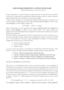 I sistemi energetici ATP, il combustibile universale delle cellule L’ATP (adenosintrifosfato) è “l’intermediario” tra l’energia fornita dagli alimenti e l’energia necessaria alla contrazione muscolare. Meccanismi di risintesi dell’ATP I meccanismi per rigenerare la molecola di ATP sono: Il meccanismo anaerobico alattacido o Sistema ATP-PC Il meccanismo anaerobico lattacido Il meccanismo aerobico Il sistema anaerobico alattacido Il sistema anaerobico alattacido è come un dragster. Esprime una potenza elevatissima, ma che si esaurisce in pochi secondi a causa del serbatoio di capacità molto ridotta. Elevata potenza - bassa capacità Il sistema anaerobico lattacido Il meccanismo anaerobico lattacido è come una Ferrari. Ha un motore molto potente e un serbatoio di capacità sufficiente per percorrere lunghi tratti di strada prima di doversi rifornire di nuovo. Buona potenza – discreta capacità Il sistema aerobico Il meccanismo aerobico è come una vecchia Due Cavalli. Il motore ha una potenza ridotta, ma la capacità del suo serbatoio consente di mantenere il mezzo a lungo in movimento. Bassa potenza - grande capacità La sinergia dei meccanismi energetici Schema riassuntivo: i sistemi energetici
