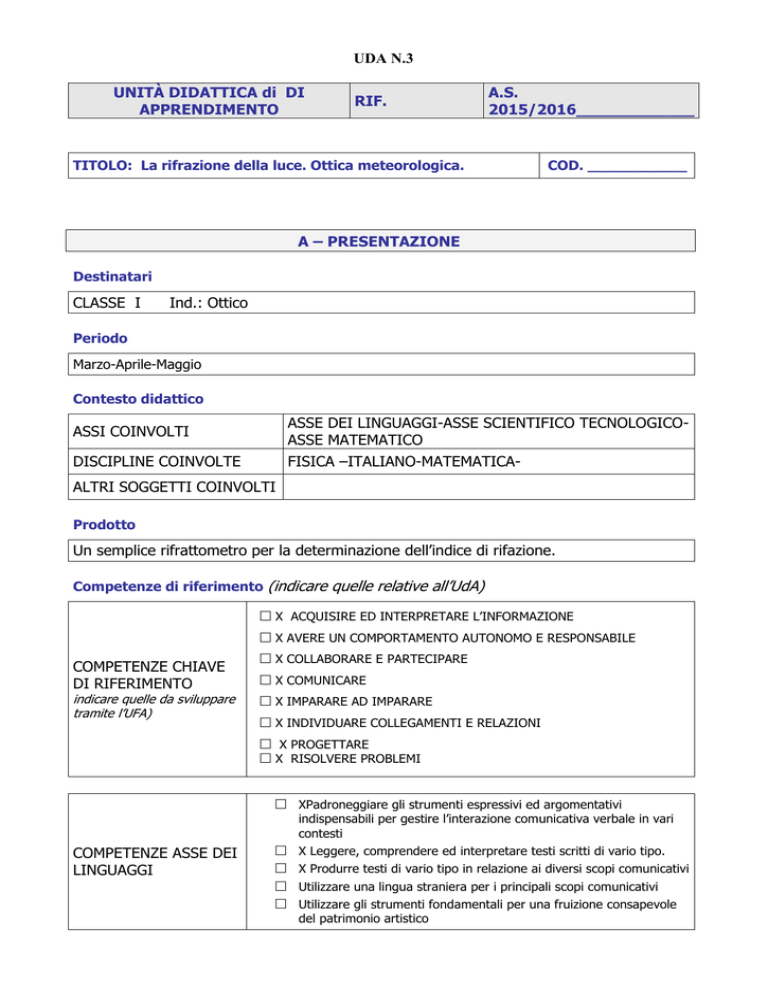 UDA N.3 UNITÀ DIDATTICA di DI APPRENDIMENTO RIF. A.S. 2015/2016____________ TITOLO: La rifrazione della luce. Ottica meteorologica. COD. ___________ A – PRESENTAZIONE Destinatari CLASSE I Ind.: Ottico Periodo Marzo-Aprile-Maggio Contesto didattico ASSI COINVOLTI ASSE DEI LINGUAGGI-ASSE SCIENTIFICO TECNOLOGICOASSE MATEMATICO DISCIPLINE COINVOLTE FISICA –ITALIANO-MATEMATICA- ALTRI SOGGETTI COINVOLTI Prodotto Un semplice rifrattometro per la determinazione dell’indice di rifazione. Competenze di riferimento (indicare quelle relative all’UdA) X ACQUISIRE ED INTERPRETARE L’INFORMAZIONE X AVERE UN COMPORTAMENTO AUTONOMO E RESPONSABILE COMPETENZE CHIAVE DI RIFERIMENTO indicare quelle da sviluppare tramite l’UFA) X COLLABORARE E PARTECIPARE X COMUNICARE X IMPARARE AD IMPARARE X INDIVIDUARE COLLEGAMENTI E RELAZIONI X PROGETTARE X RISOLVERE PROBLEMI XPadroneggiare gli strumenti espressivi ed argomentativi indispensabili per gestire l’interazione comunicativa verbale in vari contesti COMPETENZE ASSE DEI LINGUAGGI X Leggere, comprendere ed interpretare testi scritti di vario tipo. X Produrre testi di vario tipo in relazione ai diversi scopi comunicativi Utilizzare una lingua straniera per i principali scopi comunicativi Utilizzare gli strumenti fondamentali per una fruizione consapevole del patrimonio artistico Utilizzare e produrre testi multimediali X Utilizzare le tecniche e le procedure del calcolo aritmetico ed algebrico, rappresentandole anche sotto forma grafica XConfrontare ed analizzare figure geometriche, individuando COMPETENZE ASSE MATEMATICO invarianti e relazioni X Individuare le strategie appropriate per la soluzione di problemi X Analizzare dati e interpretarli sviluppando deduzioni e ragionamenti sugli stessi, anche con l’ausilio di interpretazioni grafiche, usando consapevolmente gli strumenti di calcolo e le potenzialità offerte da applicazioni di tipo informatico. X Osservare, descrivere ed analizzare fenomeni, appartenenti alla COMPETENZE ASSE SCIENTIFICOTECNOLOGICO realtà naturale e artificiale e riconoscere nelle sue varie forme i concetti di sistema e di complessità X Analizzare qualitativamente e quantitativamente fenomeni legati alle trasformazioni di energia a partire dall’esperienza X Essere consapevole delle potenzialità delle tecnologie rispetto al contesto culturale e sociale in cui vengono applicate Comprendere il cambiamento e la diversita’ dei tempi storici in una COMPETENZE ASSE STORICO-SOCIALE dimensione diacronica attraverso il confronto fra epoche e in una dimensione sincronica attraverso il confronto fra aree geografiche e culturali Collocare l’esperienza personale in un sistema di regole fondato sul reciproco riconoscimento dei diritti della Costituzione, della persona, della collettività, dell’ambiente Riconoscere le caratteristiche essenziali del sistema socio economico per orientarsi nel tessuto produttivo del proprio territorio Motivazione della proposta e suo valore formativo LA PROPOSTA RISULTA ADEGUATA AI RISULTATI DI APPRENDIMENTO CHE L0 STUDENTE DEVE RAGGIUNGERE. Tempi (Calendarizzazione di massima) Marzo-Aprile-Maggio Risorse Semplici lenti sottili. Le lenti degli occhiali. B – INQUADRAMENTO APPRENDIMENTI Finalità educative: (collegate alle competenze chiave): ACQUISIRE ATTEGGIAMENTI DI CURIOSITA’ FINALIZZATI ALLA CONOSCENZA DELLA DISCIPLINA Competenza mirata: (competenza chiave o di asse) RICONOSCERE IL FENOMENO DELLA RIFRAZIONE. Standard di riferimento: Al termine del percorso l’allievo dovrà: CONOSCERE I CONTENUTI PROPOSTI. Competenza: riconoscere il fenomeno della rifrazione e le leggi che lo regolano. Conoscenze La rifrazione e le sue leggi. La riflessione interna totale e l’angolo limite. Prisma ottico. I più comuni fenomeni di ottica meteorologica. Abilità/capacità Indicatori (I) e Descrittori I)Conosce le leggi della rifrazione. Applicare le leggi della rifrazione per D)sa applicare le leggi per determinare la determinare la direzione dei raggi rifratti. direzione dei raggi rifratti. Individua le condizioni affinchè il I)Riconosce il fenomeno. fenomeno si verifichi e lo descrive. D)Sa descriverlo e giustificarlo. I) Riconosce i più comuni fenomeni di Riconoscere e interpretare i più comuni ottica meteorologica. fenomeni di Ottica meteorologica. D) Sa descriverli e giustificarli. Competenza dei Saperi Essenziali: : riconoscere il fenomeno della rifrazione e le leggi che lo regolano. Conoscenze La rifrazione e le sue leggi. Il prisma ottico. Prismi a riflessione totale. Applicazioni. Ottica meteorologica. Abilità/capacità Indicatori (I) e Descrittori I)Conosce le leggi della rifrazione. Applicare le leggi della rifrazione per D)sa applicare le leggi per determinare la determinare la direzione dei raggi rifratti. direzione dei raggi rifratti. I)Riconosce i vari tipi di prismi. Riesce a tracciare e a seguire la D)Sa tracciare il percorso del raggio deviazione del raggio luminoso. luminoso. I) Conosce i più comuni fenomeni di Riesce ad inquadrare e distinguere i più ottica meteorologica. comuni fenomeni di ottica meteorologica. D) Sa giustificare il fenomeno. Competenza Potenziamento: semplici strumenti ottici: il microscopio, il cannocchiale e la macchina fotografica. Conoscenze Abilità/capacità Principio di funzionamento e utilizzo di Saper descrivere il principio di semplici strumenti ottici. funzionamento. Indicatori (I) e Descrittori I) Individua la funzione dello strumento ottico. D) sa descriverne il funzionamento. C – ARTICOLAZIONE DELL’UNITÀ Attribuzioni ASSE linguistico ASSE Scientifico tecno logico. ASSE matematico ASSE SOGGETTO Materia Materia Materia Materia Materia Materia Materia Materia 1 2 1 2 3 4 5 1 Materia Materia Materia Materia xxx yyy zzz kkk 1 2 3 4 Italiano Fisica Matematica Prerequisiti Conoscere il significato di Energia. Fasi di realizzazione Fase 1: Fase 2: Fase 3: Marzo Aprile Maggio Metodologie Lezione frontale ,semplici esperienze laboratoriali da riprodurre i