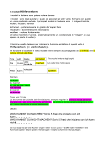 1 I VERBI MODALI (in italiano sono chiamati verbi servili) POTERE/VOLERE/DOVERE KÖNNEN/WOLLEN/MÜSSEN KÖNNEN=potere( essere capace di fare qualcosa) potere (possibilità di fare qualcosa) Es: ich kann schwimmen= io so nuotare Ich kann Tennis spielen= io so giocare a tennis Im Sportzentrum kann man Fußball spielen= al centro sportivo si può giocare a calcio. La sua coniugazione Ich kann io posso Du kannst tu puoi Er/sie/es kann egli può Wir können noi possiamo Ihr könnt voi potete sie/Sie können essi possono COSA NOTIAMO? QUALI SONO LE CARATTERISTICHE DI QUESTI VERBI? -il verbo si modifica nelle prime tre persone singolari per poi ritornare normale nelle tre persone plurali. - la 1° e la 3° persona singolari sono UGUALI -wollen e sollen sono gli unici a non avere l’Umlaut 2 WOLLEN= volere, (avere ferma volontà di fare qualcosa) Ich will io voglio Du willst tu vuoi Er/sie/es will egli vuole Wir wollen noi vogliamo Ihr wollt Sie/sie wollen voi volete essi vogliono MÜSSEN= dovere,avere la necessità di fare qualcosa Ich muss io devo Du musst tu devi Er/sie/es muss egli deve Wir müssen noi dobbiamo Ihr müsst voi dovete Sie/sie müssen essi devono Es: ich muss für die Schule lernen COME SI COSTRUISCE UNA FRASE CON I VERBI MODALI? Es: kannst du schwimmen? Sai nuotare Ja, ich kann sehr gut schwimmen Nein, ich kann nicht schwimmen, aber ich will es lernen. - Questi verbi come in italiano sono seguiti da un altro verbo che viene messo all’infinito in fondo alla frase Verbo modale + verbo all’infinito in fondo alla frase 3 I VERBI RELATIVI ALLO SPORT Sport treiben =praticare uno sport Welcher Sport treibst du? quale sport pratichi? Alcuni verbi sono formati da NOME+VERBO. Per coniugarli mi comporto come se fossero dei” verbi separabili”: coniugo prima il verbo e in fondo metto il nome Tennis giocare a tennis Fußball spielen giocare a calcio Basketball giocare a basket Volleyball giocare a pallavolo Handball giocare a pallamano Es: Spielst du Tennis? giochi a tennis? Ja,Ich spiele Tennis Sì, io gioco a tennis Nein, ich spiele nicht Tennis. No, io non gioco a tennis Ich kann Handball spielen io so giocare a pallamano Inline skaten=pattinare ich skate Inline= Rad fahren=andare in bici Ski fahren=sciare io pattino ich fahre Rad=io vado in bici ich fahre Ski= io scio Gymnastik machen=fare ginnastica 4 ich mache Gymnastik= io faccio ginnastica ALTRI VERBI SONO SEMPLICI reiten=andare a cavallo surfen= fare surf schwimmen =nuotare joggen=fare jogging VERBI RELATIVI QUESTA VOLTA AL TEMPO LIBERO: DIE FREIZEITBESCHÄFTIGUNGEN Anche qui alcuni verbi sono formati da NOME+VERBO. Per coniugarli mi comporto come se fossero dei verbi separabili: coniugo prima il verbo e in fondo metto il nome Karten/Schach spielen= giocare a carte/scacchi Musik hören= ascolatare musica Gitarre/Klavier/Flöte spielen suonare la chitarra, il piano, il flauto Auf Partys/in die Disco/ ins Kino gehen andare alle feste, in discoteca, al cinema Einkaufen gehen andare a fare shopping Spazieren gehen andare a passeggiare Mit Freunden ausgehen uscire con gli amici DVDs gucken guardare DVD Altri sono formati SOLO DA UN VERBO Fotografieren Kochen cucinare 5 Lesen leggere Reisen viaggiare Schreiben scrivere Tanzen ballare