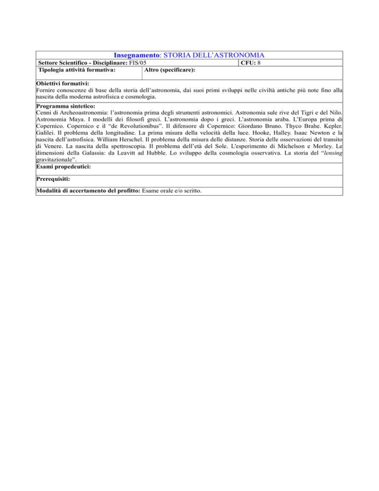 Insegnamento: STORIA DELL’ASTRONOMIA Settore Scientifico - Disciplinare: FIS/05 Tipologia attività formativa: Altro (specificare): CFU: 8 Obiettivi formativi: Fornire conoscenze di base della storia dell’astronomia, dai suoi primi sviluppi nelle civiltà antiche più note fino alla nascita della moderna astrofisica e cosmologia. Programma sintetico: Cenni di Archeoastronomia: l’astronomia prima degli strumenti astronomici. Astronomia sule rive del Tigri e del Nilo. Astronomia Maya. I modelli dei filosofi greci. L’astronomia dopo i greci. L’astronomia araba. L’Europa prima di Copernico. Copernico e il “de Revolutionibus”. Il difensore di Copernico: Giordano Bruno. Thyco Brahe. Kepler. Galilei. Il problema della longitudine. La prima misura della velocità della luce. Hooke, Halley. Isaac Newton e la nascita dell’astrofisica. William Herschel. Il problema della misura delle distanze. Storia delle osservazioni del transito di Venere. La nascita della spettroscopia. Il problema dell’età del Sole. L'esperimento di Michelson e Morley. Le dimensioni della Galassia: da Leavitt ad Hubble. Lo sviluppo della cosmologia osservativa. La storia del “lensing gravitazionale”. Esami propedeutici: Prerequisiti: Modalità di accertamento del profitto: Esame orale e/o scritto.