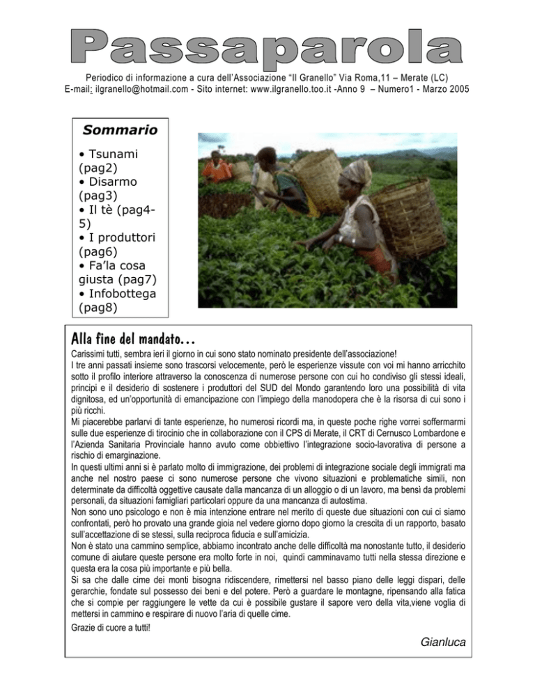 Periodico di informazione a cura dell’Associazione “Il Granello” Via Roma,11 – Merate (LC) E-mail: [email protected] - Sito internet: www.ilgranello.too.it -Anno 9 – Numero1 - Marzo 2005 Sommario • Tsunami (pag2) • Disarmo (pag3) • Il tè (pag45) • I produttori (pag6) • Fa’la cosa giusta (pag7) • Infobottega (pag8) Alla fine del mandato… Carissimi tutti, sembra ieri il giorno in cui sono stato nominato presidente dell’associazione! I tre anni passati insieme sono trascorsi velocemente, però le esperienze vissute con voi mi hanno arricchito sotto il profilo interiore attraverso la conoscenza di numerose persone con cui ho condiviso gli stessi ideali, principi e il desiderio di sostenere i produttori del SUD del Mondo garantendo loro una possibilità di vita dignitosa, ed un’opportunità di emancipazione con l’impiego della manodopera che è la risorsa di cui sono i più ricchi. Mi piacerebbe parlarvi di tante esperienze, ho numerosi ricordi ma, in queste poche righe vorrei soffermarmi sulle due esperienze di tirocinio che in collaborazione con il CPS di Merate, il CRT di Cernusco Lombardone e l’Azienda Sanitaria Provinciale hanno avuto come obbiettivo l’integrazione socio-lavorativa di persone a rischio di emarginazione. In questi ultimi anni si è parlato molto di immigrazione, dei problemi di integrazione sociale degli immigrati ma anche nel nostro paese ci sono numerose persone che vivono situazioni e problematiche simili, non determinate da difficoltà oggettive causate dalla mancanza di un alloggio o di un lavoro, ma bensì da problemi personali, da situazioni famigliari particolari oppure da una mancanza di autostima. Non sono uno psicologo e non è mia intenzione entrare nel merito di queste due situazioni con cui ci siamo confrontati, però ho provato una grande gioia nel vedere giorno dopo giorno la crescita di un rapporto, basato sull’accettazione di se stessi, sulla reciproca fiducia e sull’amicizia. Non è stato una cammino semplice, abbiamo incontrato anche delle difficoltà ma nonostante tutto, il desiderio comune di aiutare queste persone era molto forte in noi, quindi camminavamo tutti nella stessa direzione e questa era la cosa più importante e più bella. Si sa che dalle cime dei monti bisogna ridiscendere, rimettersi nel basso piano delle leggi dispari, delle gerarchie, fondate sul possesso dei beni e del potere. Però a guardare le montagne, ripensando alla fatica che si compie per raggiungere le vette da cui è possibile gustare il sapore vero della vita,viene voglia di mettersi in cammino e respirare di nuovo l’aria di quelle cime. Grazie di cuore a tutti! Gianluca Tsunami Un'onda enorme che scuote la massa oceanica e colpisce con violenza inaudita le coste. Questo è lo "tsunami", parola giapponese che indica il maremoto. L'onda di "tsunami" nasce da un moto tellurico dall'alto verso il basso della massa oceanica e si diffonde guadagnando energia. Le onde possono raggiungere molti metri d'altezza. Masse gigantesche di acqua scendono precipitosamente lungo le deformazioni del fondale marino, a differenza delle onde normali che invece coinvolgono soltanto la superficie del mare. Dopo la tragedia che ha colpito il sud est asiatico, Ctm altromercato ha contattato i produttori allocati nelle aree colpite dal maremoto: India (stato Tamil Nadu) e Sri Lanka (Colombo, Moratuwa, Negombo e Kurunegala) sono i due paesi dove si contano i danni maggiori subiti dai nostri produttori. Nessuno dei produttori in Indonesia e Tailandia ha subito direttamente danni. Tutte le organizzazioni di Commercio Equo e Solidale in loco si stanno attivando per portare soccorsi ed aiuti nelle aree del proprio paese colpite dal maremoto. In Tailandia si evidenzia in particolare la Cooperativa Green Net che ha avviato un programma di aiuti per “gli zingari del mare” che ufficialmente non risultano su alcun documento governativo tailandese sebbene stanziati da generazioni nell’area. Ctm altromercato, dopo aver risposto tempestivamente alle comunicazioni da parte dei produttori e dopo aver raccolto le informazioni sulla situazione in ogni singolo luogo, ha ritenuto opportuno offrire il proprio sostegno immediato stanziando 5.000 Euro a favore di quei produttori che avevano già impegnato fondi propri per acquistare beni di prima necessità. Nello spirito del Commercio Equo e Solidale, il Consorzio Ctm altromercato ha stabilito un programma di raccolta fondi per sostenere quei produttori che stanno avviando programmi a lungo termine ove si prevede la ricostruzione e la riabilitazione delle famiglie di produttori e delle comunità colpite. Ctm altromercato ritiene indispensabile prevedere un apporto di sostegno a tutti quei produttori che ancora oggi stanno cercando di ottenere risposte da famiglie che risultano formalmente “disperse”. La ricostruzione e la riabilitazione vanno nella direzione di un aiuto al ripristino delle attività locali, alla fabbricazione di case e di laboratori che sono stati danneggiati o completamente distrutti dalla forza dello Tsunami. La preparazione degli aiuti nel magazzino di Gospel House in Sri Lanka Per un mondo senza armi Sabato 12 febbraio 2005 in tutta Italia si è tenuta una giornata di sensibilizzazione e di inform-azione sul tema degli armamenti e sull’impatto che essi hanno per lo sviluppo nel mondo, organizzata da Agices, Assobotteghe e dalla Rete Italiana per il Disarmo. Ogni giorno, milioni di donne, di uomini e di bambini vivono nel terrore della violenza armata; ogni minuto, uno di loro resta ucciso. Ogni anno in Africa, Asia, Medio Oriente e America latina si spendono in media 22 miliardi di dollari per l'acquisto di armi, somma che avrebbe permesso a questi paesi di ridurre la mortalità infantile e materna (cifra stimata: 12 miliardi di dollari l'anno) ed eliminare l'analfabetismo (cifra stimata: 10 miliardi di dollari l'anno). Il totale delle spese militari mondiali in un anno è di 956 miliardi di d