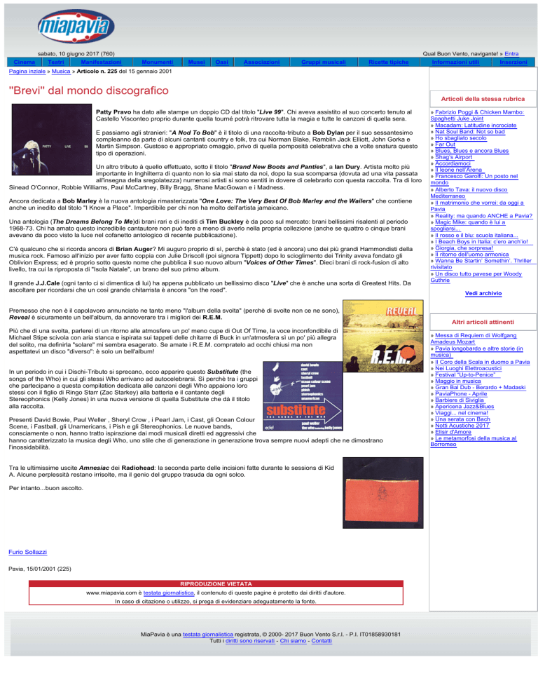 sabato, 10 giugno 2017 (760) Cinema Teatri Qual Buon Vento, navigante! » Entra Manifestazioni Monumenti Musei Oasi Associazioni Gruppi musicali Ricette tipiche Informazioni utili Inserzioni Pagina inziale » Musica » Articolo n. 225 del 15 gennaio 2001 ''Brevi'' dal mondo discografico Articoli della stessa rubrica Patty Pravo ha dato alle stampe un doppio CD dal titolo "Live 99". Chi aveva assistito al suo concerto tenuto al Castello Visconteo proprio durante quella tourné potrà ritrovare tutta la magia e tutte le canzoni di quella sera. E passiamo agli stranieri: "A Nod To Bob" è il titolo di una raccolta-tributo a Bob Dylan per il suo sessantesimo compleanno da parte di alcuni cantanti country e folk, tra cui Norman Blake, Ramblin Jack Elliott, John Gorka e Martin Simpson. Gustoso e appropriato omaggio, privo di quella pomposità celebrativa che a volte snatura questo tipo di operazioni. Un altro tributo à quello effettuato, sotto il titolo "Brand New Boots and Panties", a Ian Dury. Artista molto più importante in Inghilterra di quanto non lo sia mai stato da noi, dopo la sua scomparsa (dovuta ad una vita passata all'insegna della sregolatezza) numerosi artisti si sono sentiti in dovere di celebrarlo con questa raccolta. Tra di loro Sinead O'Connor, Robbie Williams, Paul McCartney, Billy Bragg, Shane MacGowan e i Madness. Ancora dedicata a Bob Marley è la nuova antologia rimasterizzata "One Love: The Very Best Of Bob Marley and the Wailers" che contiene anche un inedito dal titolo "I Know a Place". Imperdibile per chi non ha molto dell'artista jamaicano. Una antologia (The Dreams Belong To Me)di brani rari e di inediti di Tim Buckley è da poco sul mercato: brani bellissimi risalenti al periodo 1968-73. Chi ha amato questo incredibile cantautore non può fare a meno di averlo nella propria collezione (anche se quattro o cinque brani avevano da poco visto la luce nel cofanetto antologico di recente pubblicazione). C'è qualcuno che si ricorda ancora di Brian Auger? Mi auguro proprio di sì, perchè è stato (ed è ancora) uno dei più grandi Hammondisti della musica rock. Famoso all'inizio per aver fatto coppia con Julie Driscoll (poi signora Tippett) dopo lo scioglimento dei Trinity aveva fondato gli Oblivion Express; ed è proprio sotto questo nome che pubblica il suo nuovo album "Voices of Other Times". Dieci brani di rock-fusion di alto livello, tra cui la riproposta di "Isola Natale", un brano del suo primo album. Il grande J.J.Cale (ogni tanto ci si dimentica di lui) ha appena pubblicato un bellissimo disco "Live" che è anche una sorta di Greatest Hits. Da ascoltare per ricordarsi che un così grande chitarrista è ancora "on the road". Premesso che non è il capolavoro annunciato ne tanto meno "l'album della svolta" (perchè di svolte non ce ne sono), Reveal è sicuramente un bell'album, da annoverare tra i migliori dei R.E.M. Più che di una svolta, parlerei di un ritorno alle atmosfere un po' meno cupe di Out Of Time, la voce inconfondibile di Michael Stipe scivola con aria stanca e ispirata sui tappeti delle chitarre di Buck in un'atmosfera sì un po' più allegra del solito, ma definirla "solare" mi sembra esagerato. Se amate i R.E.M. compratelo ad occhi chiusi ma non aspettatevi un disco "diverso": è solo un bell'album! In un periodo in cui i Dischi-Tributo si sprecano, ecco apparire questo Substitute (the songs of the Who) in cui gli stessi Who arrivano ad autocelebrarsi. Sì perchè tra i gruppi che partecipano a questa compilation dedicata alle canzoni degli Who appaiono loro stessi con il figlio di Ringo Starr (Zac Starkey) alla batteria e il cantante degli Stereophonics (Kelly Jones) in una nuova versione di quella Substitute che dà il titolo alla raccolta. Presenti David Bowie, Paul Weller , Sheryl Crow , i Pearl Jam, i Cast, gli Ocean Colour Scene, i Fastball, gli Unamericans, i Pish e gli Stereophonics. Le nuove bands, consciamente o non, hanno tratto ispirazione dai modi musicali diretti ed aggressivi che hanno caratterizzato la musica degli Who, uno stile che di generazione in generazione trova sempre nuovi adepti che ne dimostrano l'inossidabilità. Tra le ultimissime uscite Amnesiac dei Radiohead: la seconda parte delle incisioni fatte durante le sessions di Kid A. Alcune perplessità restano irrisolte, ma il genio del gruppo trasuda da ogni solco. Per intanto...buon ascolto. Furio Sollazzi Pavia, 15/01/2001 (225) RIPRODUZIONE VIETATA www.miapavia.com è testata giornalistica, il contenuto di queste pagine è protetto dai diritti d'autore. In caso di citazione o utilizzo, si prega di evidenziare adeguatamente la fonte. MiaPavia è una testata giornalistica registrata, © 2000- 2017 Buon Vento S.r.l. - P.I. IT01858930181 Tutti i diritti sono riservati - Chi siamo - Contatti » Fabrizio Poggi & Chicken Mambo: Spaghetti Juke Joint » Macadam: Latitudine incrociate » Nat Soul Band: Not so bad » Ho sbagliato secolo » Far Out » Blues, Blues e ancora Blues » Shag’s Airport » Accordiamoci » Il leone nell’Arena » Francesco Garolfi: Un posto nel mondo » Alberto Tava: il nuovo disco Mediterraneo » Il matrimonio che vorrei: da oggi a Pavia » Reality: ma quando ANCHE a Pavia? » Magic Mike: quando è lui a spogliarsi... » Il rosso e il blu: scuola italiana... » I Beach Boys in Italia: c’ero anch’io! » Giorgia, che sorpresa! » Il ritorno dell'uomo armonica » Wanna Be Startin’ Somethin’. Thriller rivisitato » Un disco tutto pavese per Woody Guthrie Vedi archivio Altri articoli attinenti » Messa di Requiem di Wolfgang Amadeus Mozart » Pavia longobarda e altre storie (in musica) » Il Coro della Scala in duomo a Pavia » Nei Luoghi Elettroacustici » Festival “Up-to-Penice” » Maggio in musica » Gran Bal Dub - Berardo + Madaski » PaviaPhone - Aprile » Barbiere di Siviglia » Apericena Jazz&Blues » Viaggi... nel cinema! » Una serata con Bach » Notti Acustiche 2017 » Elisir d'Amore » Le metamorfosi della musica al Borromeo