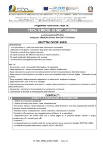 Programma Finale della Classe 3R TECN. E PROG. DI SIST. INFORM Anno Scolastico 2014-2015 Insegnanti: CIPOLLA Bruno, ROCCHETTA Cristiano OBIETTIVI DISCIPLINARI padroneggiare la rappresentazione dell'informazione digitale con le sue implicazioni. Conoscere il funzionamento di un sistema operativo Cloud computing. CONTENUTI 1 Rappresentazione dell'informazione digitale Simboli, alfabeti e linguaggi, l'alfabeto binario, rappresentazione di informazioni in binario (testi, numeri, immagini, suoni, video). codifiche varie, formati oggetti più usati. Sistema numerico binario Rappresentazione binaria, ottale, decimale, esadecimale Informatica e automazione. Digitalizzazione del mondo, vantaggi e svantaggi dell'informazione digitale. Unità di misura informatiche, Bit, byte, word, nibble, Kappa, Mega, pollici... Peso dell'informazione digitale. Gestione degli errori in informatica. memorie ECC, dischi e reti, FEC Memorie informatiche, volatili e permanenti, sequenziali e ad accesso diretto, ottiche, magnetiche, solid state, pennine e schedine e SSD. Rudimenti di cifratura e compressione dell'informazione 2 Informatica Il "principio di precauzione" Il cloud computing e i thin clients, cloud storage, cloud gaming, google drive. Differenze fra applicazioni su PC e APP per smartphone Legge di Moore. Standard informatici. Il software ed il suo ciclo. Evoluzione del S.O. Windows. Tipi di software, Freeware, shareware, Open source ecc. Licenze software. Funzionamento del PC, Bios, p.o.s.t., bootstrap, boot manager, più S.O. anche in simultanea sulla stessa macchin fisica. Macchine virtuali Architetture informatiche a 8 16 32 e 64 bit, RISC e CISC, set di istruzioni, stack, code, Hardware sistemi di calcolo: microcontroller, SOC e microprocessori, server e supercomputers, Criteri di stima delle prestazioni di un elaboratore: Clock, ampiezza parola, memoria cache... compatibilità e portabilità del codice. Architetture per console di gaming e per smartphone e tablet. Architettura ARM e implementazioni. big.LITTLE e ARM V8. Sistemi di tipo server, memorie ECC, gruppi di continuità, componenti ridondate. 3 Sistemi operativi 3R - TECN. E PROG. DI SIST. INFORM Pagina 1/3 Funzione e architettura di un sistema operativo Strutture dati per i sistemi operativi: Stack, coda, albero, grafo Multitasking e multiuser Tipi di sistemi operativi: Batch, Time sharing, Real time ecc. Programmi applicativi, portabilità del codice, libreoffice Le API del s.o. Multiprocessing (Multicore) e Hyperthreading, Multitasking, priorità, privilegi, quote. Scheduler e dispatcher, gestione delle interruzioni. Memorie di massa, unità periferiche, dischi magnetici, SSD, partizioni, livelli RAID I files, file system, backup e archiving, i metadati. Crash e dump, i files di log, macchine virtuali. L'interfaccia utente, dagli switch e schede perforate a WIMP, pen e touch e alla lettura del pensiero Speech e handwriting recognition, sintesi vocale. Concetti di "always on" e "instant on" suspend e ibernazione. Sistemi open source, unix, linux e derivati. 4 Internet e comunicazioni Rudimenti di testo, ipertesto, multimedialità. Link, URL, Domini, indirizi IP, ADSL, fibre ottiche, backbone, banda e Latenza. Web hosting e Cloud computing. Strumenti: ping, tracert, Il DNS Internet prima del browser, "memoria" di internet, precauzioni nell'utilizzo. tecnologie, prodotti ed evoluzione della comunicazione mobile: dal phone al phablet. Geolocalizzazione, TOR e LOIC. Email, Spam e phish Ricerca avanzata di informazioni su Internet con Google Alcuni strumenti di google. Risorse su internet, funzionamento di wikipedia, linkedin, sourceforge.net 5 VARIE portableapps.com, pen computing versus touch computing tecnologie RFID e NFC sicurezza informatica e scelta e gestione delle passsword Rudimenti di S.O. Ubuntu Diritto d'autore e informazione digitale Google docs/drive e cloud computing. I watermark digitali Elettricità ed informatica, consumi, alimentatori, batterie Ergonomia, Biometria (cenni) 6 Laboratorio Utilizzo di Google drive, documenti, presentazioni, fogli di calcolo, moduli, upload, conversione e condivisione di documenti. Linux Ubuntu, strumenti diagnostici vari. l'Hiren boot CD Aggiornamenti software, Editing esadecimale di files, calcolo esadecimale Cenni di procedure di comandi STRUMENTI DI VERIFICA UTILIZZATI Questionari online, prove scritte, interrogazioni, qualche esercizio di laboratorio STRUMENTI DIDATTICI UTILIZZATI Materiali prodotti dall'insegnante in formato PDF e non (brunocipolla.net/scuola) rete internet, wikipedia, 3R - TECN. E PROG. DI SIST. INFORM Pagina 2/3 presentazioni Impress. Qualche modulo didattico multimediale. La Spezia, 21/06/2015 I DOCENTI: ___________________ _________________ I RAPPRESENTANTI DI CLASSE: ___________________ _________________ 3R - TECN. E PROG. DI SIST. INFORM Pagina 3/3