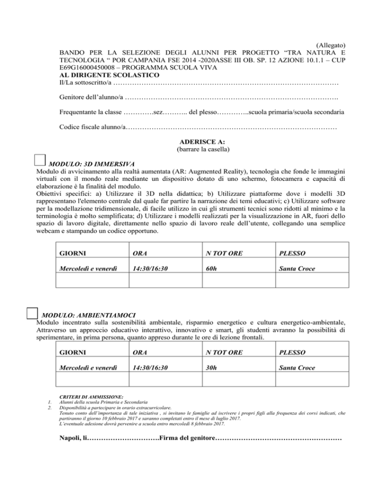 (Allegato) BANDO PER LA SELEZIONE DEGLI ALUNNI PER PROGETTO “TRA NATURA E TECNOLOGIA “ POR CAMPANIA FSE 2014 -2020ASSE III OB. SP. 12 AZIONE 10.1.1 – CUP E69G16000450008 – PROGRAMMA SCUOLA VIVA AL DIRIGENTE SCOLASTICO Il/La sottoscritto/a …………………………………………………………………………………… Genitore dell’alunno/a ………………………………………………………………………………. Frequentante la classe ………….sez……….. del plesso…………..scuola primaria/scuola secondaria Codice fiscale alunno/a……………………………………………………………………………… ADERISCE A: (barrare la casella) MODULO: 3D IMMERSIVA Modulo di avvicinamento alla realtà aumentata (AR: Augmented Reality), tecnologia che fonde le immagini virtuali con il mondo reale mediante un dispositivo dotato di uno schermo, fotocamera e capacità di elaborazione è la finalità del modulo. Obiettivi specifici: a) Utilizzare il 3D nella didattica; b) Utilizzare piattaforme dove i modelli 3D rappresentano l'elemento centrale dal quale far partire la narrazione dei temi educativi; c) Utilizzare software per la modellazione tridimensionale, di facile utilizzo in cui gli strumenti tecnici sono ridotti al minimo e la terminologia è molto semplificata; d) Utilizzare i modelli realizzati per la visualizzazione in AR, fuori dello spazio di lavoro digitale, direttamente nello spazio di lavoro reale dell’utente, collegando una semplice webcam e stampando un codice opportuno. GIORNI ORA N TOT ORE PLESSO Mercoledì e venerdì 14:30/16:30 60h Santa Croce MODULO: AMBIENTIAMOCI Modulo incentrato sulla sostenibilità ambientale, risparmio energetico e cultura energetico-ambientale, Attraverso un approccio educativo interattivo, innovativo e smart, gli studenti avranno la possibilità di sperimentare, in prima persona, quanto appreso durante le ore di lezione frontali. 1. 2. GIORNI ORA N TOT ORE PLESSO Mercoledì e venerdì 14:30/16:30 30h Santa Croce CRITERI DI AMMISSIONE: Alunni della scuola Primaria e Secondaria Disponibilità a partecipare in orario extracurricolare. Tenuto conto dell’importanza di tale iniziativa , si invitano le famiglie ad iscrivere i propri figli alla frequenza dei corsi indicati, che partiranno il giorno 10 febbraio 2017 e saranno completati entro il mese di luglio 2017. L’eventuale adesione dovrà pervenire a scuola entro mercoledì 8 febbraio 2017. Napoli, li………………………….Firma del genitore………………………………………………