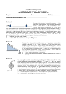 Prova scritta di Fisica Generale I Corso di studio in Astronomia – 24 giugno 2014 Problema 1 Una locomotiva di massa 2m = 400 kg traina lungo un tratto rettilineo di binario due carrozze, C1 e C2, ciascuna di massa m. La carrozza C1 è collegata direttamente alla locomotiva tramite una molla di costante elastica k = 3 × 104 N/m, mentre la carrozza C2 è collegata a C1 per mezzo di una fune inestensibile e di massa trascurabile. Alla locomotiva è applicata una forza esterna costante di modulo F = 8 × 103 N, diretta parallelamente alla direzione del moto. Sapendo che il coefficiente d’attrito dinamico tra il convoglio e il binario vale µ = 0.05, si calcoli la tensione T della fune, l’allungamento della molla rispetto alla sua lunghezza a riposo, ∆x, e l’accelerazione a con cui si muove il convoglio. Soluzione Consideriamo le forze che hanno componente diversa da zero lungo la direzione del moto. Sulla locomotiva (L) agiscono la forza esterna, F , la forza elastica, −k∆x, e la forza di attrito, −µ2mg. Sulla carrozza C1 agiscono la forza elastica, +k∆x, la tensione della fune, −T , e l’attrito, −µmg; su C2 la tensione della fune , +T , e l’attrito, −µmg. Scrivendo la legge di Newton per i singoli componenti del sistema (L, C1 e C2) si ottiene 2maL = F − k∆x − 2µmg ma1 = k∆x − T − µmg ma2 = T − µmg , (1) Se la fune è tesa e la molla ha raggiunto la massima deformazione, la tre accelerazioni devono essere uguali, aL = a1 = a2 ≡ a. Sommando le tre equazioni si ottiene 4ma = F − 4µmg , (2) da cui segue subito F − µg = 9.5 m/s2 . 4m La tensione della fune si ricava dalla terza equazione a= T = ma + µmg = F/4 = 2000 N e la deformazione della molla dalla prima, ∆x = F/(2k) = 0.13 m . 1 (3) (4) Problema 2 Si consideri un corpo rigido formato da un disco omogeneo di raggio R = 20 cm e massa M = 1.4 kg e da una sbarretta sottile e omogenea di massa m = 300 g, lunga R, fissata lungo un raggio del disco. Il sistema è disposto su un piano verticale ed è in grado di ruotare intorno ad un asse orizzontale passante per il centro del disco, O. Esso viene abbandonato da fermo con la sbarretta disposta orizzontalmente. Trascurando tutti gli attriti, si determini 1. la posizione del centro di massa nella configurazione iniziale; 2. la velocità angolare del sistema quando la sbarretta è disposta verticalmente. In realtà, a causa degli inevitabili attriti, l’ampiezza del moto del sistema si riduce e dopo un certo tempo viene raggiunto un regime di piccole oscillazioni. Si calcoli 3. il periodo delle piccole oscillazioni. Soluzione La posizione iniziale del centro di massa (CM) del corpo si calcola facilmente, dato che sono note le posizioni dei centri di massa del disco e della sbarretta. Introdotto un sistema cartesiano con orgine nel centro del disco (O), asse x orizzonatale e asse y verticale, sarà mR 2(m + M ) = (myCM,sbarretta + M yCM,disco )/(m + M ) = 0 . xCM = (mxCM,sbarretta + M xCM,disco )/(m + M ) = yCM (5) (6) Il CM del corpo si trova quindi lungo il diametro orizzontale, ad una distanza d = mR/[2(m+ M )] = 0.018 m dal centro del disco. Se gli attriti sono trascurabili, l’energia meccanica è conservata. Assumendo come livello zero dell’energia potenziale gravitazionale la quota del CM quando la sbarretta è verticale, l’energia meccanica all’istante iniziale è E0 = (m + M )gd. Dato che il moto è una pura rotazione con asse fisso, l’energia finale vale E1 = Iω 2 /2, dove I è il momento d’inerzia del corpo rispetto all’asse di rotazione; I = Isbarretta +Idisco = mR2 /3+M R2 /2= (3M +2m)R2 /6. Segue immediatamente 1 2 mR/2 Iω = (m + M )g 2 m+M (7) ed infine s ω= 6g = 4.3 rad/s . (3M/m + 2)R 2 (8) Si tratta di calcolare il periodo delle piccole oscillazioni per un pendolo composto, in cui il CM dista d dall’asse di rotazione. Ricordando che la pulsazione è data dalla relazione s Ω= (m + M )gd , I (9) il periodo risulta s 2π (3M/m + 2)R P = = 2π = 2.1 s . Ω 3g (10) Problema 3 Un recipiente cilindrico a pareti adiabatiche, disposto orizzontalmente, è separato in due parti, A e B, da un setto mobile, di massa trascurabile, anch’esso adiabatico e libero di scorrere senza attrito. Il setto si trova inizialmente in condizione di equilibrio statico. Il comparto A contiene n = 1 mole di un gas ideale biatomico, in equilibrio termodinamico alla temperatura iniziale TA = 300 K. Il comparto B contiene n = 1 mole di vapor d’acqua saturo in equilibrio termodinamico alla temperatura TB = 373 K e pressione PB = 1 atm. Per mezzo di una resistenza elettrica, una quantità complessiva di calore Q viene fornita al gas in A, in modo che questo si espanda molto lentamente. Al termine dell’espansione si hanno nuovamente condizioni di equilibrio termodinamico sia in A che in B, e una quantità m = 9 g di acqua si è formata in B. Trattando il vapore in B come un gas ideale, e ricordando che la massa molare e la densità dell’acqua valgono rispettivamente MH2 O = 18 g/mol e ρH2 O = 1000 kg/m3 , si calcoli: 1. Il lavoro fatto dal gas in A. 2. La variazione di temperatura del gas in A. 3. La variazione di entropia del gas in A. Soluzione Il volume iniziale del vapore in B è pari a: VBi = nRTB = 0.03 m3 PB (11) Per definizione di massa molare, se x è la frazione di moli del vapore che viene liquefatta durante la compressione, si ha m = nxMH2 O , con n = 1. Pertanto x = 0.5. Il volume di vapore all’equilibrio finale in B, ricordando che il cambiamento di fase è un processo isotermo e isobaro, è quindi pari a: VBf = n(1 − x)RTB = 0.015 m3 , PB 3 (12) Il volume di acqua formatasi è pari a VH2 O = m/ρH2 O ∼ 10−5 m3 , ed è pertanto del tutto trascurabile rispetto al volume di vapore. Dato che la trasformazione parte all’equilibrio meccanico, e procede in modo quasi statico, il gas in A si mantiene anch’esso a pressione costante PA = PB = 1 atm durante l’espansione. Il lavoro fatto dal gas in A è pari a: WA 