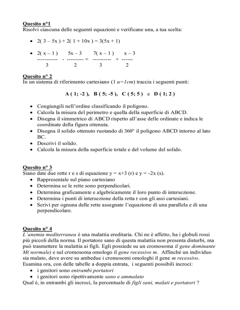 Quesito n°1 Risolvi ciascuna delle seguenti equazioni e verificane una, a tua scelta: 2( 3 – 5x ) + 2( 1 + 10x ) = 3(5x + 1) 2( x – 1 ) 5x – 3 7( x – 1 ) x–3 ----------- - --------- = ---------- + -----3 2 3 2 Quesito n° 2 In un sistema di riferimento cartesiano (1 u=1cm) traccia i seguenti punti: A ( 1; -2 ), B ( 5; -5 ), C ( 5; 5 ) e D ( 1; 2 ) Congiungili nell’ordine classificando il poligono. Calcola la misura del perimetro e quella della superficie di ABCD. Disegna il simmetrico di ABCD rispetto all’asse delle ordinate e indica le coordinate della figura ottenuta. Disegna il solido ottenuto ruotando di 360° il poligono ABCD intorno al lato BC. Descrivi il solido. Calcola la misura della superficie totale e del volume del solido. Quesito n° 3 Siano date due rette r e s di equazione y = x+3 (r) e y = -2x (s). Rappresentale sul piano cartesiano Determina se le rette sono perpendicolari. Determina graficamente e algebricamente il loro punto di intersezione. Determina i punti di intersezione della retta r con gli assi cartesiani. Scrivi per ognuna delle rette assegnate l’equazione di una parallela e di una perpendicolare. Quesito n° 4 L’anemia mediterranea è una malattia ereditaria. Chi ne è affetto, ha i globuli rossi più piccoli della norma. Il portatore sano di questa malattia non presenta disturbi, ma può trasmettere la malattia ai figli. Egli possiede su un cromosoma il gene dominante M( normale) e sul cromosoma omologo il gene recessivo m. Affinchè un individuo sia malato, deve avere su ambedue i cromosomi omologhi il gene m recessivo. Esamina ora, con delle tabelle a doppia entrata, i seguenti possibili incroci: i genitori sono entrambi portatori i genitori sono ripettivamente sano e ammalato Qual è, in entrambi gli incroci, la percentuale di figli sani, malati e portatori ?