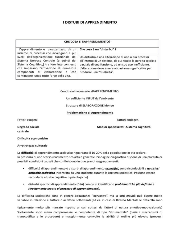 I DISTUBI DI APPRENDIMENTO CHE COSA E’ L’APPRENDIMENTO? L’apprendimento è caratterizzato da un insieme di processi che avvengono a più livelli dell’organizzazione funzionale del Sistema Nervoso Centrale (e quindi del Sistema Cognitivo,) tra loro interconnessi, che implicano l’attivazione di numerose componenti di elaborazione e che continuano lungo tutto l’arco della vita. Che cosa è un “disturbo” ? Un disturbo è una alterazione di uno o più processi all’interno di un sistema, da cui risulta la perdita totale o parziale di una funzione, od un suo uso inefficiente. L’alterazione deve essere abbastanza significativa per produrre una “disabilità”. Condizioni necessarie all’APPRENDIMENTO: Un sufficiente INPUT dall’ambiente Strutture di ELABORAZIONE idonee Problematiche di Apprendimento Fattori esogeni Degrado sociale centrale Fattori endogeni Moduli specializzati -Sistema cognitivo Difficoltà economiche Arretratezza culturale Le difficoltà di apprendimento scolastico riguardano il 10-20% della popolazione in età scolare. In presenza di uno scarso rendimento scolastico generale, l’indagine diagnostica dispone di una pluralità di possibili condizioni causali che confluiscono in due grandi raggruppamenti: • difficoltà di apprendimento o disturbi di apprendimento aspecifici, sono riconducibili a qualsiasi difficoltà scolastica incontrata da uno studente durante la carriera scolastica. Possono essere secondarie a turbe cognitive o psicologiche) • disturbi specifici di apprendimento (DSA) con cui si identificano problematiche più definite e strettamente legate al processo di apprendimento). Le difficoltà scolastiche sono in genere abbastanza “pervasive”, ma la loro gravità può essere molto variabile in relazione al fattore o ai fattori sottostanti (ad es. in caso di Ritardo Mentale le difficoltà sono tipicamente molto più marcate rispetto ai casi sottesi da fattori di natura emotivo-motivazionale) Solitamente sono meno compromesse le competenze di tipo “strumentale” (ossia i meccanismi di transcodifica e le procedure) e maggiormente coinvolte le abilità di ordine più elevato (processi inferenziali, capacità di pianificazione, processi di autoregolazione) coinvolte negli apprendimenti più complessi (comprensione e produzione del testo, problem-solving). Riconosciamo in termini aspecifici come difficoltà di apprendimento “stati che, singolarmente o compresenti nella medesima persona, talvolta nello stesso gruppo familiare, possono indurre esitazioni, frequenza di errori, rifiuti o costanti insufficienze nel padroneggiare competenze”. Tali difficoltà sono riconducibili, come evidenziato nella sottostante tabella, ad una serie di tipicità individuali: (CRISPIANI P., Dossier DSA 2008, Libreria Universitaria Floriani, Macerata, 2009, p. 7) • RITARDO MENTALE Condizione di handicap che produce inevitabilmente difficoltà di apprendimento.Il fenomeno attiene alla qualità delle funzioni intellettive umane, quindi all’efficacia ed all’efficienza dell’intelligenza. L’elemento che caratterizza principalmente questa condizione è costituito da un funzionamento intellettivo quantitativamente al disotto della media, cui sono associate limitazioni in due o più fra le seguenti aree d’abilità intellettiva: comunicazione, cura personale, vita in casa e nella comunità, abilità sociali, salute e sicurezza, autogestione, abilità scolastiche funzionali, tempo libero e lavoro. DISTURBO DELLA SIMBOLIZZAZIONE Condizione in cui si riscontrano lievi o gravi difficoltà negli apprendimenti che comportano processi simbolici ossia che implicano il riconoscimento di icone, codici, lettere (per esempio, la letto-scrittura, processi matematici, fisici, ecc). Il disturbo della simbolizzazione si manifesta nella forma della: - asimbolia (incapacità nell’attribuire significato ai simboli), - insufficienza simbolica (lentezza nell’attribuire significato ai simboli). FORTE DEMOTIVAZIONE: Condizione presente in svariate situazioni ambientali o soggettuali. Si parla di situazione socioculturale svantaggiata quando la situazione economica, il grado di istruzione dei genitori e il livello di stimolazioni sensoriali, linguistiche, relazionali, intellettive, offerte al bambino è tanto basso da comportare minori opportunità di apprendimento. A volte può influire negativamente anche la zona di residenza, si pensi per esempio ad aree isolate di campagna, montagna o zone dove il tasso di dispersione scolastica è molto alto. FORTE DIVERSITÀ CULTURALE Condizione connessa alle migrazioni, alle adozioni internazionali, all’appartenenza a minoranza culturali e/o linguistiche. Per esempio un bambino che proviene da una comunità con lingua e costumi profondamente differenti dalla nostra, quasi certamente incontrerà forti difficoltà a seguire l’attività scolastica e difficilmente troverà aiuto in famiglia. SCARSA COMPETENZA LINGUISTICA Condizione connessa alla forte diversità culturale, alle condizioni di bilinguismo o di poliglossia oppure a consistenti logopatie. DISTURBI DEL COMPORTAMENTO Varie sindromi comportamentali possono mettere in difficoltà i processi apprenditivi, (ad es. l’ADHD o disturbo da deficit di attenzione,disturbi neuro-motori gravi, consistenti ipercinesie, disturbi mentali e di personalità). La % di bambini o adolescenti con DA che abbandonano la scuola è stimata intorno al 40%. • Il 10-25% dei soggetti con disturbo della condotta, disturbo oppositivo/provocatorio, disturbo da deficit di attenzione/iperattività, disturbo distimico, sono affetti da DA. L’intervento nei casi di difficoltà di apprendimento è estremamente diversificato in funzione del fattore o dei fattori sottostanti. Diversamente dalle difficoltà di apprendimento, si hanno DSA, identificabili in forma propria, quale sindrome primaria, non espressione derivata di altre condizioni patologiche o disabilità. La principale caratteristica che permette 