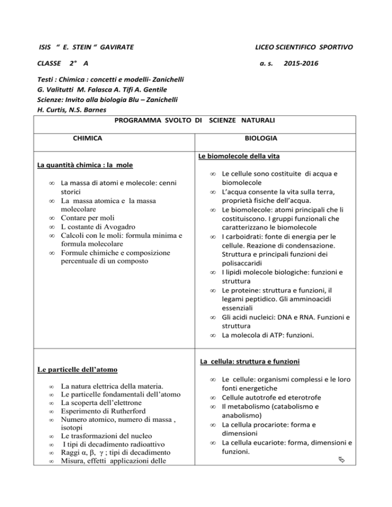 ISIS “ E. STEIN “ GAVIRATE CLASSE LICEO SCIENTIFICO SPORTIVO 2° A a. s. 2015-2016 Testi : Chimica : concetti e modelli- Zanichelli G. Valitutti M. Falasca A. Tifi A. Gentile Scienze: Invito alla biologia Blu – Zanichelli H. Curtis, N.S. Barnes PROGRAMMA SVOLTO DI SCIENZE NATURALI CHIMICA BIOLOGIA Le biomolecole della vita La quantità chimica : la mole • • • • • • • La massa di atomi e molecole: cenni storici La massa atomica e la massa molecolare Contare per moli L costante di Avogadro Calcoli con le moli: formula minima e formula molecolare Formule chimiche e composizione percentuale di un composto • • • • • • • Le cellule sono costituite di acqua e biomolecole L’acqua consente la vita sulla terra, proprietà fisiche dell’acqua. Le biomolecole: atomi principali che li costituiscono. I gruppi funzionali che caratterizzano le biomolecole I carboidrati: fonte di energia per le cellule. Reazione di condensazione. Struttura e principali funzioni dei polisaccaridi I lipidi molecole biologiche: funzioni e struttura Le proteine: struttura e funzioni, il legami peptidico. Gli amminoacidi essenziali Gli acidi nucleici: DNA e RNA. Funzioni e struttura La molecola di ATP: funzioni. La cellula: struttura e funzioni Le particelle dell’atomo • • • • • • • • • La natura elettrica della materia. Le particelle fondamentali dell’atomo La scoperta dell’elettrone Esperimento di Rutherford Numero atomico, numero di massa , isotopi Le trasformazioni del nucleo I tipi di decadimento radioattivo Raggi α, β, γ ; tipi di decadimento Misura, effetti applicazioni delle • • • • • Le cellule: organismi complessi e le loro fonti energetiche Cellule autotrofe ed eterotrofe Il metabolismo (catabolismo e anabolismo) La cellula procariote: forma e dimensioni La cellula eucariote: forma, dimensioni e funzioni. • • • radiazioni La datazione di reperti con il radiocarbonio L’Energia nucleare Fissione e fusione nucleare • • • • • • La membrana cellulare degli eucarioti (fosfolipidi e proteine) Le cellule eucariote: nucleo, citoscheletro e citoplasma Scambi di sostanze con l’ambiente esterno: trasporto attivo, passivo e facilitato. Esocitosi, endocitosi Gli organuli cellulari: forma e funzioni (nucleo, vacuoli e vescicole, RER, REL. Apparato del Golgi, ribosomi, mitocondri, ciglia e flagelli) La glicolisi La divisione delle cellule: mitosi e meiosi Struttura dell’atomo • • • • • • • • La doppia natura della luce La luce degli atomi L’atomo di Bohr La doppia natura dell’elettrone Principio di indeterminazione di Heisemberg Numeri quantici e orbitali Dall’orbitale alla forma dell’atomo Configurazione elettronica degli atomi polielettronici • • • • Procarioti ed eucarioti unicellulari si riproducono tramite divisione cellulare. Il ciclo cellulare negli organismi eucarioti La mitosi è un processo che si conclude con la citodieresi. La riproduzione sessuata: gameti; la meiosi. LABORATORIO Saggio alla fiamma Uso del Microscopio ottico con la lettera e con tessuti vegetali Gavirate, 01 giugno 2016 L’insegnante Gli alunni