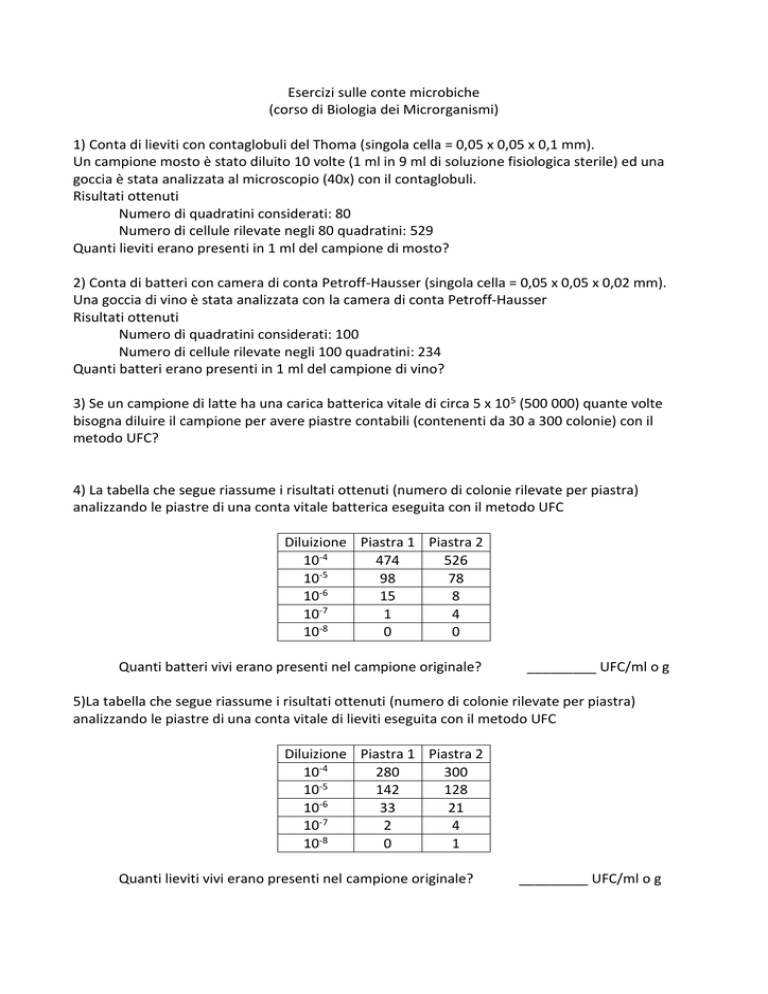 Esercizi sulle conte microbiche (corso di Biologia dei Microrganismi) 1) Conta di lieviti con contaglobuli del Thoma (singola cella = 0,05 x 0,05 x 0,1 mm). Un campione mosto è stato diluito 10 volte (1 ml in 9 ml di soluzione fisiologica sterile) ed una goccia è stata analizzata al microscopio (40x) con il contaglobuli. Risultati ottenuti Numero di quadratini considerati: 80 Numero di cellule rilevate negli 80 quadratini: 529 Quanti lieviti erano presenti in 1 ml del campione di mosto? 2) Conta di batteri con camera di conta Petroff-Hausser (singola cella = 0,05 x 0,05 x 0,02 mm). Una goccia di vino è stata analizzata con la camera di conta Petroff-Hausser Risultati ottenuti Numero di quadratini considerati: 100 Numero di cellule rilevate negli 100 quadratini: 234 Quanti batteri erano presenti in 1 ml del campione di vino? 3) Se un campione di latte ha una carica batterica vitale di circa 5 x 10 5 (500 000) quante volte bisogna diluire il campione per avere piastre contabili (contenenti da 30 a 300 colonie) con il metodo UFC? 4) La tabella che segue riassume i risultati ottenuti (numero di colonie rilevate per piastra) analizzando le piastre di una conta vitale batterica eseguita con il metodo UFC Diluizione Piastra 1 Piastra 2 10-4 474 526 -5 10 98 78 -6 10 15 8 -7 10 1 4 10-8 0 0 Quanti batteri vivi erano presenti nel campione originale? _________ UFC/ml o g 5)La tabella che segue riassume i risultati ottenuti (numero di colonie rilevate per piastra) analizzando le piastre di una conta vitale di lieviti eseguita con il metodo UFC Diluizione Piastra 1 Piastra 2 10-4 280 300 -5 10 142 128 -6 10 33 21 10-7 2 4 -8 10 0 1 Quanti lieviti vivi erano presenti nel campione originale? _________ UFC/ml o g 5) La tabella che segue riassume i risultati ottenuti (numero di tubi positivi) analizzando i tubi di una conta vitale batterica eseguita con il metodo MPN. Diluizione Tubo1 Tubo 2 Tubo 3 10-1 + + + -2 10 + + + -3 10 + + 10-4 + -5 10 + -6 10 Quanti batteri vivi erano presenti nel campione originale? _________ MPN/ml o g 6) La tabella che segue riassume i risultati ottenuti (numero di tubi positivi) analizzando i tubi di una conta vitale batterica eseguita con il metodo MPN. Diluizione Tubo1 Tubo 2 Tubo 3 10 0 + + + 10-1 + + -2 10 + -3 10 + -4 10 -5 10 100= tal quale (i tubi sono stati inoculati con 1 ml di campione) Quanti batteri vivi erano presenti nel campione originale? _________ MPN/ml o g