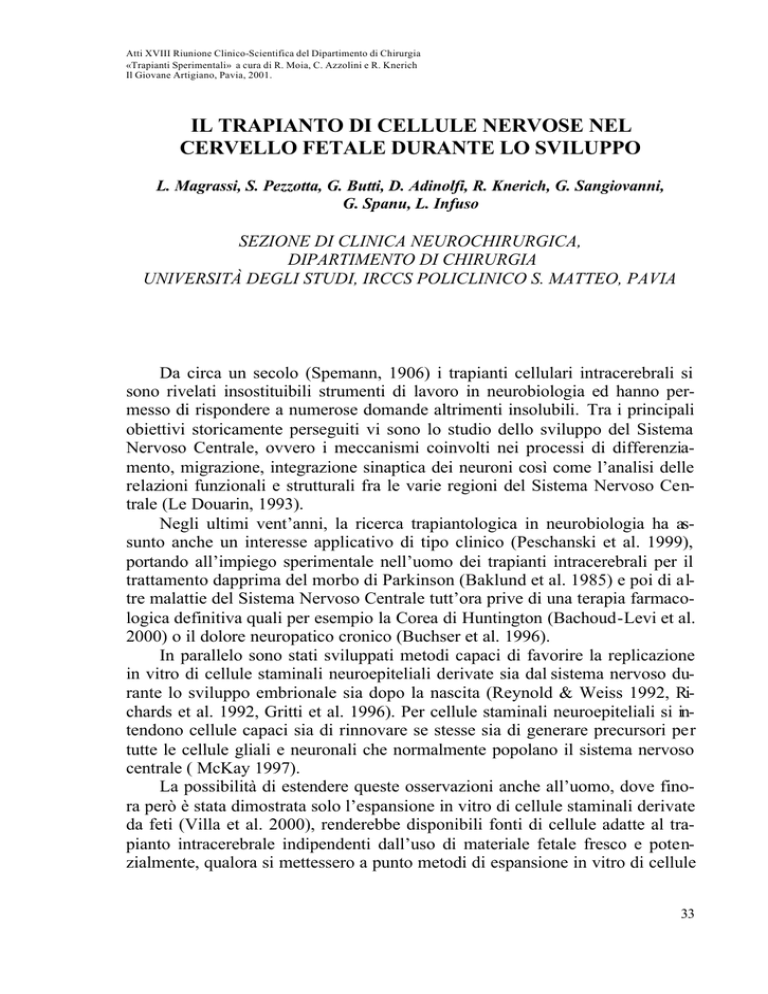 Atti XVIII Riunione Clinico-Scientifica del Dipartimento di Chirurgia «Trapianti Sperimentali» a cura di R. Moia, C. Azzolini e R. Knerich Il Giovane Artigiano, Pavia, 2001. IL TRAPIANTO DI CELLULE NERVOSE NEL CERVELLO FETALE DURANTE LO SVILUPPO L. Magrassi, S. Pezzotta, G. Butti, D. Adinolfi, R. Knerich, G. Sangiovanni, G. Spanu, L. Infuso SEZIONE DI CLINICA NEUROCHIRURGICA, DIPARTIMENTO DI CHIRURGIA UNIVERSITÀ DEGLI STUDI, IRCCS POLICLINICO S. MATTEO, PAVIA Da circa un secolo (Spemann, 1906) i trapianti cellulari intracerebrali si sono rivelati insostituibili strumenti di lavoro in neurobiologia ed hanno permesso di rispondere a numerose domande altrimenti insolubili. Tra i principali obiettivi storicamente perseguiti vi sono lo studio dello sviluppo del Sistema Nervoso Centrale, ovvero i meccanismi coinvolti nei processi di differenziamento, migrazione, integrazione sinaptica dei neuroni così come l’analisi delle relazioni funzionali e strutturali fra le varie regioni del Sistema Nervoso Centrale (Le Douarin, 1993). Negli ultimi vent’anni, la ricerca trapiantologica in neurobiologia ha assunto anche un interesse applicativo di tipo clinico (Peschanski et al. 1999), portando all’impiego sperimentale nell’uomo dei trapianti intracerebrali per il trattamento dapprima del morbo di Parkinson (Baklund et al. 1985) e poi di altre malattie del Sistema Nervoso Centrale tutt’ora prive di una terapia farmacologica definitiva quali per esempio la Corea di Huntington (Bachoud-Levi et al. 2000) o il dolore neuropatico cronico (Buchser et al. 1996). In parallelo sono stati sviluppati metodi capaci di favorire la replicazione in vitro di cellule staminali neuroepiteliali derivate sia dal sistema nervoso durante lo sviluppo embrionale sia dopo la nascita (Reynold & Weiss 1992, Richards et al. 1992, Gritti et al. 1996). Per cellule staminali neuroepiteliali si intendono cellule capaci sia di rinnovare se stesse sia di generare precursori per tutte le cellule gliali e neuronali che normalmente popolano il sistema nervoso centrale ( McKay 1997). La possibilità di estendere queste osservazioni anche all’uomo, dove finora però è stata dimostrata solo l’espansione in vitro di cellule staminali derivate da feti (Villa et al. 2000), renderebbe disponibili fonti di cellule adatte al trapianto intracerebrale indipendenti dall’uso di materiale fetale fresco e potenzialmente, qualora si mettessero a punto metodi di espansione in vitro di cellule 33 Atti XVIII Riunione Clinico-Scientifica del Dipartimento di Chirurgia «Trapianti Sperimentali» a cura di R. Moia, C. Azzolini e R. Knerich Il Giovane Artigiano, Pavia, 2001. staminali neuroepiteliali umane derivate dall’adulto, autologhe. Infatti, almeno teoricamente, la fonte ideale di cellule per un trapianto all’interno del Sistema Nervoso Centrale dovrebbe essere omologa (meglio se addirittura autologa), le cellule dovrebbero provenire da un unico individuo e dovrebbero essere sufficientemente indifferenziate e plastiche da poter assumere un fenotipo tipico della regione in cui vengono impiantate o da poter assumere un particolare fenotipo se pretrattate in vivo o in vitro in cond izioni differenziative opportune e riproducibili. In vista delle possibili applicazioni cliniche è perciò diventato indispensabile caratterizzare le condizioni di sopravvivenza e di differenziazione delle cellule staminali e dei precursori neuroepiteliali durante i loro diversi stadi maturativi, e la loro risposta dopo trapianto in particolare ectopico e/o eterocronico. Per studiare in condizioni ottimali le capacità differenziative dei precursori neuroepiteliali in vivo abbiamo sviluppato un metodo per il trapianto di cellule all’interno del sistema nervoso centrale di mammifero durante lo sviluppo intrauterino (Cattaneo 1994). In pratica questa tecnica prevede nei roditori una piccola laparotomia con esposizione alternata dei corni dell’utero in cui si possono facilmente distinguere ispettivamente le sedi d’impianto degli embrioni, successivamente mediante transilluminazione della parete uterina con fibra ottica si localizzano le strutture cefaliche fetali. Localizzati in trasparenza alcuni reperi encefalici fondamentali quali il seno saggitale superiore, i collicoli ed il IV ventricolo si procede al trapianto intracerebrale delle cellule neuroepiteliali risospese in un piccolo volume (1-2 ìl) mediante una micropipetta in vetro con cui si trapassano tutte le strutture (parete uterina, membrane gestazionali, cute, cranio e tessuto nervoso fetale). Regioni facilmente trapiantabili con questa tecnica sono rappresentate dal cervelletto, dai collicoli, dalla corteccia cerebrale, dai gangli della base, e dal sistema ventricolare. Con questa tecnica i precursori neuroepiteliali trapiantati sono in grado di integrarsi sia come cellule isolate sia come gruppi di cellule (cluster) all’interno del sistema nervoso dell’ospite (Cattaneo et al. 1994). Studi successivi hanno dimostrato che almeno alcune delle cellule trapiantate, fra quelle disperse nel cervello dell’ospite possono divenire neuroni con caratteristiche simili a quelle dei neuroni che li circondano (Brustle et al. 1995, Campbell et al. 1995, Magrassi 1996 a, b). Con la medesima tecnica sono state saggiate le capacità differenziative di cellule fetali umane impiantate nei ve ntricoli di ratti al 17°-18° giorno di gestazione che, nonostante si trattasse di trapianto eterologo, hanno dato origine a neuroni in tutto simili a quelli dell’ospite (Brustle et al. 1998). 34 Atti XVIII Riunione Clinico-Scientifica del Dipartimento di Chirurgia «Trapianti Sperimentali» a cura di R. Moia, C. Azzolini e R. Knerich Il Giovane Artigiano, Pavia, 2001. Questi risultati suggeriscono che le capacità differenziative dei precursori neuroepiteliali generati dopo trapianto di cellule staminali sono strettamente legate all’ambiente in cui si vengono a trovare e non alla sede da cui queste sono derivate (Ga