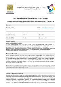 DIPARTIMENTO di ECONOMIA - DIEC Scuola di Scienze Sociali SCUOLA DI SCI ENZE SOCI ALI Microeconomia Avanzata cod. 41581 Corso di studi: Economia e Istituzioni Finanziarie Docenti Anna BOTTASSO – A.A. 2015/16 e-mail: [email protected] Anno di corso: 1 Sem: 1° Sede: Genova Area 13 SSD A1 - SECS-P/01 Cfu: 9 Ore lezione: 72 Obiettivi formativi Il corso ha come obiettivi principali di fornire gli strumenti teorici che permettono di capire quale è la logica delle scelte microeconomiche prese dagli agenti economici isolatamente e in contesti di interazione strategica; a tal fine verrà analizzata la metodologia di soluzione di problemi di ottimizzazione statica libera e vincolata che verrà applicata a diversi problemi di scelta del consumatore e dell’impresa. Le decisioni economiche in contesti di interazione strategica verranno analizzate utilizzando gli strumenti della teoria dei giochi. Programma/Contenuti Introduzione. Teoria dell’ottimizzazione statica libera e vincolata. Parte I. Teoria dell’Impresa. La funzione di produzione, la minimizzazione dei costi, la scelta di produzione ottimale, le funzioni di “risposta” e la statica comparata, il lungo periodo, l’impresa multiprodotto. Parte II. Forme di Mercato. Equilibrio di mercato di breve e lungo periodo in concorrenza perfetta, teoria del monopolio, discriminazione di prezzo, concorrenza mopolistica. Parte III. Intergazione strategica. Teoria dei giochi, equilibrio di Nash in strategie pure e miste, equilibrio di Nah perfetto nei sottogiochi, giochi sequenziali e ripetuti, Folk theorem, applicazioni alla teoria dell’oligopolio (modelli di Cournot, Bertrand, Stackelberg, Collusione, Entrata). Parte IV: Teoria del Consumo. Teoria dell’utilità, problema di ottimizzazione primale e duale, le funzioni di “risposta” e la statica comparata, il benessere del consumatore, la variazione equivalente e la variazione compensativa, l’equilibrio di mercato Eventuali propedeuticità e/o prerequisiti consigliati Si richiede la conoscenza dei contenuti di un corso base di microeconomia. DIPARTIMENTO di ECONOMIA - DIEC Scuola di Scienze Sociali SCUOLA DI SCI ENZE SOCI ALI Risultati di apprendimento previsti Conoscenza e comprensione Gli studenti devono acquisire le conoscenze teoriche e metodologiche che permettano di raggiungere un’adeguata capacità di comprensione dei meccanismi decisonali degli agenti economici, anche in contesti di interazione strategica. Capacità di applicare conoscenza e comprensione Gli studenti devono essere in grado di applicare le conoscenze acquisite e di comprendere e risolvere problemi sottostanti alle scelte microeconomichee e alle dinamiche di interazione tra agenti. Autonomia di giudizio Gli studenti devono saper utilizzare sia sul piano concettuale che su quello operativo le conoscenze acquisite con autonoma capacità di valutazione e con abilità nei diversi contesti applicativi. Abilità comunicative Gli studenti devono acquisire il linguaggio tecnico tipico della disciplina per comunicare in modo chiaro e senza ambiguità con interlocutori specialisti e non specialisti. Capacità di apprendimento Gli studenti devono sviluppare adeguate capacità di apprendimento che consentano loro di continuare ad approfondire in modo autonomo le principali tematiche della disciplina soprattutto nei contesti lavorativi in cui si troveranno ad operare. Modalità didattiche, obblighi, testi e modalità di accertamento. Modalità didattiche Presente su Si ☒ No ☐ Aulaweb Obblighi Testi di studio F. Cowell “Microeconomics”, Oxford University Press (parti che verranno specificate a lezione); Testo di Microcoeconomia base a scelta tra quelli consigliati a lezione. Modalità di Esame accertamento ☒ scritto ☐ orale ☐ altro: Ripetizione Non ci sono limiti alla possibilità di ripetere l’esame. dell’esame Informazioni aggiuntive per gli studenti non frequentanti Modalità didattiche Tenersi continuamente aggiornati attraverso aulaweb http://www.aulaweb.unige.it/ Concordare con docente appuntamenti finalizzati a integrare la preparazione. Obblighi Testi di studio F. Cowell “Microeconomics”, Oxford University Press (parti che verranno specificate a lezione); Testo di Microcoeconomia base a scelta tra quelli consigliati a lezione. Modalità di Esame accertamento ☒ scritto ☐ orale ☐ altro: Ripetizione Non ci sono limiti alla possibilità di ripetere l’esame. dell’esame DIPARTIMENTO di ECONOMIA - DIEC Scuola di Scienze Sociali SCUOLA DI SCI ENZE SOCI ALI For foreign students Course description The objective of the course is to provide the theoretical instruments which allow students to understand the rationale of microeconomic choices made apart and in strategic interaction frameworks by economic agents. Students will learn how to solve optimization problems (free and constrained) which will be applied to consumer and firm theory. Economic choices when strategic interaction is present will be analyzed with the game theory approach. Methodology Lectures Attendance Not compulsory Textbook and other See aulaweb http://www.aulaweb.unige.it/ and contact the teacher reccomended resources Assessment Note Written exam