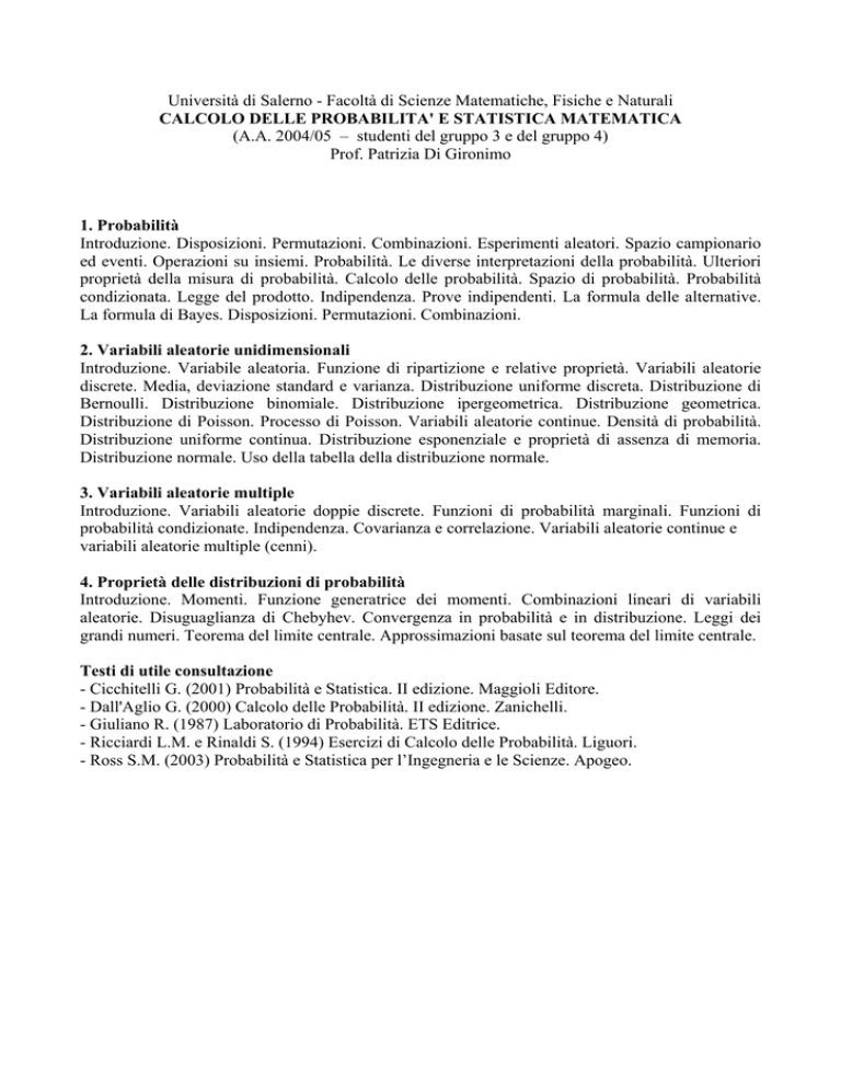 Università di Salerno - Facoltà di Scienze Matematiche, Fisiche e Naturali CALCOLO DELLE PROBABILITA' E STATISTICA MATEMATICA (A.A. 2004/05 – studenti del gruppo 3 e del gruppo 4) Prof. Patrizia Di Gironimo 1. Probabilità Introduzione. Disposizioni. Permutazioni. Combinazioni. Esperimenti aleatori. Spazio campionario ed eventi. Operazioni su insiemi. Probabilità. Le diverse interpretazioni della probabilità. Ulteriori proprietà della misura di probabilità. Calcolo delle probabilità. Spazio di probabilità. Probabilità condizionata. Legge del prodotto. Indipendenza. Prove indipendenti. La formula delle alternative. La formula di Bayes. Disposizioni. Permutazioni. Combinazioni. 2. Variabili aleatorie unidimensionali Introduzione. Variabile aleatoria. Funzione di ripartizione e relative proprietà. Variabili aleatorie discrete. Media, deviazione standard e varianza. Distribuzione uniforme discreta. Distribuzione di Bernoulli. Distribuzione binomiale. Distribuzione ipergeometrica. Distribuzione geometrica. Distribuzione di Poisson. Processo di Poisson. Variabili aleatorie continue. Densità di probabilità. Distribuzione uniforme continua. Distribuzione esponenziale e proprietà di assenza di memoria. Distribuzione normale. Uso della tabella della distribuzione normale. 3. Variabili aleatorie multiple Introduzione. Variabili aleatorie doppie discrete. Funzioni di probabilità marginali. Funzioni di probabilità condizionate. Indipendenza. Covarianza e correlazione. Variabili aleatorie continue e variabili aleatorie multiple (cenni). 4. Proprietà delle distribuzioni di probabilità Introduzione. Momenti. Funzione generatrice dei momenti. Combinazioni lineari di variabili aleatorie. Disuguaglianza di Chebyhev. Convergenza in probabilità e in distribuzione. Leggi dei grandi numeri. Teorema del limite centrale. Approssimazioni basate sul teorema del limite centrale. Testi di utile consultazione - Cicchitelli G. (2001) Probabilità e Statistica. II edizione. Maggioli Editore. - Dall'Aglio G. (2000) Calcolo delle Probabilità. II edizione. Zanichelli. - Giuliano R. (1987) Laboratorio di Probabilità. ETS Editrice. - Ricciardi L.M. e Rinaldi S. (1994) Esercizi di Calcolo delle Probabilità. Liguori. - Ross S.M. (2003) Probabilità e Statistica per l’Ingegneria e le Scienze. Apogeo.