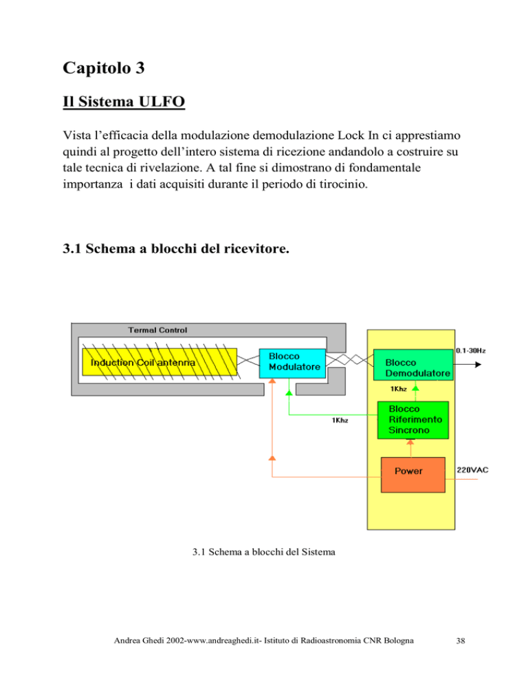 Capitolo 3 Il Sistema ULFO Vista l’efficacia della modulazione demodulazione Lock In ci apprestiamo quindi al progetto dell’intero sistema di ricezione andandolo a costruire su tale tecnica di rivelazione. A tal fine si dimostrano di fondamentale importanza i dati acquisiti durante il periodo di tirocinio. 3.1 Schema a blocchi del ricevitore. 3.1 Schema a blocchi del Sistema Andrea Ghedi 2002-www.andreaghedi.it- Istituto di Radioastronomia CNR Bologna 38 Il sistema è composto da due blocchi fondamentali (Fig.3.1): • Un box contenente l’antenna a Coil e l’unità Ricevitore-Modulatore. Poiché questa parte verrà installata in ambiente esterno è previsto che il blocco venga adeguatamente termostatato. • Un box Ricevitore-Demodulatore composto da tre blocchi fondamentali: un blocco unità centrale contenente il sistema di demodulazione, filtraggio e amplificazione; un blocco di generazione del riferimento sincrono a 1 Khz in onda quadra per il sistema Lock In, corredato di linea di ritardo; un blocco di alimentazione superstabilizzata e tamponata al fine di ottenere la reizione massima degli interferenti a 50 Hz. Il blocco modulatore e demodulatore sono interconnessi tra di loro tramite due cavi twistati schermati, che portano i segnali ricevuti, il segnale di modulazione e da una coppia di potenza che porta l’alimentazione “superstabilizzata” e “tamponata”, cioè proveniente da un sistema di accomulatori a tampone, i connettori impiegati sono di tipo militare multipolari ermetici. Cuore dell’architettura è il sistema Lock-in (Rif. Cap. 2) che permette di eliminare tutti gli effetti strumentali di drift (entro il periodo di modulazione) e offset generati all’interno dell’anello modulatoredemodulatore. Il principio consiste nel modulare il segnale a BF da amplificare, a frequenza video traslando la frequenza originaria del segnale al di sopra della frequenza di ginocchio f knee del ricevitore. A questa frequenza si effettua l’amplificazione e il filtraggio per aumentare il rapporto S/N. Al termine si effettua la demodulazione “sincrona” del segnale. La frequenza tipica con cui si miscela il segnale è 1KHz ad onda quadra. Andrea Ghedi 2002-www.andreaghedi.it- Istituto di Radioastronomia CNR Bologna 39 Le specifiche del ricevitore saranno le seguenti: Parametri fondamentali ricevitore U.L.F.O. Guadagno complessivo Variabile in base alle applicazioni. Frequenza massima 30Hz Dinamica Più ampia possibile in relazione all’esperimento f knee <0.1 Hz Guadagno totale Variabile ≈ da 30÷210 Lineare , 30÷45 dB L’impiego Full-Time di una stazione ricevente di questo tipo, al fine di poter monitorare continuamente i fenomeni di interesse nella banda e far in modo che essi vengano segnalati o a un sistema di registrazione automatico o all’operatore, a spinto il progetto finale verso una soluzione di stazione ricevente a correlazione (Fig. 3.2). Il sistema ULFO (Ultra Low Frequency Observatory) è stato pensato in questo modo: esso si compone di due gruppi di ricezione e di due antenne indipendenti. I segnali ricevuti vengono correlati mediante un moltiplicatore e un filtro passa basso. Lo stadio di correlazione fornisce un valore continuo che è proporzionale alla potenza di un eventuale segnale coerente ricevuto dalle due antenne. Il risultato del correlatore potrebbe essere inviato ad calcolatore elettronico, che con un software ad hoc, registrerebbe solo i segnali di interesse. In questo modo si aumenterebbe la reiezione dei segnali interferenti individuati, minimizzando la registrazione ai soli segnali “d’interesse scientifico”. Andrea Ghedi 2002-www.andreaghedi.it- Istituto di Radioastronomia CNR Bologna 40 3.2 Schema a blocchi della possibile implementazione finale di stazione automatica. Andrea Ghedi 2002-www.andreaghedi.it- Istituto di Radioastronomia CNR Bologna 41 Capitolo 4 L’unità modulatore 4.1 Architettura e scelta dei componenti. Fig. 4.1 Schema a blocchi del Modulatore L’unità di ricezione e modulazione è stata così studiata (Fig. 4.1). Il segnale che proviene dall’antenna incontra un primo stadio di protezione. Al fine di evitare che eventuali scariche elettrostatiche, accoppiandosi con l’antenna a coil, possano distruggere i circuiti elettronici o mettere in pericolo l’incolumità dell’operatore nelle vicinanze della stazione, sono stati inseriti dei componenti che scaricano a terra le eventuali sovratensioni; la nostra scelta è caduta sui TRANZORB, in particolare l’ 1N6373 della Vishay Semiconductor, General Semiconductor capace di tagliare tensioni fino a 1500 V. Andrea Ghedi 2002-www.andreaghedi.it- Istituto di Radioastronomia CNR Bologna 42 Il debole segnale proveniente dall’antenna ha ora la necessità di essere amplificato, le nostre specifiche richiedono buone prestazioni di rumore e una bassa frequenza di ginocchio. Il guadagno dell’intero blocco dovrebbe aggirarsi attorno a 100 (lineare) ma con la possibilità di essere variabile. Tale stadio è il più critico, in quanto il segnale da esso generato viene amplificato dal resto della catena ed ha inoltre lo svantaggio di essere posto all’esterno dell’anello Lock In. A tal fine la scelta è ricaduta su un Instrumentation amplifier; questo è un dispositivo realizzato con tre amplificatori operazionali, che ha la caratteristica di amplificare solo la componente di modo differenziale del segnale all’ingresso. Entrambi gli ingressi hanno la medesima impedenza (con una tolleranza molto bassa) e le resistenze sono integrate e calibrate nel chip. Ciò garantisce una precisione molto elevata per quanto riguarda la simmetria del dispositivo. L’integrato utilizzato è INA-110 prodotto dalla Burr-Brown definito come “Very Accurancy Instrumentation Amplifier”. In appendice sono riportate in dettaglio le specifiche relative a questo dispositivo. Si presenta ora la necessità di effettuare un accurato filtraggio del segnale in ingresso, poiché quello che 