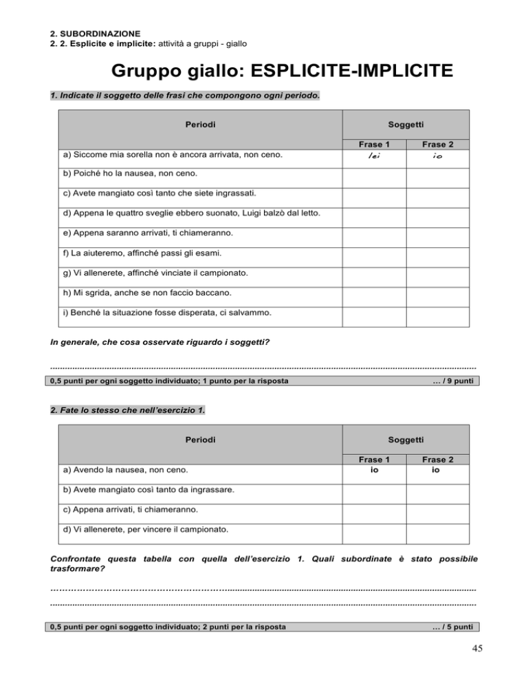 2. SUBORDINAZIONE 2. 2. Esplicite e implicite: attività a gruppi - giallo Gruppo giallo: ESPLICITE-IMPLICITE 1. Indicate il soggetto delle frasi che compongono ogni periodo. Periodi a) Siccome mia sorella non è ancora arrivata, non ceno. Soggetti Frase 1 lei Frase 2 io b) Poiché ho la nausea, non ceno. c) Avete mangiato così tanto che siete ingrassati. d) Appena le quattro sveglie ebbero suonato, Luigi balzò dal letto. e) Appena saranno arrivati, ti chiameranno. f) La aiuteremo, affinché passi gli esami. g) Vi allenerete, affinché vinciate il campionato. h) Mi sgrida, anche se non faccio baccano. i) Benché la situazione fosse disperata, ci salvammo. In generale, che cosa osservate riguardo i soggetti? ............................................................................................................................................................................. 0,5 punti per ogni soggetto individuato; 1 punto per la risposta … / 9 punti 2. Fate lo stesso che nellʼesercizio 1. Periodi a) Avendo la nausea, non ceno. Soggetti Frase 1 io Frase 2 io b) Avete mangiato così tanto da ingrassare. c) Appena arrivati, ti chiameranno. d) Vi allenerete, per vincere il campionato. Confrontate questa tabella con quella dellʼesercizio 1. Quali subordinate è stato possibile trasformare? ……………………………………………………..................................................................................................... ............................................................................................................................................................................. 0,5 punti per ogni soggetto individuato; 2 punti per la risposta … / 5 punti 45 2. SUBORDINAZIONE 2. 2. Esplicite e implicite: attività a gruppi - giallo 3. Fornite le informazioni richieste che riguardano la frase evidenziata. Lʼesercizio è avviato. Es. Pur studiando in continuazione, ottenevo delle brutte note in matematica. Modo e tempo del verbo: gerundio presente Soggetto nascosto: io a) Colpito dalla bellezza dellʼedificio, lui lo contemplò a lungo. Modo e tempo del verbo: ……………………………………………… Soggetto nascosto: ……………………………………………… b) Ripensando alle sue vacanze natalizie, diventa molto malinconica. Modo e tempo del verbo: ……………………………………………… Soggetto nascosto: ……………………………………………… c) Eravamo così terrorizzati da tremare come foglie. Modo e tempo del verbo: ……………………………………………… Soggetto nascosto: ……………………………………………… d) Suo nonno ebbe la medaglia per aver combattuto in guerra. Modo e tempo del verbo: ……………………………………………… Soggetto nascosto: ……………………………………………… Nelle frasi evidenziate sono stati utilizzati dei modi verbali ................................... (gerundio, ................................. , .....................................). Queste subordinate vengono chiamate implicite perché ........................................................................... ……………………………………………………………………………………………………………………………… ……………………………………………………………………………………………………………………………… 1 punto per ogni risposta corretta; 2 punti per lʼultima domanda … / 13 punti 46 2. SUBORDINAZIONE 2. 2. Esplicite e implicite: attività a gruppi - giallo 4. Trasformate le subordinate implicite (quelle che non indicano il soggetto) in esplicite (ossia quelle che indicano esplicitamente il soggetto). es.: Raggiunto lʼavversario, lo superò con uno scatto. Dopo che aveva raggiunto lʼavversario, lo superò con uno scatto. a) Andando a scuola, ho incontrato Pinuccio. b) Essendo molto triste, mi sono rinchiuso in camera. c) Terminata la prova, fece un sorriso smagliante. d) Era talmente ricco da poter acquistare una Ferrari. e) Pur ammirando quellʼuomo, ne avevo unʼistintiva diffidenza. f) Dopo che ebbero dichiarato di non avere ucciso nessuno, se ne andarono. Riguardo il soggetto, si può osservare che quello delle subordinate implicite è sempre……………….. ............................................................................................................................................................................. 1,5 punti per ogni trasformazione corretta; 1 punto per la frase nel riquadro … / 10 punti 5. Trasformate la subordinata esplicita in implicita. In tre casi questa trasformazione non è possibile. es.: Mentre passeggiavo per il viale, ho sorpreso la mia ragazza con un altro. Passeggiando per il viale, ho sorpreso la mia ragazza con un altro. a) Quando aprirono la porta, trovarono il cadavere. b) Siccome mia madre e mia sorella avevano lʼinfluenza, feci le pulizie in casa. c) Anche se sono molto disordinato, ho ritrovato i miei libri in camera. d) Appena è arrivata mia madre, sono partito con il motorino. e) Hai pagato caro il tuo errore, perché sei stata troppo ingenua. 47 2. SUBORDINAZIONE 2. 2. Esplicite e implicite: attività a gruppi - giallo e) Gli diedi una mano, affinché terminasse il suo lavoro. Si può trasformare una subordinata esplicita in implicita a condizione che ........................................... ....................................................................................................................................................................... ...................................................................................................................................................................... 1,5 punti per trasformazione; 2 punti per la frase nel riquadro … / 11 punti 6. Completa il periodo con una proposizione esplicita ed una impli