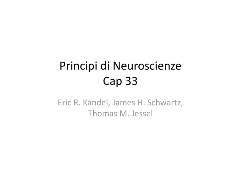 Principi di Neuroscienze Cap 33 Eric R. Kandel, James H. Schwartz, Thomas M. Jessel L’organizzazione del movimento • I sistemi motori generano movimenF riflessi, ritmici e volontari • I movimenF volontari sono regolaF da principi di natura psicofisica • I sistemi motori sono organizzaF in maniera gerarchica • Il movimento viene eseguito dai motoneuroni spinali • Il tronco dell’encefalo modula l’azione dei circuiF spinali • La corteccia cerebrale modula l’azione dei motneuroni del tronco dell’encefalo e del midollo spinale I sistemi motori generano movimenF riflessi, ritmici e volontari • • • • Diverse categorie di movimenF: Riflessi Ritmici Volontari I movimenF Riflessi • I riflessi sono schemi coordinaF involontari di contrazioni e rilasciamenF muscolari prodoN da sFmoli periferici – Si osservano in animali decerebraF – Le caraOerisFche spaziali e temporali delle contrazioni muscolari dipendono dai receOori sensoriali che vengono sFmolaF • I receOori muscolari generano riflessi da sFramento • I receOori cutanei producono riflessi di retrazione I movimenF ritmici • MovimenF ritmici sono: – MasFcazione – DegluFzione – Locomozione • Contrazioni alternate dei flessori e degli estensoridi entrambi i laF del corpo • I circuiF preposF si trovano nel midollo spinale • Possono manifestarsi spontaneamente o possono essere generate da sFmoli periferici che aNvano i circuiF che le mediano MovimenF volontari • A differenza dei riflessi i movimenF volontari si propongono di raggiungere uno scopo specifico (premere il pedale di un freno, afferrare una palla) – Sono soggeN ad apprendimento – Prevengono e correggono perturbazioni Correggere e prevenire le perturbazioni • Due sono le modalità uFlizzate dal sistema nervoso: • 1‐ UFlizzare i segnali sensoriali (controllo a feedback o servo‐controllo) • 2‐ UFlizzare informazioni di una o più modalità diverse per rilevare le perturbazioni in arrivo e meOere in aOo, prima dell’inizio del movimento, strategie di movimento basate sull’esperienza pregressa (feed‐forward) Feedback • Nel controllo a feedback i segnali provenienF dai recOori di senso vengono confrontaF con la condizione che si desidera mantenere. • La differenza fra quesF due segnali è deOa segnale di errore, viene uFlizzata per regolare l’uscita motoria. Esempio di feedback (Controllo a circuito chiuso) • Sistema di riscaldamento – Parte che definisce lo scopo: termostato (definizione della temperatura) – Parte che rileva la temperatura dell’ambiente (sensori/feedback) – Parte che confronta la temperatura aOuale e quella che si vuole raggiungere – Correzione della discrepanza (errore) LimiF del feedback • Il tempo necessario per trasmeOere i segnali all’interno del circuito può essere grande – Ritardo di fase – Se le condizioni esterne cambiano rapidamente ed il ritardo di fase è grande le correzioni date dal feedback possono essere inappropriate – Per questo il controllo a feedback è parFcolarmente applicato per il mantenimento delle posture e per la modulazione della forza (afferrare oggeN) ReceOori e feedback • Azioni di mantenimento delle posture e di modulazione di forza: 1. MeccanoceOori (fusi neuromuscolari organi tendinei del golgi eccetera). Propriocezione 2. Afferenze cutanee. Percezione taNle Esempi • PazienF che presentano lesioni alle fibre che ritrasmeOono i segnali ai meccanoreceOori – Non sono in grado di avverFre i propri movimenF, mantenere oggeN fra le mani, non riescono a modulare la forza • AtleF di elite (Fro a segno) – Hanno una alta capacità di mantenere la posizione degli arF nello spazio e di modulare la forza Feed‐forward (Controllo a circuito aperto) • Sono sistemi di controllo anFcipatori e agiscono prima che le perturbazioni divenFno operaFve • Sono sistemi a circuito aperto (possono influenzare e cambiare il feedback) • Le informazioni provengono sia dagli organi di senso che dall’esperienza pregressa • Controllano sia le posture che i movimenF Esempio: Controllo della postura • Sollevare il braccio stando in piedi: i muscoli delle gambe si contraggono prima di quelli delle braccia per controllare lo spostamento del centro di massa • Stando semplicemente in piedi: la contrazione dei muscoli è conFnua per compensare anche i minimi cambiamenF del centro di massa. Il ruolo dell’esperienza • Afferrare una palla è una risposta a feed‐ forward avviata da un segnale visivo • Il segnale visivo viene uFlizzato per predirre il percorso della palla. – La posizione – Il tempo di percorrenza – La forza necessaria • L’esperienza pregressa permeOe una correOa anFcipazione (fig 33.2) Feed‐forward e feedback • Se prima di afferrare la palla il meccanismo è a feed‐forward appena la palla tocca la mano entra in gioco il feedback – ImpaOo mano‐palla crea uno sFramento rapido del muscolo – Evoca un riflesso controllato da circuiF spinali – Il muscolo sFrato si contrae cos’ì il suo antagonista – Le due contrazioni rendono più rigida l’arFcolazione bloccando la postura Controllo a feedforward e Coinvolgimento del feedback I movimenF volontari sono regolaF da principi di natura psicofisica • MovimenF diversi a seconda degli effeOori uFlizzaF – Il tempo di risposta motoria ad uno sFmolo dipende dalla quanFtà di informazione che deve essere analizzata – La velocità di esecuzione di un movimento è inversamente correlata alla precisione (vedi successivamente la legge di FiOs) I movimenF volontari possiedono alcune caraOerisFche invarianF e sono generaF da programmi motori • Equivalenza motoria : esempio la nostra scriOura rimane pressochè invariata a prescindere dalla sua ampiezza o dall’effeOore usato Esempio la scriOura di Raibert (1977). A:Manodx; B:bracciodx; C: manosx D: labbra;E: piededx Che cosa suggerisce? • Il movimento direOo ad uno scopo è rappresentato a livello cerebrale in forma astra