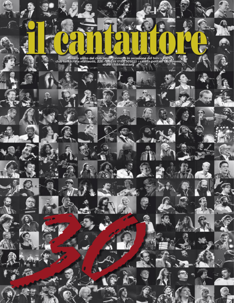 il cantautore numero unico del club tenco sanremo in occasione del tenco 2005 club tenco - via matteotti, 226 - tel/fax 0184.505011 - casella postale 1, sanremo www.clubtenco.org 30 30 il cantautore Tencotrenta di Enrico de Angelis L a sappiamo già la critica che verrà rivolta al Tenco 2005. Troppo rivolto al passato. Certo che è rivolto al passato. La Rassegna compie trent’anni, volete che non le mettiamo queste trenta candeline sulla torta, che non stiamo lì a riguardarcele orgogliosi? Una volta ogni trent’anni ci possiamo permettere di festeggiare noi stessi, di riconsiderare quel che abbiamo fatto, di gingillarci in mano il nostro giocattolo e ammirarlo. Ecco, è questo il “tema” di quest’anno. Poi per una ventina d’anni non lo faremo più. Tutto questo, però, con scelte mirate, con leggerezza, anche con humour, così almeno ci sembra; e soprattutto grazie a tutti gli artisti che, quest’anno in particolare, “ci stanno”, che vengono a trovarci per testimoniare il loro appoggio di sempre, la loro complicità in questa offensiva avviata da Amilcare quando ancora loro, i cantautori, non li voleva nessuno, erano al margine, all’opposizione. Amilcare se n’è andato giusto dieci anni fa e per fortuna ha fatto in tempo a vedere che ce l’avevamo fatta, che anche col nostro apporto la canzone d’autore si è proiettata non solo nei piani alti delle classifiche di vendita ma anche nel cuore della gente, in quell’angolo che una volta era occupato dalla poesia, anzi in un comune sentimento ancora più ampio e popolare. Ecco perché il primo Premio Tenco che ci è venuto in mente di assegnare l’abbiamo destinato a Fernanda Pivano, vecchia compagna di giochi fin dal convegno “nuova canzone” del 1976. E per trovare i Premi Tenco ai cantautori abbiamo percorso le nostre due direzioni classiche: il grande mondo occidentale del rock, con John Cale, fondatore con Lou Reed dei Velvet Underground, e quel “resto del mondo” che sono le etnie minoritarie, con il raï algerino di Khaled. Abbiamo poi riconvocato i quattro vecchi amici che hanno fatto la storia del Tenco: Paolo Conte (non faceva più festival, ha fatto un’eccezione per noi), Francesco Guccini (finalmente di nuovo in teatro, e non solo nel dopoteatro), Roberto Vecchioni (l’immancabile si porta stavolta due ex Area, Patrizio Fariselli e Paolino Dalla Porta, e Pamela Villoresi come Trent’anni dopo (quasi come Dumas) voce recitante); e Gino Paoli, al quale affidiamo il ricordo di Sergio Endrigo, un grande-grandissimo che ancora rivediamo ridere e piangere in prima fila alla Rassegna del 2001, ascoltando le sue stesse canzoni che i partecipanti di quell’edizione gli dedicarono. Ancora, volevamo con noi tutti quegli artisti che abbiamo in qualche modo “scoperto” e che poi hanno proseguito con fortuna la loro strada. Alcuni (come Gianna Nannini o Vinicio Capossela) non potevano essere presenti. Ma rimanevano comunque tanti, non avremmo potuto offrire uno spazio adeguato a tutti. Allora ne abbiamo presi sei e li abbiamo pregati di riunirsi tutti insieme sul palco, con un solo strumento, e di fare quel che di solito non facciamo mai fare ai cantautori: eseguire una sola canzone a testa, esemplificativa della loro storia nata al Tenco. Ciascuno ad ascoltare con umiltà e generosità la canzone dell’altro. Hanno accettato. Sono Francesco Baccini, Samuele Bersani, Sergio Cammariere, Morgan, Daniele Silvestri e Davide Van de Sfroos. Ma la vera e propria autocelebrazione della Rassegna sarà autoironica, e con questo ci pariamo il fondoschiena dalle critiche più sussiegose. Risentiremo molte belle canzoni di importanti cantautori passati di qui, ma avendole affidate alla Banda Osiris, a Stefano Bollani, a David Riondino e al Quartetto Euphoria potete immaginare che cosa ne verrà fuori. Delle Targhe Tenco, a parte i già citati Conte e Morgan (rispettivamente miglior canzone e migliore interprete), ha accettato il nostro invito Enzo Jannacci, per aver rifatto in maniera superlativa i suoi capolavori in milanese degli anni ’60: dunque, il miglior disco in dialetto. Ci sono comunque delle new entry. E la più importante si chiama Massimo Ranieri, che corona così la magnifica trilogia discografica sulla canzone napoletana arrangiatagli da Mauro Pagani. Ma dal vivo Mauro non lo ha mai accompagnato. Eccoli allora qui tutti e due, ad interagire tra loro. Le altre due new entry sono il ponte per l’avvenire, giusto per non fermarci totalmente sul passato. Abbiamo ascoltato centinaia di artisti giovani, e abbiamo individuato due nomi che sono le nostre proposte per il futuro: il gruppo dei Farabrutto e Pino Marino. Nessuno dei due di primo pelo, ma proprio per questo hanno già saputo elaborare dei linguaggi nuovi che possono servire per guardare avanti. “New entry” è anche il tappabuchi di quest’anno: Alberto Patrucco. Uno che diverte ma che per l’occasione tirerà fuori dal cassetto le sue canzoni segrete. 2 Il gran finale è in linea con tutta la nostra storia: un segnale di coesistenza pacifica tra popoli, civiltà, culture diverse attraverso l’Orchestra di Piazza Vittorio, integrata da altri artisti che in essa si intrecciano spesso, ovvero gli Avion Travel, il duo Petra Magoni-Ferruccio Spinetti, il Quartetto Euphoria. In tutto una ventina di musicisti provenienti, oltre che dall’Italia, da India, Tunisia, Marocco, Senegal, Ungheria, Stati Uniti, Cuba, Ecuador e Argentina. Il Tenco non finisce qui. Gli intoccabili incontri di mezzogiorno con gli artisti saranno integrati dalla presentazione di alcune nostre creature: il sospirato libro fotografico di Roberto Coggiola “Quelle facce un po’ così” e, sotto il comune titolo “Seguendo Virgilio”, un cd e un libro intorno a Virgilio Savona, nelle testimonianze degli artisti e dei relatori che hanno partecipato alla Rassegna dell’anno scorso. Non prendetevi impegni nei tre pomeriggi. C’è una sequela spettacolare di ascolti, proiez