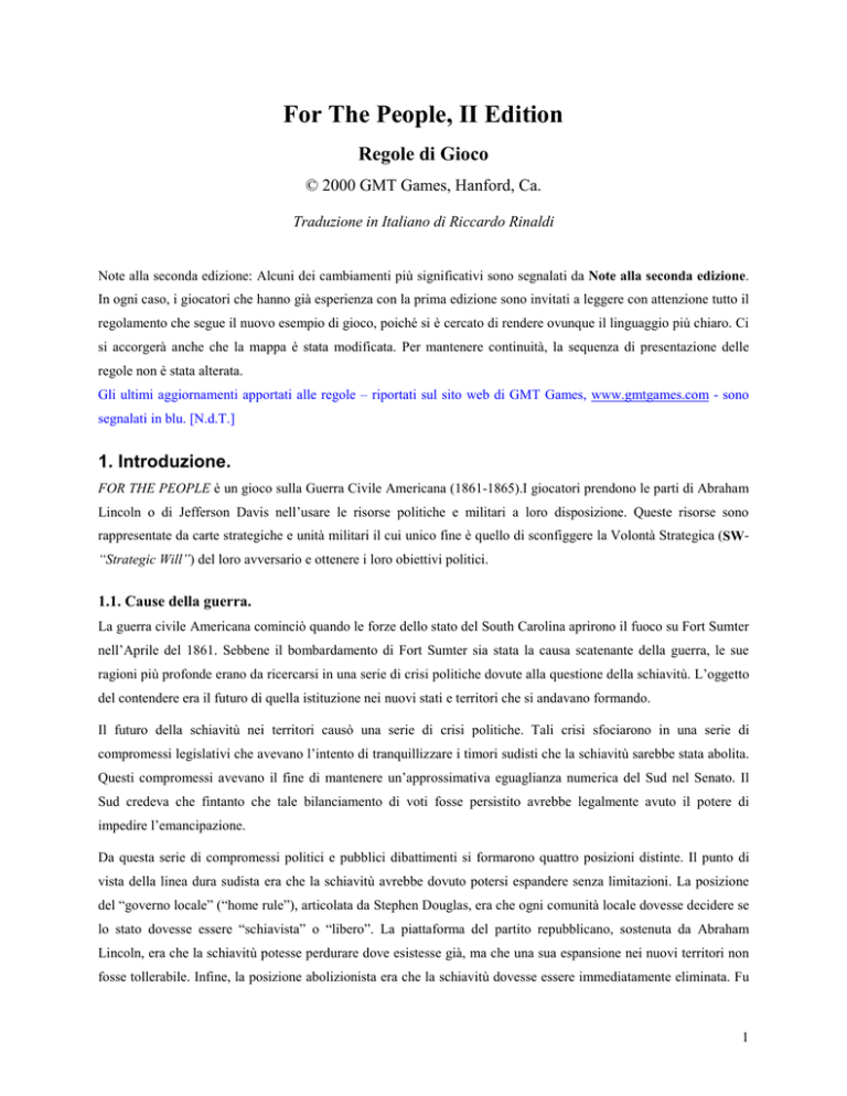 For The People, II Edition Regole di Gioco © 2000 GMT Games, Hanford, Ca. Traduzione in Italiano di Riccardo Rinaldi Note alla seconda edizione: Alcuni dei cambiamenti più significativi sono segnalati da Note alla seconda edizione. In ogni caso, i giocatori che hanno già esperienza con la prima edizione sono invitati a leggere con attenzione tutto il regolamento che segue il nuovo esempio di gioco, poiché si è cercato di rendere ovunque il linguaggio più chiaro. Ci si accorgerà anche che la mappa è stata modificata. Per mantenere continuità, la sequenza di presentazione delle regole non è stata alterata. Gli ultimi aggiornamenti apportati alle regole – riportati sul sito web di GMT Games, www.gmtgames.com - sono segnalati in blu. [N.d.T.] 1. Introduzione. FOR THE PEOPLE è un gioco sulla Guerra Civile Americana (1861-1865).I giocatori prendono le parti di Abraham Lincoln o di Jefferson Davis nell’usare le risorse politiche e militari a loro disposizione. Queste risorse sono rappresentate da carte strategiche e unità militari il cui unico fine è quello di sconfiggere la Volontà Strategica (SW“Strategic Will”) del loro avversario e ottenere i loro obiettivi politici. 1.1. Cause della guerra. La guerra civile Americana cominciò quando le forze dello stato del South Carolina aprirono il fuoco su Fort Sumter nell’Aprile del 1861. Sebbene il bombardamento di Fort Sumter sia stata la causa scatenante della guerra, le sue ragioni più profonde erano da ricercarsi in una serie di crisi politiche dovute alla questione della schiavitù. L’oggetto del contendere era il futuro di quella istituzione nei nuovi stati e territori che si andavano formando. Il futuro della schiavitù nei territori causò una serie di crisi politiche. Tali crisi sfociarono in una serie di compromessi legislativi che avevano l’intento di tranquillizzare i timori sudisti che la schiavitù sarebbe stata abolita. Questi compromessi avevano il fine di mantenere un’approssimativa eguaglianza numerica del Sud nel Senato. Il Sud credeva che fintanto che tale bilanciamento di voti fosse persistito avrebbe legalmente avuto il potere di impedire l’emancipazione. Da questa serie di compromessi politici e pubblici dibattimenti si formarono quattro posizioni distinte. Il punto di vista della linea dura sudista era che la schiavitù avrebbe dovuto potersi espandere senza limitazioni. La posizione del “governo locale” (“home rule”), articolata da Stephen Douglas, era che ogni comunità locale dovesse decidere se lo stato dovesse essere “schiavista” o “libero”. La piattaforma del partito repubblicano, sostenuta da Abraham Lincoln, era che la schiavitù potesse perdurare dove esistesse già, ma che una sua espansione nei nuovi territori non fosse tollerabile. Infine, la posizione abolizionista era che la schiavitù dovesse essere immediatamente eliminata. Fu 1 l’evoluzione di queste quattro posizioni che determinò il collasso del sistema bipartitico quando il partito Whig si frammentò negli anni ‘50. Dalle ceneri del partito Whig nacque il partito repubblicano, che mise a fuoco ed acuì i contrasti regionali associati alla schiavitù. Le elezioni del 1860 videro ognuno dei quattro candidati [in lizza] a rappresentare una di queste posizioni. L’attrazione esercitata dal partito repubblicano sui moderati culminò nell’elezione di Abraham Lincoln alla presidenza. L’elezione di Lincoln portò ad una crisi verso la secessione quando il South Carolina dichiarò di separarsi dagli Stati Uniti. Parecchi altri Stati ne seguirono l’esempio, andando a formare gli Stati confederati d’America. Comportandosi prudentemente, Lincoln non agì subito, cercando di mantenere gli Stati di confine nell’Unione mentre manovrava affinché fossero gli appena dichiarati Stati confederati d’America ad iniziare le ostilità e l’aperta ribellione. È a questo punto che il gioco inizia in FOR THE PEOPLE. Dopo più di due anni di sanguinosa guerra civile, il presidente Lincoln dedicò un cimitero sul campo di battaglia di Gettysburg con il famoso intendimento del suo discorso, che “un governo del popolo, [gestito] dal popolo, per il popolo, non debba scomparire da questa terra”. Si sbagliava quando affermò che il mondo si sarebbe “curato poco e non [avrebbe] ricordato a lungo quello che diciamo qui”. Il Discorso di Lincoln a Gettysburg Quattro lustri e sette anni fa i nostri padri crearono su questo continente una nuova nazione, concepita nella libertà, e fondata sull’affermazione che tutti gli uomini sono creati uguali. Ora siamo nel mezzo di una grande guerra civile, che proverà se tale nazione, o qualunque nazione così concepita e così fondata, possa durare a lungo. Ci troviamo qui sul luogo di una grande battaglia di questa guerra. Siamo venuti per dedicare una parte di esso a luogo di ultimo riposo per coloro che qui diedero le loro vite affinché quella nazione potesse vivere. È del tutto giusto ed adeguato che noi lo si faccia. Ma, in un senso più ampio, noi non possiamo dedicare – non possiamo consacrare – non possiamo onorare - questo luogo. Gli uomini coraggiosi, vivi o morti, che hanno combattuto qui lo hanno consacrato molto più in alto delle nostre misere capacità di aggiungervi o sottrarvi [qualcosa].Il mondo si curerà poco e non ricorderà a lungo quello che diciamo qui, ma non potrà mai dimenticare ciò che essi hanno fatto qui. Piuttosto noi, i vivi, dobbiamo dedicarci qui al lavoro incompiuto che coloro che hanno combattuto qui hanno, finora, portato avanti così nobilmente. Siamo piuttosto noi a doverci dedicare al grande compito che ci è davanti – che da questi morti che onoriamo assumiamo un ulteriore impegno verso la causa per la quale essi diedero l'estrema prova della loro impegno; che qui noi proponiamo che questi morti non siano morti invano; che questa nazione, sotto gli auspici di Dio, veda una nuova nascita di libertà; e che questo governo, del po