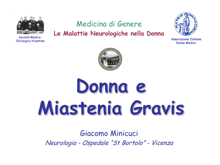 Medicina di Genere Società MedicoChirurgica Vicentina Le Malattie Neurologiche nella Donna Associazione Italiana Donne Medico Donna e Miastenia Gravis Giacomo Minicuci Neurologia - Ospedale “St Bortolo” - Vicenza Malattie autoimmuni immunità umorale (anticorpi) agenti infettivi self immunità cellulo-mediata (linfociti) • sistema immunitario: funzione di protezione contro gli agenti infettivi • autoimmunità: reazione del SI contro antigeni del proprio organismo self • oltre 80 malattie autoimmuni, alcune organo-specifiche altre multi-organo Timo linfocita T • organo linfoide del mediastino che va incontro ad atrofia con l’età • è necessario per lo sviluppo della tolleranza centrale contro il self • la tolleranza avviene mediante selezione positiva e negativa di linfociti T Sex bias donne con più malattie autoimmuni per: • più alti livelli di anticorpi circolanti • più alti livelli di linfociti T CD4+ • più alta produzione di citochine estrogeni stimolano la risposta immunitaria adrogeni/progesterone inibiscono la risposta immunitaria Miastenia Gravis è un disturbo della giunzione neuromuscolare caratterizzato da: • presenza di auto-anticorpi contro proteine post-sinaptiche • esauribilità muscolare: deficit di forza fluttuante aggravato dall’esercizio e migliorato dal riposo • alta frequenza di associazione con patologia timica • • • • potenziale pre-sinaptico liberazione di Ach apertura degli AChR potenziale di placca Motoneurone soglia • • apertura dei canali del Na+ potenziale d’azione AChR (recettore dell’acetilcolina) MuSK (chinasi muscolo-specifica): necessaria per la formazioni ed il mantenimento dei cluster di AChR Fibra muscolare Patogenesi la quantità di ACh rilasciata decresce durante l’esercizio Nella MG la quantità di ACh rilasciata è normale, ma: • la diminuzione degli AChR causa minor ampiezza dei potenziali di placca (end-plate-potential) • durante l’esercizio l’EPP non supera la soglia per generare il potenziale d’azione muscolare Esauribilità muscolare peggiora con esercizio recupera con il riposo • fluttuazioni cliniche, con usuale peggioramento nelle ore serali • • non associati dolore o parestesie o iperCKemia cuore, intestino e vescica (ma anche utero!) sono preservati Cause di esacerbazione • patologie sistemiche o infettive, aumento temperatura corporea • riduzione dei farmaci (anticolinesterasici o immunosoppressori) • farmaci che peggiorano la trasmissione neuromuscolare Antibiotici Antiaritmici Antireumatici Anestetici Aminoglicosidi B-bloccanti Clorochina Procaina Macrolidi Ca-antagonisti Penicillamina Succinilcolina Fuorochinolonici Procainamide eccesso di AChEI Litio Benzodiazepine crisi colinergica Zyklon B deficit assente/sfumato di base si accentua dopo affaticamento • marcata variabilità del quadro clinico: con il riposo perfino asintomatici! • i muscoli oculari estrinseci sono quelli più frequentemente colpiti • nella maggior parte dei casi, entro 3 anni, la MG diviene generalizzata • • • • deficit di forza distale e prossimale agli arti deficit assiale (interessamento dei muscoli del collo) rinolalia, disfagia, difficoltà nella masticazione crisi miasteniche con insufficienza respiratoria! Classificazione MGFA I II Miastenia oculare Lieve III Moderato IV Grave V a prevalentemente agli arti o assiale b prevalentemente bulbare a prevalentemente agli arti o assiale b prevalentemente bulbare a prevalentemente agli arti o assiale b prevalentemente bulbare con necessità di SNG Insufficienza respiratoria con necessità di intubazione, eccetto quando impiegata nella routine post-operatoria Figure. (A) A 61-year-old woman with marked generalized myasthenia gravis, 2 days after plasma exchange treatment, with only minimal spontaneous ptosis at baseline. Toyka K V Neurology 2006;67:1524-1524 ©2006 by Lippincott Williams & Wilkins Diagnosi differenziale Patologie centrali Patologie periferiche cPEO Steinert • • • • ischemia cerebrale aneurismi sclerosi multipla SLA • sd Lambert-Eaton • botulismo • diabete • sd Guillain-Barré • miopatie Oculofaringea FSHD Epidemiologia Prevalenza: 85-125 x milione Incidenza annuale: 2-4/100000 Due picchi di esordio: Oculare Generalizzata AChR 50% 85% MuSK - 7% SNMG 50% 8% • 20-40 anni (M/F=1:3) • 60-80 anni (M/F=1.5:1) PATOLOGIA TIMICA MG generalizzata da anti-AChR • 60-70% iperplasia timica • 10-15% timoma …il pz miastenico più ricco! MG da anti-AChR anticorpi anti-AChR si ritrovano in: PATOLOGIA TIMICA MG generalizzata da anti-AChR • 85% dei casi di MG generalizzata • 60-70% iperplasia timica • 50% dei casi di MG oculare • 10-15% timoma il titolo anticorpale non correla con la gravità dei sintomi, comunque solitamente nei timomi è più alto Early-onset Timoma Late-onset Età di esordio < 50 anni 40-60 anni ≥ 50 anni M/F 1:3 1:1 1.5:1 Patologia Timica iperplasia timoma AB e B (B2) no MHC B8 DR3 DQ2 no B7, DR2 anti-titina rari 70-90% > 50% anti-RyR rari 50-75% 30-40% Iperplasia timica follicolare iperplasia dello spazio perivascolare con centri germinativi simil-linfonodali Il timo iperplastico è il probabile sito di immunizzazione: • l’AChR è presente nelle cellule mioidi • le cellule epiteliali (TEC) della midollare esprimono mRNA della subunità alfa per l’AChR • i linfociti timici producono spontaneamente in vitro anticorpi anti-AChR • la timectomia induce una riduzione degli anticorpi sierici anti-AChR ed un miglioramento clinico Timoma neoplasia delle cellule epiteliali del timo con quota di linfociti non neoplastici • • • Timoma: 10-15% dei casi di MG MG: 40-50% dei casi di timoma anti-AChR: ~100% dei casi MG-timoma timoma B2 istologia nelle forme associate a MG • max incidenza: 40-60 anni • forme cliniche gravi (crisi miasteniche) • scarsa efficacia clinica della timectomia • anti-titina e anti-RyR Miastenia oculare • • • • • i muscoli ocular