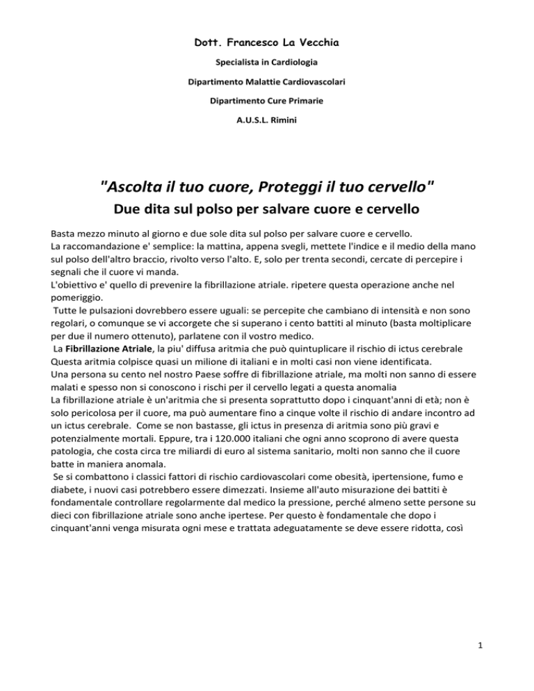 Dott. Francesco La Vecchia Specialista in Cardiologia Dipartimento Malattie Cardiovascolari Dipartimento Cure Primarie A.U.S.L. Rimini "Ascolta il tuo cuore, Proteggi il tuo cervello" Due dita sul polso per salvare cuore e cervello Basta mezzo minuto al giorno e due sole dita sul polso per salvare cuore e cervello. La raccomandazione e' semplice: la mattina, appena svegli, mettete l'indice e il medio della mano sul polso dell'altro braccio, rivolto verso l'alto. E, solo per trenta secondi, cercate di percepire i segnali che il cuore vi manda. L'obiettivo e' quello di prevenire la fibrillazione atriale. ripetere questa operazione anche nel pomeriggio. Tutte le pulsazioni dovrebbero essere uguali: se percepite che cambiano di intensità e non sono regolari, o comunque se vi accorgete che si superano i cento battiti al minuto (basta moltiplicare per due il numero ottenuto), parlatene con il vostro medico. La Fibrillazione Atriale, la piu' diffusa aritmia che può quintuplicare il rischio di ictus cerebrale Questa aritmia colpisce quasi un milione di italiani e in molti casi non viene identificata. Una persona su cento nel nostro Paese soffre di fibrillazione atriale, ma molti non sanno di essere malati e spesso non si conoscono i rischi per il cervello legati a questa anomalia La fibrillazione atriale è un'aritmia che si presenta soprattutto dopo i cinquant'anni di età; non è solo pericolosa per il cuore, ma può aumentare fino a cinque volte il rischio di andare incontro ad un ictus cerebrale. Come se non bastasse, gli ictus in presenza di aritmia sono più gravi e potenzialmente mortali. Eppure, tra i 120.000 italiani che ogni anno scoprono di avere questa patologia, che costa circa tre miliardi di euro al sistema sanitario, molti non sanno che il cuore batte in maniera anomala. Se si combattono i classici fattori di rischio cardiovascolari come obesità, ipertensione, fumo e diabete, i nuovi casi potrebbero essere dimezzati. Insieme all'auto misurazione dei battiti è fondamentale controllare regolarmente dal medico la pressione, perché almeno sette persone su dieci con fibrillazione atriale sono anche ipertese. Per questo è fondamentale che dopo i cinquant'anni venga misurata ogni mese e trattata adeguatamente se deve essere ridotta, così 1 come è importante rilevare regolarmente il ritmo del polso, almeno una volta la settimana''. COSA POSSO FARE? Essere consapevole del battito e del ritmo cardiaco è importante, potrebbe rivelare anomalie della frequenza e irregolarità che possono far sospettare la presenza di Fibrillazione Atriale. Come si controllano battito e ritmo cardiaco? Mediante la palpazione del polso. Ecco alcuni consigli: 2 1) Procurati un orologio e siediti cinque minuti. In questo modo valuterai il tuo battito a riposo. 2) Tieni una delle due mani con il palmo rivolto verso l’alto, piegando leggermente il gomito. 3) Con l’altra mano posiziona l’indice ed il medio sul polso, alla base del pollice. Cerca con le dita il punto del polso in cui avverti il sollevamento intermittente della pelle e fai una leggera pressione. 4) Conta i battiti per 30 secondi e alla fine moltiplicali per 2: questa è la tua frequenza cardiaca al minuto. Quanti battiti hai contato? Di norma, dovresti avere tra i 60 e i 100 battiti al minuto, ma ognuno di noi è diverso e ci possono essere delle variazioni. Ad esempio alcune persone possono rientrare nella normalità anche con una frequenza superiore ai 100 battiti al minuto oppure inferiore ai 60. Questo potrebbe 3 dipendere non dalla presenza di un’aritmia cardiaca, ma dall’età, dai medicinali assunti, dalla caffeina, dall’esercizio fisico, dallo stress, dall’ansia o da eventuali malattie. In quali casi dovresti consultare il tuo medico? - Quando la tua frequenza è di molto maggiore o di molto minore rispetto al battito abituale. - Quando senti che l’intensità della pulsazione non è sempre uguale (puoi percepire ad esempio una pulsazione debole e poi una molto forte). - Quando avverti che l’intervallo tra una pulsazione e l’altra non è costante: ciò significa che il tuo battito è irregolare. 4