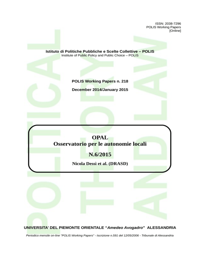 ISSN: 2038-7296 POLIS Working Papers [Online] Istituto di Politiche Pubbliche e Scelte Collettive – POLIS Institute of Public Policy and Public Choice – POLIS POLIS Working Papers n. 218 December 2014/January 2015 OPAL Osservatorio per le autonomie locali N.6/2015 Nicola Dessì et al. (DRASD) UNIVERSITA’ DEL PIEMONTE ORIENTALE “Amedeo Avogadro” ALESSANDRIA Periodico mensile on-line "POLIS Working Papers" - Iscrizione n.591 del 12/05/2006 - Tribunale di Alessandria OPAL - Osservatorio Per le Autonomie Locali - Newsletter n. 6 Novembre/Dicembre 2014 OPAL OSSERVATORIO PER LE AUTOOMIE LOCALI n. 6 Dicembre 2014 / Gennaio 2015 (a cura di Nicola Dessì) 1 IDICE EDITORIALE Servirebbe uno stress-test per le istituzioni di autonomia locale. Di Jörg Luther................................4 PARTE I REGIO I, STATO, EUROPA Il diritto di riunione in Sassonia e il divieto della manifestazione di Pegida. Di Maike Heber............7 Gli enti locali tedeschi non possono rivendicare un diritto ad esercitare in autonomia il servizio di collocamento. Annotazione alla sentenza del Tribunale costituzionale federale del 7.10.2014 - 2 BvR 1641/11. Di Giovanni Boggero....................................................................................................9 PARTE II FU ZIO I E SERVIZI Il Comune può escludere un diritto alla scelta tra mensa e panino. Nota alla sentenza del TAR Piemonte del 31.07.2014, n. 1365. Di Maria Bottiglieri....................................................................12 Divorzi facili e matrimoni omosessuali in municipio. Nota alla circolare n. 10863/2014 del Ministero dell'Interno. Di Matteo Cannonero....................................................................................20 La Regione può far cessare gli usi civici, dandone previa comunicazione ai competenti organi statali. Annotazione alla sentenza della Corte Costituzionale del 09.07.2014, n. 210. Di icola Dessì...................................................................................................................................................24 I sindaci possono limitare gli orari di apertura delle sale da gioco. Annotazione alla sentenza della Corte Costituzionale del 09.07.2014, n. 220. Di icola Dessì...........................................................26 PARTE III CITTADI I ED E TI La lenta trasformazione delle Comunità montane piemontesi in Unioni montane di Comuni. Nota alla sentenza del TAR Piemonte del 25.06.2014, n. 1116. Di Elisa Bellomo.....................................29 I tagli alla mobilità sanitaria interregionale. Nota alla sentenza del Consiglio di Stato del 22.01.2014, n. 296. Di Andrea Patanè...............................................................................................33 PARTE IV ELEZIO I ED ORGA I La garanzia dell'equilibrio di genere nella Giunta comunale si irrigidisce. Annotazione alla sentenza 27.05.2014, n. 3938, del Consiglio di Stato. Di icola Dessì............................................................38 L'interpretazione ministeriale della nuova forma di governo provinciale. Commento alla nota n. 1/2014 del Ministro per gli Affari regionali e le Autonomie. Di Matteo Porricolo...........................41 2 PARTE V PATRIMOIO E COTRATTI Sussidiarietà orizzontale promossa: la partecipazione delle comunità locali alla cura di spazi pubblici (art. 24 d.l. n. 133/2014 - c.d. Sblocca Italia). Di Davide Servetti...................................... 46 PARTE VI FIAZA E COTABILITÀ L'indennità di funzione del sindaco cresce con il transito nella fascia demografica superiore del Comune. Nota alla delibera della sez. autonomie della Corte dei Conti del 15.09.2014, n. 24. Di Marco Comaschi.................................................................................................................................51 La liquidazione in via equitativa del danno all'immagine deve essere ancorata a precisi parametri. Nota alla sentenza della sez. giurisdizionale del Piemonte della Corte dei Conti del 25.09.2014, n. 116. Di Marco Comaschi....................................................................................................................54 La legge anticorruzione e il danno all'immagine della P.A. Commento e rassegna giurisprudenziale sulla l. n. 190/2012. Di Paolo Marta..................................................................................................57 Confermata la giurisprudenza restrittiva della giurisdizione contabile sugli amministratori delle società partecipate. Annotazione alle sentenze della Corte di Cassazione, Sezioni Unite, n. 22608 e 22609/2014. Di Alberto Rissolio........................................................................................................67 3 EDITORIALE Servirebbe uno stress-test per le istituzioni di autonomia locale di Jörg Luther 1. Sul sito web dell’ANCI si legge in data 20 dicembre 2014: “A Bologna vietati botti dalla vigilia di Natale a Capodanno. Il Comune ha annunciato che il sindaco Virginio Merola firmerà oggi un'ordinanza per disporre il divieto di scoppi di petardi, fuochi d'artificio e simili dalle 12 del 24 alle 7 del 1 gennaio su tutto il territorio comunale. La decisione e' stata assunta dal sindaco - viene spiegato - in quanto ogni anno si verificano lesioni alle persone, anche gravi, provocate dall'uso improprio o dal malfunzionamento di petardi e fuochi d'artificio, nonché effetti traumatici verso le persone malate, anziane e negli animali da compagnia”. (com/gp)” L’ordinanza analoga del Comune di Alessandria stabilisce: “Su tutto il territorio comunale è vietato in modo assoluto l’accensione ed i lanci di fuochi d’artificio, lo sparo di petardi, lo scoppio di mortaretti, razzi ed altri artifici pirotecnici nei giorni 31 Dicembre e 1 gennaio di ogni anno. L’inosservanza di tale divieto è sanzionata, fatto salvo quanto previsto e punito dagli artt. 673 e 703 C.P. e dalla legislazione statale vigente, ai sensi dell’ar