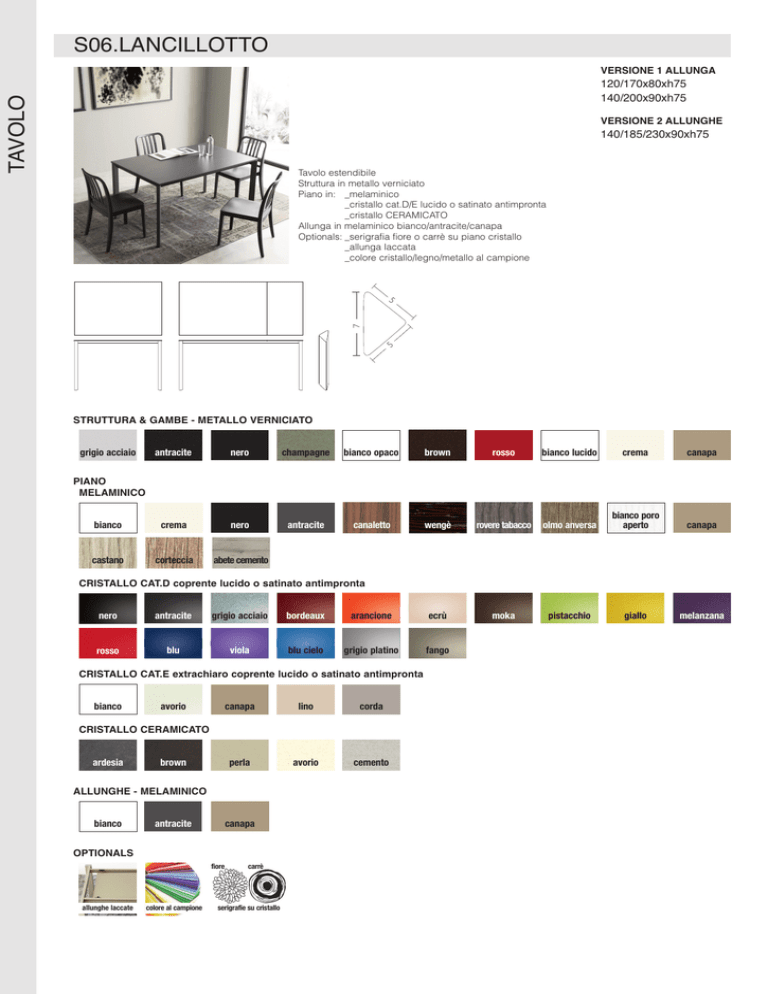 TAVOLO S06.LANCILLOTTO VERSIONE 1 ALLUNGA 120/170x80xh75 140/200x90xh75 VERSIONE 2 ALLUNGHE 140/185/230x90xh75 Tavolo estendibile Struttura in metallo verniciato Piano in: _melaminico _cristallo cat.D/E lucido o satinato antimpronta _cristallo CERAMICATO Allunga in melaminico bianco/antracite/canapa Optionals: _serigrafia fiore o carrè su piano cristallo _allunga laccata _colore cristallo/legno/metallo al campione 7 5 5 STRUTTURA & GAMBE - METALLO VERNICIATO grigio acciaio antracite nero champagne bianco opaco brown rosso bianco lucido crema canapa bianco crema nero antracite canaletto wengè rovere tabacco olmo anversa bianco poro aperto canapa castano corteccia abete cemento nero antracite grigio acciaio bordeaux arancione ecrù moka pistacchio giallo melanzana rosso blu viola blu cielo grigio platino fango bianco avorio canapa lino corda ardesia brown perla avorio cemento PIANO MELAMINICO CRISTALLO CAT.D coprente lucido o satinato antimpronta CRISTALLO CAT.E extrachiaro coprente lucido o satinato antimpronta CRISTALLO CERAMICATO ALLUNGHE - MELAMINICO bianco antracite OPTIONALS allunghe laccate canapa fiore colore al campione carrè serigrafie su cristallo