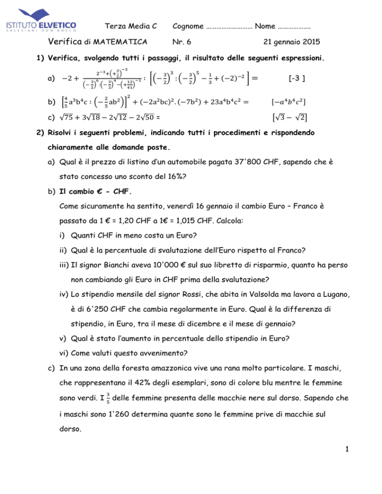 Terza Media C Cognome ……………………… Nome ………………. Verifica di MATEMATICA Nr. 6 21 gennaio 2015 1) Verifica, svolgendo tutti i passaggi, il risultato delle seguenti espressioni. a) −2 + 4 3 −3 2 3 6 3 4 12 −1 (− ) :(− ) −(+ ) 2 2 41 2−3 +(+ ) 2 3 3 3 5 1 ∶ [(− 2) : (− 2) − 3 + (−2)−2 ] = 2 [-3 ] b) [5 a3 b4 c ∶ (− 5 ab2 )] + (−2a2 bc)2 . (−7b2 ) + 23a4 b4 c 2 = [−𝑎4 𝑏 4 𝑐 2 ] c) √75 + 3√18 − 2√12 − 2√50 = [√3 − √2] 2) Risolvi i seguenti problemi, indicando tutti i procedimenti e rispondendo chiaramente alle domande poste. a) Qual è il prezzo di listino d’un automobile pagata 37'800 CHF, sapendo che è stato concesso uno sconto del 16%? b) Il cambio € - CHF. Come sicuramente ha sentito, venerdì 16 gennaio il cambio Euro – Franco è passato da 1 € = 1,20 CHF a 1€ = 1,015 CHF. Calcola: i) Quanti CHF in meno costa un Euro? ii) Qual è la percentuale di svalutazione dell’Euro rispetto al Franco? iii) Il signor Bianchi aveva 10'000 € sul suo libretto di risparmio, quanto ha perso non cambiando gli Euro in CHF prima della svalutazione? iv) Lo stipendio mensile del signor Rossi, che abita in Valsolda ma lavora a Lugano, è di 6'250 CHF che cambia regolarmente in Euro. Qual è la differenza di stipendio, in Euro, tra il mese di dicembre e il mese di gennaio? v) Qual è stato l’aumento in percentuale dello stipendio in Euro? vi) Come valuti questo avvenimento? c) In una zona della foresta amazzonica vive una rana molto particolare. I maschi, che rappresentano il 42% degli esemplari, sono di colore blu mentre le femmine 3 sono verdi. I 5 delle femmine presenta delle macchie nere sul dorso. Sapendo che i maschi sono 1'260 determina quante sono le femmine prive di macchie sul dorso. 1 Terza Media C Cognome ……………………… Nome ………………. 3) Dato il trapezio ABCD; a) Rappresenta i punti A ; H ; C e D sul piano Cartesiano ( u = 2q) , leggendo le coordinate dal grafico. b) Determina la misura dell’ampiezza degli angoli del trapezio e dell’angolo BCH. c) Descrivi i poligoni che formano il trapezio. d) Costruisci con il compasso e nel modo più preciso possibile il punto B. e) Calcola, motivando, la misura dei lati: i) |DC| = ii) |AD| = iv) |CB| = iii) |CH| = v) |AB| = f) Calcola il perimetro del trapezio ABCD. g) Calcola l’area del trapezio ABCD. 4) Dato il prisma esagonale regolare retto, sapendo che |AB| = 4(cm) e che |AG| = 10(cm) calcola: a) Fai uno schizzo del prisma. b) L’area di base del prisma. c) L’area laterale del prisma. d) L’area totale del prisma. e) Il volume del prisma. f) |GB| = ; |BM| = ; |GM| = g) Verifica, con il calcolo che il triangolo BMG è rettangolo. h) Calcola l’area del triangolo BMG. Buon Lavoro! 2
