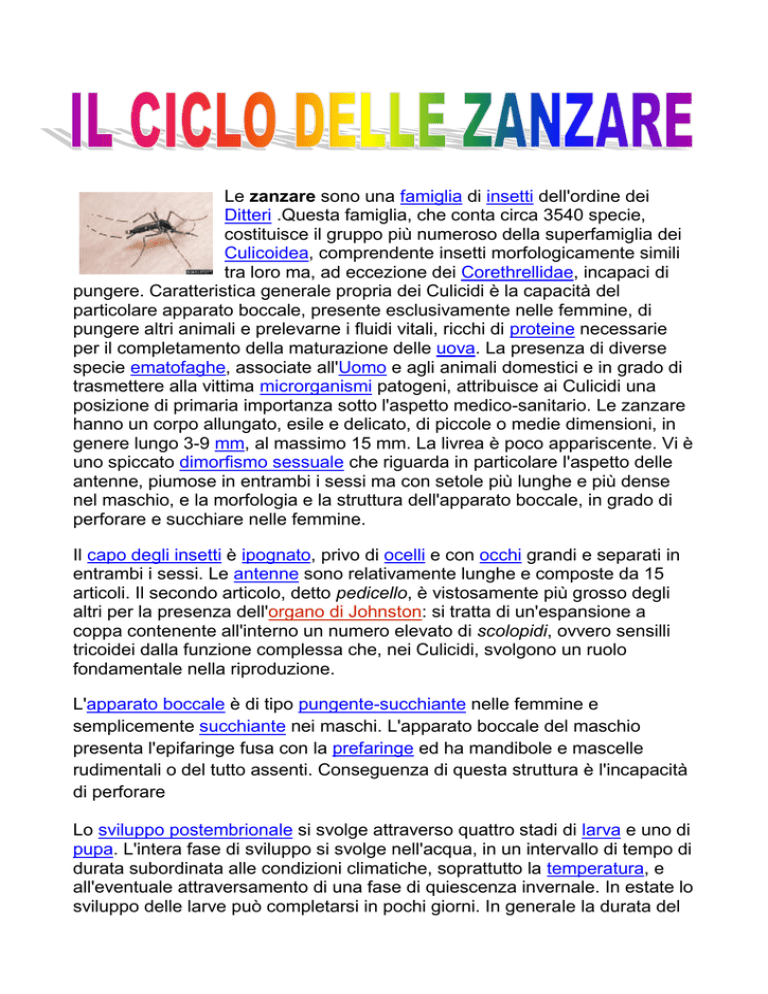 Le zanzare sono una famiglia di insetti dell'ordine dei Ditteri .Questa famiglia, che conta circa 3540 specie, costituisce il gruppo più numeroso della superfamiglia dei Culicoidea, comprendente insetti morfologicamente simili tra loro ma, ad eccezione dei Corethrellidae, incapaci di pungere. Caratteristica generale propria dei Culicidi è la capacità del particolare apparato boccale, presente esclusivamente nelle femmine, di pungere altri animali e prelevarne i fluidi vitali, ricchi di proteine necessarie per il completamento della maturazione delle uova. La presenza di diverse specie ematofaghe, associate all'Uomo e agli animali domestici e in grado di trasmettere alla vittima microrganismi patogeni, attribuisce ai Culicidi una posizione di primaria importanza sotto l'aspetto medico-sanitario. Le zanzare hanno un corpo allungato, esile e delicato, di piccole o medie dimensioni, in genere lungo 3-9 mm, al massimo 15 mm. La livrea è poco appariscente. Vi è uno spiccato dimorfismo sessuale che riguarda in particolare l'aspetto delle antenne, piumose in entrambi i sessi ma con setole più lunghe e più dense nel maschio, e la morfologia e la struttura dell'apparato boccale, in grado di perforare e succhiare nelle femmine. Il capo degli insetti è ipognato, privo di ocelli e con occhi grandi e separati in entrambi i sessi. Le antenne sono relativamente lunghe e composte da 15 articoli. Il secondo articolo, detto pedicello, è vistosamente più grosso degli altri per la presenza dell'organo di Johnston: si tratta di un'espansione a coppa contenente all'interno un numero elevato di scolopidi, ovvero sensilli tricoidei dalla funzione complessa che, nei Culicidi, svolgono un ruolo fondamentale nella riproduzione. L'apparato boccale è di tipo pungente-succhiante nelle femmine e semplicemente succhiante nei maschi. L'apparato boccale del maschio presenta l'epifaringe fusa con la prefaringe ed ha mandibole e mascelle rudimentali o del tutto assenti. Conseguenza di questa struttura è l'incapacità di perforare Lo sviluppo postembrionale si svolge attraverso quattro stadi di larva e uno di pupa. L'intera fase di sviluppo si svolge nell'acqua, in un intervallo di tempo di durata subordinata alle condizioni climatiche, soprattutto la temperatura, e all'eventuale attraversamento di una fase di quiescenza invernale. In estate lo sviluppo delle larve può completarsi in pochi giorni. In generale la durata del ciclo di sviluppo varia da quattro giorni a un mese. L'alimentazione degli adulti rientra nell'ordinario comportamento che si riscontra nella generalità dei Nematoceri: le zanzare sono insetti fondamentalmente glicifagi che si nutrono di nettare e melata, liquidi zuccherini da cui sono soddisfatti i fabbisogni energetici. L'ematofagia o, più in generale, la zoofagia assume invece un ruolo fisiologico nelle femmine, esigenza peraltro non riscontrata nella maggior parte dei nematoceri: l'emoglobina o altre proteine, assunte con la suzione dei fluidi ematici di vertebrati o invertebrati, forniscono l'apporto proteico necessario a completare la maturazione delle uova. Nella maggior parte delle zanzare, la maturazione delle uova ha inizio dallo sfarfallamento, ma in genere si interrompe per l'insufficiente disponibilità proteica. Il completamento della maturazione ha luogo solo dopo aver assunto un pasto di sangue o, in alternativa, di emolinfa. Il comportamento sessuale delle zanzare è caratterizzato dall'esistenza di meccanismi che regolano l'incontro tra i due sessi, a quelli che ottimizzano l'atto riproduttivo in funzione della maturità sessuale delle femmine, a quelli che regolano la fecondità delle femmine nell'arco della loro vita. I maschi possono riunirsi in sciami danzanti, al tramonto, talvolta in grande numero. Questi sciami svolgerebbero un effetto attrattivo sulle femmine, subordinato tuttavia alla percezione di stimoli olfattivi associata alla maturazione sessuale. Nelle zanzare si riscontra spesso anche il fenomeno della stenogamia, ovvero la possibilità di accoppiarsi in spazi ristretti, attraverso meccanismi di sincronizzazione temporale e spaziale dei voli variabili di specie in specie. Questo fenomeno si riscontra in particolare in aree tropicali. L'habitat delle zanzare, nello stadio giovanile, è in generale rappresentato da acque stagnanti di varia estensione e profondità, dai fitotelmi alle piccole pozze temporanee, all'acqua piovana raccolta da particolari conformazioni di manufatti di varia natura, fino alle grandi aree umide delle zone interne o costiere (stagni, paludi, foci, ecc.). Sono colonizzate sia le acque dolci sia quelle salmastre. In generale sono evitati i corsi d'acqua, ma larve di zanzare possono essere presenti presso le rive nelle anse, dove l'acqua tende a ristagnare. Le larve di zanzara si rinvengono perciò nelle risaie o nelle colture in cui si attua l'irrigazione per sommersione, nei canali di bonifica e nelle scoline, nei bacini artificiali e nei serbatoi aperti di varia natura, nelle discariche, nelle acque di deflusso di reflui organici. In particolare, negli ambienti urbani, si sono adattate a sfruttare le fognature.