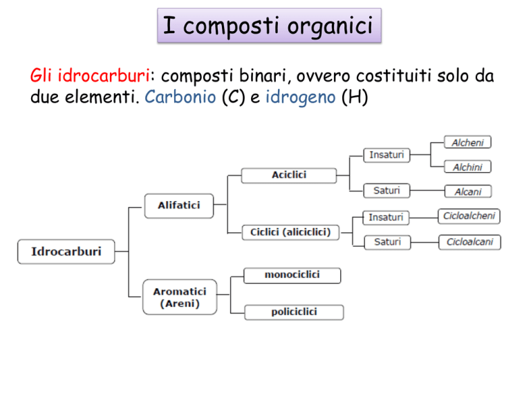 I composti organici Gli idrocarburi: composti binari, ovvero costituiti solo da due elementi. Carbonio (C) e idrogeno (H) Gli idrocarburi Gli Alcani Costituiti da uno o più atomi di carbonio legati tra loro mediante legami singoli -Gli alcani sono insolubili in acqua: sono apolari, pertanto non formano legami idrogeno con le molecole d’acqua Tutti gli alcani si indicano con la desinenza: “-ano” Numero atomi di carbonio crescente Gli idrocarburi Isomeri di struttura: composti con la stessa composizione chimica ma in cui gli atomi sono legati in modo diverso Esempio: butano e isobutano Gli idrocarburi All’aumentare del numero di atomi di carbonio aumenta il numero di possibili isomeri Gli idrocarburi Cicloalcani Alcani a catena ciclica Rappresentazione a stecche e sfere Gli idrocarburi I cicloalcani, ad eccezione del ciclopropano (3 atomi di carbonio), non sono piani ma adottano delle conformazioni ripiegate tridimensionali che consentono di diminuire la tensione di anello. Es. Cicloesano Gli idrocarburi ALCHENI o olefine. Sono caratterizzati dalla presenza di un doppio legame nella molecola Tutti gli alcheni si indicano con la desinenza: “-ene” indicando il numero del primo atomo di carbonio partecipante al doppio legame Gli atomi di carbonio si numerano partendo dall’estremità più vicina al doppio legame CH3—CH=CH—CH2—CH3 2-pentene CH3—CH2—CH =CH—CH3 2-pentene Gli idrocarburi CICLO ALCHENI Gli idrocarburi ALCHINI Sono caratterizzati dalla presenza di un triplo legame nella molecola Tutti gli alchini si indicano con la desinenza: “-ino” indicando il numero del primo atomo di carbonio partecipante al triplo legame GLI ALCHINI NON POSSONO FORMARE CICLI IDROCARBURI AROMATICI Sono caratterizzati dalla presenza di delocalizzazione elettronica che conferisce particolare stabilià. Immaginiamo la struttura molecolare che vede ogni atomo di C con 3 orbitali atomici ibridizzati sp2 ed un orbitale p non ibrido: Gli idrocarburi IDROCARBURI AROMATICI BENZENE Non si può dire con precisione quali siano gli orbitali p che si uniscono per formare il doppio legame, perché si possono avere entrambe le strutture in risonanza: Grazie alla delocalizzazione degli elettroni negli orbitali pz l’anello benzenico è un anello “AROMATICO”. Il concetto di “Aromaticità” non è confinato solo al benzene, in quanto un affinché composto viene considerato aromatico se presenta una particolare configurazione elettronica. I composti aromatici policiclici I gruppi funzionali E’ possibile catalogare tutti i composti organici in poche decine di famiglie. La collocazione di una molecola in una famiglia dipende dalla presenza di un caratteristico gruppo di atomi definito gruppo funzionale. Es1 : Etilene e limonene appartengono alla stessa famiglia, quella degli alcheni, perché possiedono lo stesso gruppo funzionale, il doppio legame C=C, e la loro reattività chimica sarà molto simile indipendentemente dalle loro dimensioni o dalla loro complessità Es2: Colesterolo ed etanolo: due alcoli strutturalmente molto diversi, ma possiedono entrambi il gruppo funzionale -OH I gruppi funzionali I gruppi funzionali ALCOLI METANOLO Formula generale R—OH SUFFISSO: -OLO Es. alcoli possono essere classificati come primari (1°), secondari (2°) o terziari (3°) a seconda che il gruppo –OH sia legato ad un carbonio primario, secondario o terziario. Si indica con gruppo generico “R” una catena di 1 o più atomi di carbonio Es: METANOLO Es: 2- BUTANOLO Es: 2- METIL 2-PROPANOLO Il punto di ebollizione degli alcoli è più alto rispetto a quello degli alcani con peso molecolare simile. Ciò dovuto alla polarità delle molecole di alcol che si associano allo stato liquido grazie ai legami idrogeno. A causa di questi legami è richiesta una ulteriore energia, rispetto agli alcani, per separare le molecole una dall’altra. L’aumento di solubilità in acqua degli alcoli rispetto agli alcani, dipende dai legami idrogeno che il gruppo –OH stabilisce con le molecole di acqua AMMINE R—NH2 SUFFISSO: AMMINA METILAMMINA AMMINA PRIMARIA AMMINA SECONDARIA AMMINA TERZIARIA Alta importanza biologica dovuta alla loro reattività con acqua, acidi carbossilici e aldeidi ALDEIDI SUFFISSO: ALE METANALE o aldeide formica PROPANALE o aldeide propionica CHETONI SUFFISSO: ONE METIL-PROPIL CHETONE Alta importanza biologica dovuta alla loro reattività con alcoli e ammine SI OTTENGONO PER OSSIDAZIONE DA ALCOLI PRIMARI E SECONDARI DIMETIL CHETONE ACIDI CARBOSSILICI PREFISSO: ACIDO SUFFISSO: OICO SI OTTENGONO PER OSSIDAZIONE DI ALDEIDI ESTERI SUFFISSO: ESTERE ETILESTERE SI OTTENGONO PER REAZIONE DI UN ACIDO CARBOSSILICO CON UN ALCOL ETERI R—O—R SUFFISSO: ETERE DIMETIL ETERE METIL-BUTIL ETERE più volatili e meno solubili degli alcoli TIOLI R—SH SUFFISSO: TIOLO METANTIOLO