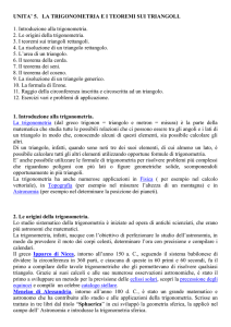 Deregibus Linda, Gaio Chiara, Bertone Cecilia La storia della trigonometria si perde nella notte dei tempi, è interessante osservare però come questa branca della matematica sia legata allo sviluppo di tutte le altre specialità scientifiche. GLI EGIZI Gli Egizi misuravano l'inclinazione di un piano rispetto a un altro, specialmente l’inclinazione delle facce di una piramide, rispetto alla base, con un rapporto tra segmenti che oggi potremmo paragonare alla odierna cotangente. β A metà dell’ Ottocento è stato ritrovato a Luxor il Papiro di Rhind contenente tabelle di frazioni e problemi aritmetici, algebrici e geometrici con le relative soluzioni e le prime nozioni di trigonometria e teorie dei triangoli simili. I GRECI La prima opera sulle funzioni trigonometriche riguarda le corde del cerchio ed è dovuta all'astronomo greco Ipparco di Nicea, vissuto nel II secolo a.C. L'opera trigonometrica più importante è L’Almagesto, diTolomeo, che riporta delle tavole sulle corde molto accurate. Tolomeo rimase interessato solo alle coordinate angolari degli astri (Sole, Luna e 5 pianeti allora conosciuti). ARISTARCO (III sec a.C.) 90° 87° Osservando un’eclisse, misura la distanza terra–luna Con i triangoli rettangoli, misura la distanza terra–sole ( pari a 19 volte la distanza terra-luna ) INDIANI Il matematico e astronomo Aryabhata definì per la prima volta il seno come la relazione moderna fra la metà di un angolo e la metà della corda, e anche il coseno. Altri matematici indiani arrivarono a definire altre funzioni e la relazione fondamentale: sin2x + cos2x = 1 GLI ARABI Abu'l-Wafa sviluppò anche la formula trigonometrica sin 2x = 2 sin x cos x. Le più antiche “tavole di ombre” sono prodotte dagli Arabi nel 860 circa. Utilizzano i termini Tangente = “ombra recta” e Co-tangente = “ombra versa” riferiti ai quadranti delle meridiane Nel mondo arabo, la direzione della Mecca, la Qibla, era indicata da una nicchia, tracciata su tutti gli orologi solari pubblici. la direzione di questa era determinata risolvendo il triangolo avente come vertici la nicchia stessa, la Mecca e il polo nord. RINASCIMENTO • COPERNICO E RETICO • VIETE • EULERO E CARNOT COPERNICO E RETICO Copernico iniziò a scrivere l'Opus palatinum de triangulis terminato da un suo studente, Rheticus, che fu il primo a definire le funzioni trigonometriche direttamente in termini di triangoli rettangoli piuttosto che di cerchi. Contro Tolomeo, Copernico pose: IL SOLE AL CENTRO DEL MOTO DEI PIANETI: TEORIA ELIOCENTRICA VIÈTE Viète è considerato il padre della goniometria: -Considerò la circonferenza goniometrica di raggio unitario -Applicò la trigonometria a problemi aritmetici ed algebrici -Ricavò anche alcune formule dette oggi di prostaferesi EULERO E CARNOT Eulero stabilì la moderna trattazione analitica delle funzioni trigonometriche in Europa, definendole tramite serie infinite e presentando la formula di Eulero eix = cos(x) + i sin(x). Eulero uso le abbreviazioni sin., cos., tang., cot., sec., e cosec. Lazare Carnot (1753-1823) studia i triangoli qualunque (generalizza il teorema del coseno già noto ai greci). TRIGONOMETRIA APPLICATA La trigonometria ha molte applicazioni pratiche: Nella TOPOGRAFIA, Le applicazioni pratiche della trigonometria consistono spesso nel calcolo di lunghezze per le quali non sono possibili misure dirette. Tutti i fenomeni ciclici sono scomponibili in un insieme di oscillazioni elementari, rappresentate da una sinusoide: •onde sonore e luminose •onde elettromagnetiche •cicli solari •moti armonici •raggi x BIBLIOGRAFIA • http://zazzetti.altervista.org/downloads/trigonometria- storia.pdf •http://www.matematicamente.it •http://areeweb.polito.it/didattica/polymath •http://web.math.unifi.it/archimede/archimede