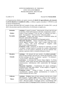 ISTITUTO COMPRENSIVO DI VERZUOLO ANNO SCOLASTICO 2013/14 PROGRAMMAZIONE DIDATTICA DI ITALIANO CLASSE: 1^ C Docente: Prof. Patrizia Buffa La Programmazione didattica, per quanto concerne gli obiettivi di apprendimento, gli strumenti, le attività didattiche, le modalità di verifica), si riferisce a quanto concordato il 3 /09/2010 in sede di riunione di Dipartimento. Per gli alunno individuato BES dal Consiglio di classe, nella seduta del 16 ottobre 2013, e per gli alunni che presentano specifica certificazione di bisogno educativo speciale si rimanda ai singoli p.d.p. ITALIANO Settembre Ottobre Novembre Verifica dei prerequisiti inerenti le abilità linguistiche attraverso la somministrazione di test d’ingresso. Attività di accoglienza mirate a: - - favorire il “passaggio” al nuovo grado di istruzione (attraverso esplicazioni relative all’organizzazione scolastica, indicazioni attinenti la gestione del materiale e letture antologiche sul tema); favorire la conoscenza e la socializzazione nel nuovo gruppo classe (conversazioni, giochi, presentazioni scritte e orali). Antologia - Il genere favola: lettura/ascolto di brani tratti dal testo o forniti dall’insegnante, attività di analisi e comprensione. Letture dal testo sul tema “Conoscersi per crescere”. Lettura e studio mnemonico di testi poetici, prima analisi delle principali caratteristiche del linguaggio poetico. Epica- Il genere mito: lettura/ascolto di brani tratti dal testo o forniti dall’insegnante, attività di analisi e comprensione (miti della creazione, del diluvio, sui fenomeni naturali). Educazione linguistica- Principali elementi di fonologia, ripasso delle principali regole ortografiche, la struttura ed il significato delle parole, introduzione alla morfologia (individuazione delle principali categorie grammaticali con richiamo alle conoscenze acquisite nella scuola primaria). Produzione scritta - Le fasi della produzione scritta. Narrazione di esperienze e di vissuti; rielaborazione di testi poetici con produzione di semplici parafrasi e commenti; rielaborazione creativa di favole; avvio al riassunto (suddivisione in sequenze di brani letti, esposizione sintetica degli stessi a livello orale). Dicembre Gennaio Antologia- Il genere fiaba: lettura/ascolto di racconti antologici tratti dal testo o forniti dall’insegnante, attività di analisi e comprensione; confronto delle caratteristiche dei generi favola – fiaba. Il genere leggenda. Letture sui temi “I diritti dei minori” e “Vivere la storia”. Epica- Miti dell’antica Grecia e di Roma. Introduzione al genere epica e ai poemi omerici. Iliade: lettura, analisi, di brani antologici, individuazione di figure proprie del linguaggio poetico. Memorizzazione di brevi passaggi. Educazione linguistica- Completamento del ripasso ortografico; studio della morfologia: il nome e l’articolo. Produzione scritta – Narrazione di esperienze (dalla favola all’esperienza). Scrittura creativa (leggenda). Riassunto (rielaborazioni collettive e individuali). Parafrasi guidata di testi epici. Febbraio Marzo Antologia- Il racconto di paura : lettura e ascolto di brani antologici o forniti dall’insegnante, attività di analisi e comprensione. Letture sul tema “L’ambiente”: riflessione guidata . Analisi di testi poetici, proposta di memorizzazione, approfondimento relativo alle figure retoriche di suono e di significato. Epica – Lettura, analisi di brani tratti dall’Iliade (completamento) e dall’Odissea. Memorizzazione di brevi passaggi. Educazione linguistica – Studio della morfologia (il verbo: carattere, struttura, coniugazioni, modi e tempi) Produzione scritta- Il riassunto (consolidamento); scrittura creativa (il racconto di paura); la descrizione; narrazione di esperienze. Aprile Maggio Giugno Antologia – Il racconto umoristico: lettura/ascolto di racconti tratti dal libro di testo o forniti dall’insegnante, attività di analisi e comprensione. Letture dal testo sui temi “Conoscersi per crescere”e “L’integrazione”. Analisi di testi poetici, proposta di memorizzazione, e approfondimento relativo alle figure retoriche di sintassi. Epica – L’epica medievale: conoscenza dei principali poemi; lettura e analisi di alcuni brani. Educazione linguistica – Studio della morfologia (il verbo: genere e forma; l’aggettivo e il pronome) Produzione scritta- La descrizione (consolidamento); narrazione di esperienze con arricchimento del contenuto attraverso l’inserimento di descrizioni e riflessioni; scrittura creativa ( racconto umoristico); la cronaca. Verzuolo, 30/11/2013 La docente Patrizia Buffa