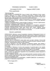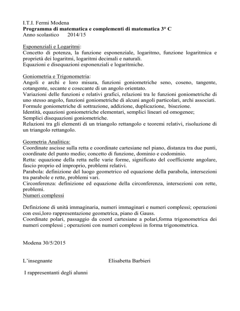 I.T.I. Fermi Modena Programma di matematica e complementi di matematica 3° C Anno scolastico 2014/15 Esponenziali e Logaritmi: Concetto di potenza, la funzione esponenziale, logaritmo, funzione logaritmica e proprietà dei logaritmi, logaritmi decimali e naturali. Equazioni e disequazioni esponenziali e logaritmiche. Goniometria e Trigonometria: Angoli e archi e loro misura, funzioni goniometriche seno, coseno, tangente, cotangente, secante e cosecante di un angolo orientato. Variazioni delle funzioni e relativi grafici, relazioni tra le funzioni goniometriche di uno stesso angolo, funzioni goniometriche di alcuni angoli particolari, archi associati. Formule goniometriche di sottrazione, addizione, duplicazione, bisezione. Identità, equazioni goniometriche elementari, semplici lineari ed omogenee; Semplici disequazioni goniometriche. Relazioni tra gli elementi di un triangolo rettangolo e teoremi relativi, risoluzione di un triangolo rettangolo. Geometria Analitica: Coordinate ascisse sulla retta e coordinate cartesiane nel piano, distanza tra due punti, coordinate del punto medio; concetto di funzione, dominio e codominio. Retta: equazione della retta nelle varie forme, significato del coefficiente angolare, fascio proprio ed improprio, problemi relativi. Parabola: definizione del luogo geometrico ed equazione della parabola, intersezioni tra parabole e rette, problemi vari. Circonferenza: definizione ed equazione della circonferenza, intersezioni con rette, problemi. Numeri complessi Definizione di unità immaginaria, numeri immaginari e numeri complessi; operazioni con essi,loro rappresentazione geometrica, piano di Gauss. Coordinate polari, passaggio da coord cartesiane a polari,forma trigonometrica dei numeri complessi ; operazioni con numeri complessi in forma trigonometrica. Modena 30/5/2015 L’insegnante I rappresentanti degli alunni Elisabetta Barbieri