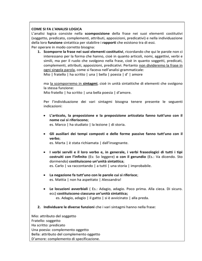 COME SI FA L’ANALISI LOGICA L’analisi logica consiste nella scomposizione della frase nei suoi elementi costitutivi (soggetto, predicato, complementi, attributi, apposizioni, predicativi) e nella individuazione della loro funzione sintattica per stabilire i rapporti che esistono tra di essi. Per operare in modo corretto bisogna: 1. Scomporre la frase nei suoi elementi costitutivi, ricordando che qui le parole non ci interessano per la forma che hanno, cioè in quanto articoli, nomi, aggettivi, verbi e simili, ma per il ruolo che svolgono nella frase, cioè in quanto soggetti, predicati, complementi, attributi, apposizioni, predicativi. Pertanto non divideremo la frase in ogni singola parola, come si faceva nell’analisi grammaticale: Mio | fratello | ha scritto | una | bella | poesia | d’ | amore ma la scomporremo in sintagmi, cioè in unità sintattiche di elementi che svolgono la stessa funzione: Mio fratello | ha scritto | una bella poesia | d’amore. Per l’individuazione dei vari sintagmi bisogna tenere presente le seguenti indicazioni: L’articolo, la preposizione e la preposizione articolata fanno tutt’uno con il nome cui si riferiscono; es. Marco | ha studiato | la lezione | di storia. Gli ausiliari dei tempi composti e delle forme passive fanno tutt’uno con il verbo; es. Marta | è stata richiamata | dall’insegnante. I verbi servili e il loro verbo e, in generale, i verbi fraseologici di tutti i tipi costruiti con l’infinito (Es: So leggere) o con il gerundio (Es.: Va dicendo. Sto dormendo) costituiscono un’unità sintattica; es. Carlo | va raccontando | a tutti | una storia | improbabile. La negazione fa tutt’uno con le parole cui si riferisce; es. Mattia | non ha aspettato | Alessandra! Le locuzioni avverbiali ( Es.: Adagio, adagio. Poco prima. Alla cieca. Di sicuro. ecc) costituiscono ciascuna un’unità sintattica; es. Adagio, adagio | il gatto | si è avvicinato | alla preda. 2. Individuare le diverse funzioni che i vari sintagmi hanno nella frase: Mio: attributo del soggetto Fratello: soggetto Ha scritto: predicato Una poesia: complemento oggetto Bella: attributo del complemento oggetto D’amore: complemento di specificazione.
