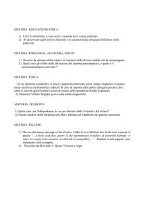 DOMANDE PRIMA SIMULAZIONE DELLA TERZA PROVA 18 MARZO 2015- DOMANDE TIPOLOGIA B INGLESE 1. What principles did Wordsworth state in the preface to “LYRICAL BALLADS”? 2. What characters did Dickens create? 3. What are the main features of decadent artists? FISICA 1. Enuncia il secondo principio della termodinamica nelle sue due forme. 2. Ricava, utilizzando la legge di Gauss e simmetrie, il campo elettrico generato da una distribuzione sferica uniforme di carica. (All'interno e all'esterno della sfera) 3. Definisci la differenza di potenziale elettrico. INFORMATICA 1. Nel modello relazionale di un Data Base si parla di associazioni 1:1, 1:N, N:N. Cosa si intende? 2. Quali sono i mezzi trasmissivi utilizzati nelle connessioni in rete di sistemi di comunicazione? Descriverne inoltre le caratteristiche fondamentali. 3. Cosa si intende nelle reti di computer per modello ISO/OSI? Spiegare inoltre in termini di massima in quanti e quali livelli esso si scompone. STORIA 1. Quali furono le cause del crack del 1929? 2. In quale modo il disagio del dopoguerra influì sulla genesi del fascismo? 3. Quale classe sociale “scomparve” in seguito alla repressione stalinista? Perché?