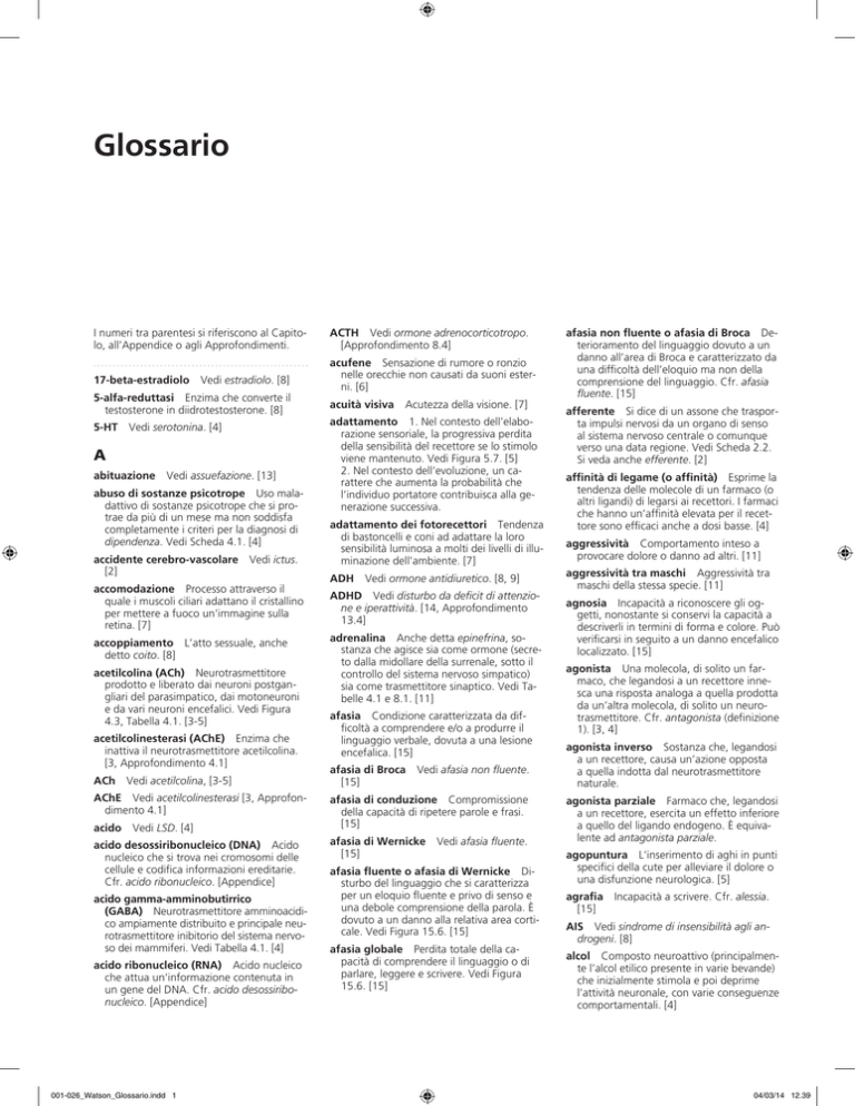 Glossario I numeri tra parentesi si riferiscono al Capitolo, all’Appendice o agli Approfondimenti. ACTH Vedi ormone adrenocorticotropo. [Approfondimento 8.4] 17-beta-estradiolo Vedi estradiolo. [8] acufene Sensazione di rumore o ronzio nelle orecchie non causati da suoni esterni. [6] 5-alfa-reduttasi Enzima che converte il testosterone in diidrotestosterone. [8] 5-HT Vedi serotonina. [4] A abituazione Vedi assuefazione. [13] abuso di sostanze psicotrope Uso maladattivo di sostanze psicotrope che si protrae da più di un mese ma non soddisfa completamente i criteri per la diagnosi di dipendenza. Vedi Scheda 4.1. [4] accidente cerebro-vascolare Vedi ictus. [2] accomodazione Processo attraverso il quale i muscoli ciliari adattano il cristallino per mettere a fuoco un’immagine sulla retina. [7] accoppiamento L’atto sessuale, anche detto coito. [8] acetilcolina (ACh) Neurotrasmettitore prodotto e liberato dai neuroni postgangliari del parasimpatico, dai motoneuroni e da vari neuroni encefalici. Vedi Figura 4.3, Tabella 4.1. [3-5] acetilcolinesterasi (AChE) Enzima che inattiva il neurotrasmettitore acetilcolina. [3, Approfondimento 4.1] ACh Vedi acetilcolina, [3-5] AChE Vedi acetilcolinesterasi [3, Approfondimento 4.1] acido Vedi LSD. [4] acido desossiribonucleico (DNA) Acido nucleico che si trova nei cromosomi delle cellule e codifica informazioni ereditarie. Cfr. acido ribonucleico. [Appendice] acido gamma-amminobutirrico (GABA) Neurotrasmettitore amminoacidico ampiamente distribuito e principale neurotrasmettitore inibitorio del sistema nervoso dei mammiferi. Vedi Tabella 4.1. [4] acido ribonucleico (RNA) Acido nucleico che attua un’informazione contenuta in un gene del DNA. Cfr. acido desossiribonucleico. [Appendice] 001-026_Watson_Glossario.indd 1 acuità visiva Acutezza della visione. [7] adattamento 1. Nel contesto dell’elaborazione sensoriale, la progressiva perdita della sensibilità del recettore se lo stimolo viene mantenuto. Vedi Figura 5.7. [5] 2. Nel contesto dell’evoluzione, un carattere che aumenta la probabilità che l’individuo portatore contribuisca alla generazione successiva. adattamento dei fotorecettori Tendenza di bastoncelli e coni ad adattare la loro sensibilità luminosa a molti dei livelli di illuminazione dell’ambiente. [7] ADH Vedi ormone antidiuretico. [8, 9] ADHD Vedi disturbo da deficit di attenzione e iperattività. [14, Approfondimento 13.4] adrenalina Anche detta epinefrina, sostanza che agisce sia come ormone (secreto dalla midollare della surrenale, sotto il controllo del sistema nervoso simpatico) sia come trasmettitore sinaptico. Vedi Tabelle 4.1 e 8.1. [11] afasia Condizione caratterizzata da difficoltà a comprendere e/o a produrre il linguaggio verbale, dovuta a una lesione encefalica. [15] afasia di Broca Vedi afasia non fluente. [15] afasia di conduzione Compromissione della capacità di ripetere parole e frasi. [15] afasia di Wernicke Vedi afasia fluente. [15] afasia fluente o afasia di Wernicke Disturbo del linguaggio che si caratterizza per un eloquio fluente e privo di senso e una debole comprensione della parola. È dovuto a un danno alla relativa area corticale. Vedi Figura 15.6. [15] afasia globale Perdita totale della capacità di comprendere il linguaggio o di parlare, leggere e scrivere. Vedi Figura 15.6. [15] afasia non fluente o afasia di Broca Deterioramento del linguaggio dovuto a un danno all’area di Broca e caratterizzato da una difficoltà dell’eloquio ma non della comprensione del linguaggio. Cfr. afasia fluente. [15] afferente Si dice di un assone che trasporta impulsi nervosi da un organo di senso al sistema nervoso centrale o comunque verso una data regione. Vedi Scheda 2.2. Si veda anche efferente. [2] affinità di legame (o affinità) Esprime la tendenza delle molecole di un farmaco (o altri ligandi) di legarsi ai recettori. I farmaci che hanno un’affinità elevata per il recettore sono efficaci anche a dosi basse. [4] aggressività Comportamento inteso a provocare dolore o danno ad altri. [11] aggressività tra maschi Aggressività tra maschi della stessa specie. [11] agnosia Incapacità a riconoscere gli oggetti, nonostante si conservi la capacità a descriverli in termini di forma e colore. Può verificarsi in seguito a un danno encefalico localizzato. [15] agonista Una molecola, di solito un farmaco, che legandosi a un recettore innesca una risposta analoga a quella prodotta da un’altra molecola, di solito un neurotrasmettitore. Cfr. antagonista (definizione 1). [3, 4] agonista inverso Sostanza che, legandosi a un recettore, causa un’azione opposta a quella indotta dal neurotrasmettitore naturale. agonista parziale Farmaco che, legandosi a un recettore, esercita un effetto inferiore a quello del ligando endogeno. È equivalente ad antagonista parziale. agopuntura L’inserimento di aghi in punti specifici della cute per alleviare il dolore o una disfunzione neurologica. [5] agrafia Incapacità a scrivere. Cfr. alessia. [15] AIS Vedi sindrome di insensibilità agli androgeni. [8] alcol Composto neuroattivo (principalmente l’alcol etilico presente in varie bevande) che inizialmente stimola e poi deprime l’attività neuronale, con varie conseguenze comportamentali. [4] 04/03/14 12.39 2 GLOSSARIO aldosterone Ormone mineralcorticoide secreto dalla corteccia delle ghiandole surrenali, che promuove il recupero renale del sodio. [9] alessia Incapacità a leggere. Si veda anche agrafia. [15] allele Una delle varianti di un gene. allomone Segnale chimico che, liberato all’esterno del corpo da individui di una specie, va a influenzare il comportamento di individui di altre specie. Vedi Figura 8.3. Cfr. feromone. [8] allucinogeno Farmaco che altera la percezione sensoriale e produce esperienze particolari. Cfr. dissociativo. [4] alterata percezione del sonno (o pseudoinsonnia) Di solito si tratta della percezione soggettiva di non aver dormito durante un periodo di sonno documentato. Generalmente avvien