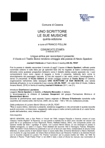 Il ritorno di E' Bal, da venerdì sul palco del Teatro VulKano di San Bartolo Mercoledì 28 Settembre 2016 Il fortunato spettacolo con Roberto Magnani e Simone Marzocchi per il testo di Nevio Spadoni replicherà fino a mercoledì 19 ottobre Magnani e Marzocchi (Foto Cesare Fabbri) Dopo la serie di tutto esaurito della scorsa stagione, torna sul palco di VulKano E’ bal, lo spettacolo in dialetto romagnolo che Roberto Magnani e Simone Marzocchi hanno tratto dall’omonimo testo del poeta Nevio Spadoni. E’ bal racconta la storia di Ezia, donna emarginata di un paese della campagna romagnola, vittima delle dicerie della gente, continuamente in cammino alla ricerca di un uomo da sposare. Questo suo andare in cerca, assomiglia a un ballo, un continuo sgambettare che smuove tutto il corpo della giovane donna. Ezia è vittima a suo dire, di un abbandono: il grande amore della sua vita l’ha lasciata sola e per questo motivo viaggia senza sosta per cercare di rimpiazzare il vecchio fidanzato ormai fra le braccia di un’altra donna. Ma il tempo passa, gli anni volano, e il ballo di Ezia si fa stanco e sgraziato, il decadimento fisico è accompagnato da una perdita progressiva della ragione, Ezia comincia a perdere la lucidità, ad avere le allucinazioni, ricorda solo una vecchia giostra, teatro, a quanto pare, del primo incontro con quel cavaliere che l’ha lasciata sola a ballare questa danza folle – che assomiglia a un sogno – che è la vita. Roberto Magnani, dopo essersi confrontato con l’Odiséa di Tonino Guerra nel 2009, accetta dunque questa nuova sfida con il dialetto romagnolo, intendendolo come lingua incarnata, pozzo da cui attingere visioni e immaginario, un contatto con i fantasmi dei nostri antenati, e contrappuntato dai mondi sonori evocati da Simone Marzocchi, racconta, alternando ferocia, disincanto e mestizia, la storia di Ezia. Una storia che, proprio per il continuo peregrinare della protagonista, per il continuo movimento assomiglia a un ballo, “e’ bal”, appunto. Ma è il testo stesso, scritto da Nevio Spadoni in quinari, a essere un ballabile, trascendendo il significato delle parole – quelle che sfuggono si capiscono comunque “a pelle”, in maniera intuitiva – e dando a Magnani la possibilità di arrivare al pubblico quasi in maniera fisica, pur restando immobile, con il dialetto a teatralizzare foneticamente lo scoramento della protagonista e la perfidia dei suoi compaesani. Il lavoro entra in una scia ventennale di alchimia tra la penna dialettale di Spadoni e la ricerca vocale-musicale delle Albe e in particolare di Ermanna Montanari, che ha già fruttato capolavori come Luá¹£ e L'isola di Alcina. Roberto Magnani si avvicina giovanissimo al Teatro delle Albe partecipando ai laboratori della non-scuola. Nel 1998 viene scelto per interpretare uno dei dodici palotini nello spettacolo I Polacchi, testo e regia di Marco Martinelli, che raccoglie un successo internazionale. Da quel momento entra a far parte stabilmente del Teatro delle Albe e lavora in tutti gli spettacoli successivi della compagnia e diventa guida della non-scuola. Ravennanotizie.it Nel 2009 debutta con Odiséa di Tonino Guerra cui segue E’ bal di Nevio Spadoni, nel quale ha accanto Simone Marzocchi. Ha pubblicato su riviste e ha partecipato a trasmissioni radiofoniche di Radio Rai 3, come l’episodio di Storyville dedicato a Eminem. È tra i protagonisti del primo film del Teatro delle Albe, Vita agli arresti di Aung San Suu Kyi, di prossima uscita. Simone Marzocchi, musicista, compositore, didatta. Diplomato in tromba sotto la guida del M° Andrea Patrignani presso l’istituto pareggiato “G.Verdi” di Ravenna. Attualmente è prima tromba dell’Orchestra Arcangelo Corelli di Ravenna e del quartetto di ottoni Youbrass ensemble; collabora come musicista e compositore con il Teatro delle Albe, la compagnia Un’Ottima Lettera, l’associazione RiBellarti, i gruppi Xtravagance Core, 64 Slices of American Cheese, Johnny & Mongo. Nevio Spadoni, ravennate è autore di diverse raccolte liriche specialmente in romagnolo, e di lavori teatrali scritti per Ravenna Festival e Ravenna Teatro, rappresentati anche all'estero. Tradotto in più lingue, e inserito in antologie italiane e straniere, ha ottenuto prestigiosi riconoscimenti come poeta e come drammaturgo. Di lui si sono occupati numerosi scrittori e critici. E’ bal di e con: Roberto Magnani e Simone Marzocchi testo: Nevio Spadoni musica: Simone Marzocchi realizzazione strumenti musicali: Giovanni Cavalcoli, Fabio Ceroni, Roberto Magnani, Danilo Maniscalco, Simone Marzocchi tecnico luci e suono: Fagio tecnici di produzione: Fagio, Andrea Napolitano, Massimiliano Rassu organizzazione e promozione: Silvia Pagliano; Francesca Venturi produzione: Teatro delle Albe/Ravenna Teatro. REPLICHE E ORARI martedì – mercoledì – venerdì – sabato: ore 21 domenica ore 16 (riposo lunedì e giovedì). Biglietti VulKano intero 8 € - ridotto* e under 30 5 € *soci Coop Adriatica, abbonati a La stagione dei teatri Per l’ingresso è necessario sottoscrivere la tessera associativa annuale al costo di 0,50 € INFO E PRENOTAZIONI: (posti limitati, prenotazione obbligatoria) Ravenna Teatro – tel. 333 7605760, da lun a ven dalle 10 alle 13 e dalle 15 alle 18 Mail: [email protected], [email protected]. Cronaca, Cultura, Spettacolo Ravennanotizie.it