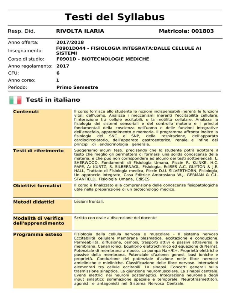 Testi del Syllabus Resp. Did. RIVOLTA ILARIA Anno offerta: 2017/2018 F0901D044 - FISIOLOGIA INTEGRATA:DALLE CELLULE AI SISTEMI F0901D - BIOTECNOLOGIE MEDICHE Insegnamento: Corso di studio: Matricola: 001803 Anno regolamento: 2017 CFU: 6 Anno corso: 1 Periodo: Primo Semestre Testi in italiano Contenuti Il corso fornisce allo studente le nozioni indispensabili inerenti le funzioni vitali dell'uomo. Analizza i meccanismi inerenti l’eccitabilità cellulare, l’interazione tra cellule eccitabili, e la motilità cellulare. Analizza la fisiologia dei sistemi sensoriali e del controllo motorio e i principi fondamentali della coscienza nell’uomo e delle funzioni integrative dell’encefalo, apprendimento e memoria. Il programma affronta inoltre la fisiologia del SNC e SNP, della respirazione, dell’apparato cardiocircolatorio, dell’apparato gastroenterico, renale e infine dei principi di endocrinologia generale. Testi di riferimento Suggeriamo alcuni testi, precisando che lo studente potrà adottare il testo che meglio gli permetterà di formarsi una solida conoscenza della materia, e che può non corrispondere ad alcuno dei testi sottoelencati. L. SHERWOOD, Fondamenti di Fisiologia Umana, Piccin R. KLINKE, H.C. PAPE, A: KURTZ, S. SILBERNAGL, Fisiologia, EdiSES A.C. GUYTON & J.E. HALL, Trattato di Fisiologia medica, Piccin D.U. SILVERTHORN, Fisiologia, Un approccio integrato, Casa Editrice Ambrosiana W.J. GERMAN & C.L. STANFIELD, Fisiologia Umana, EdiSES Obiettivi formativi Il corso è finalizzato alla comprensione delle conoscenze fisiopatologiche utile nella preparazione di un biotecnologo medico. Metodi didattici Lezioni frontali. Modalità di verifica dell'apprendimento Scritto con orale a discrezione del docente Programma esteso Fisiologia della cellula nervosa e muscolare - Il sistema nervoso Eccitabilità cellulare Membrana plasmatica, eccitazione e conduzione. Permeabilità, diffusione, osmosi, trasporti attivi e passivi attraverso la membrana. Canali ionici. Equilibrio elettrochimico ed equazione di Nernst. Potenziale di membrana a riposo. La pompa Na+/K+. Proprietà elettriche passive della membrana. Potenziale d’azione: genesi, basi ioniche e proprietà. Conduzione del potenziale d'azione nelle fibre nervose amieliniche e mieliniche. Classificazione delle fibre nervose. Interazioni elementari tra cellule eccitabili. La sinapsi. Concetti generali sulla trasmissione sinaptica. La giunzione neuromuscolare. La sinapsi centrale. Eventi elettrici nei neuroni postsinaptici. Integrazione neuronale degli input sinaptici: sommazione spaziale e temporale. Neurotrasmettitori, agonisti e antagonisti nel Sistema Nervoso Centrale. Fisiologia del muscolo Il muscolo striato. Struttura dell’apparato contrattile. Il sarcomero: proteine contrattili e proteine regolatrici. Accoppiamento eccitazione-contrazione: ruolo dello ione Ca2+. Basi molecolari della contrazione. Meccanica della contrazione. Scossa e tetano. Contrazione isotonica ed isometrica. Relazioni tensione-lunghezza e forza-velocità. Classificazione delle fibre muscolari scheletriche. Caratteristiche biochimiche, metaboliche ed istologiche dei diversi tipi di fibre muscolari. Definizione e classificazione delle unità motorie. Regolazione della produzione di forza mediante variazione della frequenza di scarica e reclutamento delle unità motorie. Il muscolo liscio. Accoppiamento tra cellule muscolari lisce: muscolo unitario e multi unitario. Sistemi sensoriali: organizzazione e meccanismi generali. I recettori sensoriali: definizione e classificazione dei recettori. Trasduzione e codificazione del segnale. Stimolo adeguato. Adattamento. Campi recettivi. Dimensioni della sensazione: modalità, localizzazione, intensità, durata. Sensibilità somatica: tatto, propriocezione, termocezione, dolore. Vie ascendenti della sensibilità somatica: sistema colonne dorsalilemnisco mediale; sistema antero-laterale (tratto spino-talamico). Corteccia somatosensoriale. Il dolore. Nocicettori: distribuzione anatomica, meccanismi di attivazione e sensibilizzazione, Nocicettori somatici, profondi e viscerali. Vie centrali della sensibilità dolorifica. Sistemi antinocicettivi endogeni: meccanismi spinali di modulazione; sistemi inibitori discendenti e sovraspinali. Funzioni motorie del tronco dell'encefalo e della corteccia cerebrale. Le risposte riflesse, attività ritmiche e movimenti volontari. Sistemi sensorimotori: controllo della postura corporea e del movimento. Riflesso miotatico, riflesso miotatico inverso; riflessi spinali. riflessi vestibolari e cervicali. Cervelletto e Gangli della base. Il controllo dell’equilibrio. Sistema Nervoso Centrale. Principi fondamentali della coscienza nell’uomo: funzione di base del sistema nervoso, funzioni integrative dell’encefalo: il sistema limbico, apprendimento e memoria, la plasticità sinaptica. Veglia e sonno: i ritmi cerebrali nel profilo dell’elettroencefalogramma Udito e linguaggio: la comunicazione verbale nell’uomo. Sistema visivo Sistema nervoso autonomo. Sistema ortosimpatico e parasimpatico. Mediatori chimici. Organizzazione dei riflessi vegetativi. Funzioni vegetative del tronco encefalico. Centri nervosi di controllo delle funzioni viscerali. Apparato cardiovascolare Il miocardio. Attività elettrica del cuore: il potenziale d’azione cardiaco; automatismo nel cuore. Regolazione della frequenza cardiaca La pompa cardiaca Controllo della gittata cardiaca Emodinamica Il sistema arterioso: la pressione arteriosa e il suo controllo Ma microcircolazione e il sistema linfatico La circolazione periferica e il suo controllo La circolazione coronarica Fisiologia della respirazione Polmone come scambiatore di gas. Spirometria: volumi e capacità polmonari. Ventilazione. Spazio morto. Meccanica polmonare. Accoppiamento meccanico torace-polmone; origine della pressione pleurica negativa; Pneumotorace. Relazione volume-pressione a rilasciamento del torace, del polmone e del sistema torace-pol