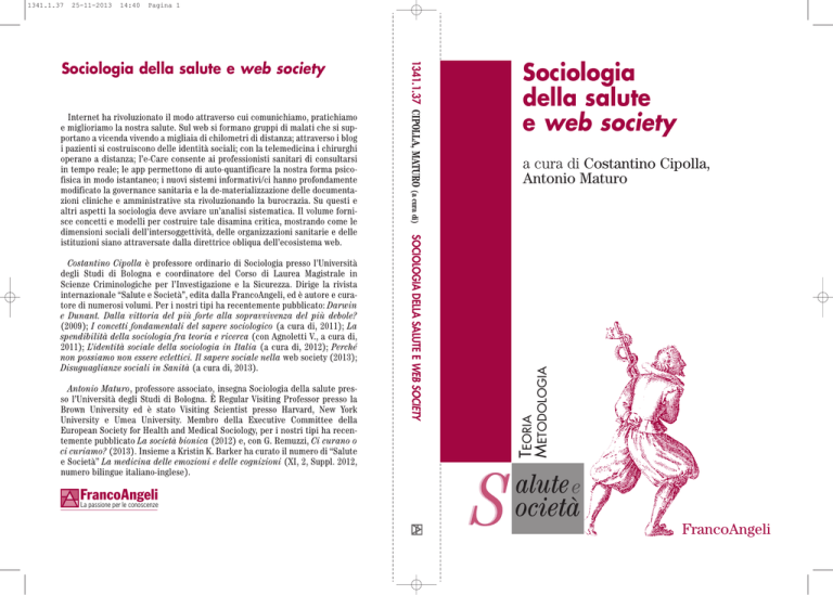 25-11-2013 14:40 Pagina 1 Costantino Cipolla è professore ordinario di Sociologia presso l’Università degli Studi di Bologna e coordinatore del Corso di Laurea Magistrale in Scienze Criminologiche per l’Investigazione e la Sicurezza. Dirige la rivista internazionale “Salute e Società”, edita dalla FrancoAngeli, ed è autore e curatore di numerosi volumi. Per i nostri tipi ha recentemente pubblicato: Darwin e Dunant. Dalla vittoria del più forte alla sopravvivenza del più debole? (2009); I concetti fondamentali del sapere sociologico (a cura di, 2011); La spendibilità della sociologia fra teoria e ricerca (con Agnoletti V., a cura di, 2011); L’identità sociale della sociologia in Italia (a cura di, 2012); Perché non possiamo non essere eclettici. Il sapere sociale nella web society (2013); Disuguaglianze sociali in Sanità (a cura di, 2013). Antonio Maturo, professore associato, insegna Sociologia della salute presso l’Università degli Studi di Bologna. È Regular Visiting Professor presso la Brown University ed è stato Visiting Scientist presso Harvard, New York University e Umea University. Membro della Executive Committee della European Society for Health and Medical Sociology, per i nostri tipi ha recentemente pubblicato La società bionica (2012) e, con G. Remuzzi, Ci curano o ci curiamo? (2013). Insieme a Kristin K. Barker ha curato il numero di “Salute e Società” La medicina delle emozioni e delle cognizioni (XI, 2, Suppl. 2012, numero bilingue italiano-inglese). FrancoAngeli La passione per le conoscenze Sociologia della salute e web society a cura di Costantino Cipolla, Antonio Maturo SOCIOLOGIA DELLA SALUTE E WEB SOCIETY Internet ha rivoluzionato il modo attraverso cui comunichiamo, pratichiamo e miglioriamo la nostra salute. Sul web si formano gruppi di malati che si supportano a vicenda vivendo a migliaia di chilometri di distanza; attraverso i blog i pazienti si costruiscono delle identità sociali; con la telemedicina i chirurghi operano a distanza; l’e-Care consente ai professionisti sanitari di consultarsi in tempo reale; le app permettono di auto-quantificare la nostra forma psicofisica in modo istantaneo; i nuovi sistemi informativi/ci hanno profondamente modificato la governance sanitaria e la de-materializzazione delle documentazioni cliniche e amministrative sta rivoluzionando la burocrazia. Su questi e altri aspetti la sociologia deve avviare un’analisi sistematica. Il volume fornisce concetti e modelli per costruire tale disamina critica, mostrando come le dimensioni sociali dell’intersoggettività, delle organizzazioni sanitarie e delle istituzioni siano attraversate dalla direttrice obliqua dell’ecosistema web. 1341.1.37 CIPOLLA, MATURO (a cura di) Sociologia della salute e web society TEORIA METODOLOGIA 1341.1.37 S alute e ocietà FrancoAngeli Informazioni per il lettore Questo file PDF è una versione gratuita di sole 20 pagine ed è leggibile con La versione completa dell’e-book (a pagamento) è leggibile con Adobe Digital Editions. Per tutte le informazioni sulle condizioni dei nostri e-book (con quali dispositivi leggerli e quali funzioni sono consentite) consulta cliccando qui le nostre F.A.Q. Salute e Società collana diretta da Costantino Cipolla La Collana Salute e Società (attiva dal 2002) si inserisce in una rete di natura vasta e plurale in cui molteplici iniziative concorrono, pariteticamente, nel definirne l’identità epistemologica e metodologica. L’approccio di riferimento risulta co-istituito secondo uno studio della salute che non è né strettamente medico, né di stampo puramente economico-sanitario. Le tematiche che ruotano attorno al rapporto fra salute e società, con particolare riguardo alle nuove “culture della salute”, al ritorno a forme di pluralismo sanitario come conseguenza della diffusione delle medicine alternative, fanno emergere stili inediti di partecipazione dei cittadini al miglioramento della qualità dei servizi sanitari, ai percorsi di umanizzazione e personalizzazione delle cure. Tale prospettiva rimane inoltre aperta ed attenta ai processi di riforma dei sistemi sanitari attualmente in atto, soprattutto nelle società industriali avanzate, nel contesto del più generale processo di globalizzazione operante anche in campo sanitario. La Collana Salute e Società contempla, all’interno della sua rete di riferimento, le seguenti iniziative, qui segnalate con i rappresentanti che ne compongono il Consiglio di direzione (organo fondamentale di coordinamento e di raccordo tra le varie strutture): – Andrea Antonilli, Susanna Vezzadini (Un. di Bologna), Laurea Magistrale in Scienze criminologiche per l'investigazione e la sicurezza; – Antonio Maturo (Un. di Bologna e Brown University), Rivista Salute e Società, quadrimestrale edito in italiano e in inglese (online) da FrancoAngeli; – Roberto Vignera (Un. di Catania), Delegato AIS, sezione di sociologia della salute e della medicina; Tullia Saccheri (Un. di Salerno), Delegato SISS, Società Italiana di Sociologia della Salute; – Leonardo Altieri (Un. di Bologna), Master Universitario di I livello in e-Health e qualità dei servizi socio-sanitari; – Cleto Corposanto (Un. della Magna Graecia, Catanzaro), Centro di Ricerca Interdipartimentale sui Sistemi Sanitari e le Politiche di Welfare (C.R.I.S.P.); – Sebastiano Porcu (Un. di Macerata), Master Universitario di I livello in Il coordinamento, la progettazione e la gestione dei servizi di educazione, comunicazione e promozione della salutesalute; – Veronica Agnoletti (Un. di Bologna), Centro di Studi Avanzati sull’Umanizzazione delle Cure e sulla Salute Sociale (Ce.Um.S); – Anna Coluccia (Un. di Siena), Master Universitario di I livello in Funzioni Specialistiche e Gestione del coordinamento nelle Professioni Sanitarie; – Paolo Vanni (Un. di Firenze), Storico per la Croce Rossa Internazionale; – Guido Giarelli (Un. della Magna Graecia, Catanzaro), Membro dell'Execu