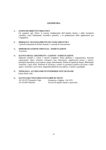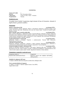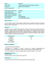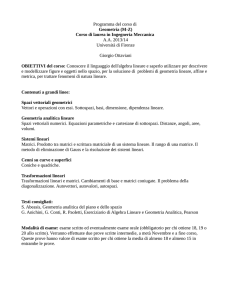 Modulo Geometria (6cfu) Docente del Corso Prof.ssa Vittoria Bonanzinga Programma a.a. 2012-2013 Sistemi lineari e matrici Sistemi di equazioni lineari Matrici Riduzione per righe di una matrice Risoluzione dei sistemi di equazioni lineari. Prodotto di matrici. Proprietà del prodotto. Matrici invertibili. Trasposta. Matrici simmetriche e antisimmetriche. Unicità dell’inversa con dimostrazione. Matrice inversa della matrice prodotto AB. Rango di una matrice. Determinanti. Teorema di Laplace. Calcolo dei determinanti e proprietà. Determinanti e matrici invertibili. Matrice aggiunta. Inversa di una matrice. Complementi ed applicazioni: Regola di Cramer, Teorema di Kronecher, Teorema di Rouchè-Capelli. Spazi vettoriali, Applicazioni lineari, Prodotti scalari Definizione ed esempi di spazi vettoriali. Spazio vettoriale dei vettori geometrici applicati in O nel piano e nello spazio. Spazi vettoriali finitamente generati. Legge di annullamento del prodotto negli spazi vettoriali (con dimostrazione). Operazioni con i sottospazi: somma, intersezione, unione e somma diretta. Sistemi di vettori linearmente indipendenti. Spazi vettoriali di dimensione finita. Generatori e basi di uno spazio vettoriale. Metodo del completamento e metodo degli scarti per la determinazione di una base. Basi canoniche. Componenti di un vettore e cambiamenti di base. Sottospazi affini. Esempi. Dimensione di un sottospazio affine. Applicazioni lineari : Definizioni ed esempi Nucleo ed Immagine di un’applicazione lineare Applicazioni lineari e matrici Composizione tra due applicazioni lineari Operatori lineari Matrici simili. Diagonalizzazione. Autovalori e autovettori. Teorema sulla lineare indipendenza degli autovettori (con dimostrazione) Polinomio caratteristico. Prodotti scalari. Angolo tra due vettori. Perpendicolarità e basi ortogonali Basi ortonormali. Riferimento affine nel piano e nello spazio. Geometria del piano cartesiano Riferimento cartesiano. Rette del piano cartesiano. Angolo tra due rette. Parametri direttori e coseni direttori. Intersezioni. Parallelismo e perpendicolarità. Fasci di rette. Circonferenze. Coniche. Classificazione affine delle coniche Forme canoniche. Riduzione a forma canonica delle coniche. Geometria dello spazio cartesiano Punti, rette e piani dello spazio cartesiano. Angolo tra due rette. Angolo tra due piani. Intersezioni. Condizioni di parallelismo e perpendicolarità. Rette sghembe. Fasci di piani Sfere Quadriche: definizione. Forme canoniche. Riduzione a forma canoniche delle quadriche. Testi di riferimento 1. G. Accascina – Monti, Geometria, Versione 0.81 26 settembre 2011, www.dmmm.uniroma1.it/accascinamonti/geogest www.dmmm.uniroma1.it/~valerio.monti/ambientesicurezza/ 2. F. Flamini, A. Verra ``Matrici e vettori. Corso di base di Geometria e Algebra Lineare."; Carocci Editore, Collana: LE SCIENZE , (2008) pp. 380. Pagina Web della casa Editrice e del Testo 3. S. Greco, P. Valabrega, “Lezioni di geometria, Algebra lineare” vol. I, Levrotto& Bella, Torino. 4. S. Greco, P. Valabrega, “Lezioni di geometria, Geometria Analitica,” vol. II, Levrotto& Bella, Torino. 5. M. Stoka, “Corso di Geometria” per le Facoltà di Ingegneria, CEDAM. 6. N. Chiarli, S. Greco, P. Valabrega, “100 Pagine di…Algebra lineare” Levrotto& Bella, Torino. 7. N. Chiarli, S. Greco, P. Valabrega, “100 Esercizi di…Algebra lineare” Levrotto& Bella, Torino. 8. M. Stoka, V. Pipitone, “Esercizi e problemi di Geometria”, CEDAM. 9. P.Bonacini, M. G. Cinquegrani, L. Marino, Algebra Lineare, esercizi svolti, Cavallotto edizioni. 10. P.Bonacini, M. G. Cinquegrani, L. Marino, Geometria Analitica, esercizi svolti, Cavallotto edizioni.